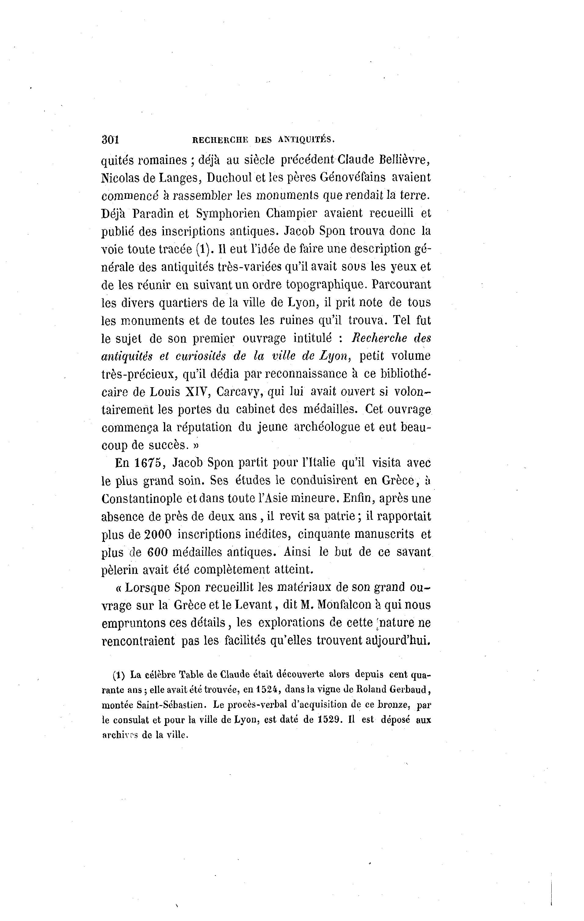301 RECHERCHE DES ANTIQUITÉS. quités romaines ; déjà au siècle précédent Claude Bellièvre, Nicolas de Langes, Duchoul et les pères Génovéfains avaient commencé à rassembler les monuments que rendait la ten^e. Déjà Paradin et Symphorien Cbampier avaient recueilli et publié des inscriptions antiques. Jacob Spon trouva donc la voie toute tracée (1). Il eut l'idée de faire une description gé- nérale des antiquités très-variées qu'il avait sous les yeux et de les réunir en suivant un ordre topographique. Parcourant les divers quartiers de la ville de Lyon, il prit note de tous les monuments et de toutes les ruines qu'il trouva. Tel fut le sujet de son premier ouvrage intitulé : Recherche des antiquités et curiosités de la ville de Lyon, petit volume très-précieux, qu'il dédia par reconnaissance à ce bibliothé- caire de Louis XIV, Carcavy, qui lui avait ouvert si volon- tairement les portes du cabinet des médailles. Cet ouvrage commença la réputation du jeune archéologue et eut beau- coup de succès. » En 1675, Jacob Spon partit pour l'Italie qu'il visita avec le plus grand soin. Ses études le conduisirent en Grèce, à Constantinople et dans toute l'Asie mineure. Enfin, après une absence de près de deux ans , il revit sa patrie ; il rapportait plus de 2000 inscriptions inédites, cinquante manuscrits et plus de 600 médailles antiques. Ainsi le but de ce savant pèlerin avait été complètement atteint. « Lorsque Spon recueillit les matériaux de son grand ou- vrage sur la Grèce et le Levant, dit M. Monfalcon a qui nous empruntons ces détails, les explorations de cette 'nature ne rencontraient pas les facilités qu'elles trouvent aujourd'hui. (1) La célèbre Table de Claude était découverte alors depuis cent qua- rante ans ; elle avait été trouvée, en 1524, dans la vigne de Roland Gerbaud, montée Saint-Séhastien. Le procès-verbal d'acquisition de ce bronze, par le consulat et pour la ville de Lyon, est daté de 1529. Il est déposé aux archives de la ville.