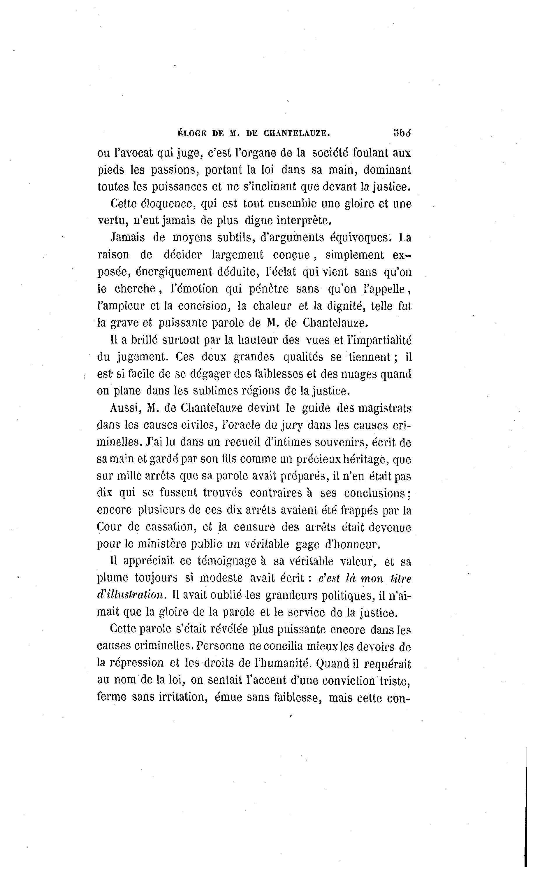 ÉLOGE DE M. DE CHANTELAUZE. 'âbà ou l'avocat qui juge, c'est l'organe de la société foulant aux pieds les passions, portant la loi dans sa main, dominant toutes les puissances et ne s'inclinaut que devant la justice. Cette éloquence, qui est tout ensemble une gloire et une vertu, n'eut jamais de plus digne interprète, Jamais de moyens subtils, d'arguments équivoques. La raison de décider largement conçue, simplement ex- posée, énergiquement déduite, l'éclat qui vient sans qu'on le cherche, l'émotion qui pénètre sans qu'on l'appelle, l'ampleur et la concision, la chaleur et la dignité, telle fut la grave et puissante parole de M. de Chantelauze. Il a brillé surtout par la hauteur des vues et l'impartialité du jugement. Ces deux grandes qualités se tiennent ; il est- si facile de se dégager des faiblesses et des nuages quand on plane dans les sublimes régions de la justice. Aussi, M. de Chantelauze devint le guide des magistrats dans les causes civiles, l'oracle du jury dans les causes cri- minelles. J'ai lu dans un recueil d'intimes souvenirs, écrit de sa main et gardé par son fils comme un précieux héritage, que sur mille arrêts que sa parole avait préparés, il n'en était pas dix qui se fussent trouvés contraires a ses conclusions ; encore plusieurs de ces dix arrêts avaient été frappés par la Cour de cassation, et la censure des arrêts était devenue pour le ministère public un véritable gage d'honneur. Il appréciait ce témoignage à sa véritable valeur, et sa plume toujours si modeste avait écrit : c'est là mon litre d'illustration. Il avait oublié les grandeurs politiques, il n'ai- mait que la gloire de la parole et le service de la justice. Cette parole s'était révélée plus puissante encore dans les causes criminelles. Personne ne concilia mieux les devoirs de la répression et les droits de l'humanité. Quand il requérait au nom de la loi, on sentait l'accent d'une conviction triste, ferme sans irritation, émue sans faiblesse, mais cette con-