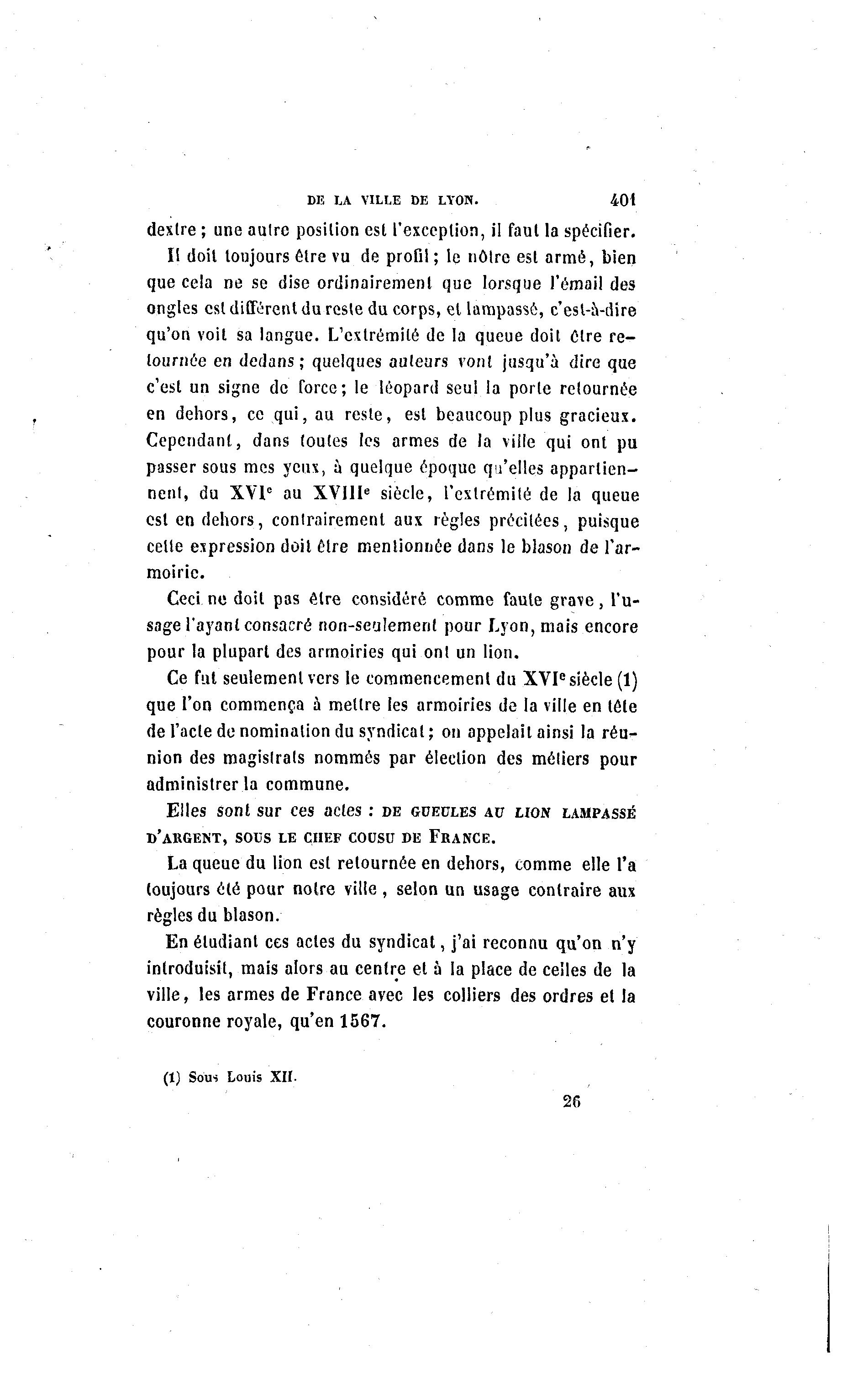 DE LA VILLE DE LYON. 401 dexlre ; une autre position est l'exception, il faut la spécifier. Il doit toujours être vu de profil ; le nôtre est armé, bien que cela ne se dise ordinairement que lorsque l'émail des ongles csl différent du reste du corps, et lampassô, c'est-à -dire qu'on voit sa langue. L'extrémité de la queue doit être re- tournée en dedans; quelques auteurs vont jusqu'à dire que c'est un signe de force; le léopard seul la porte retournée en dehors, ce qui, au reste, est beaucoup plus gracieux. Cependant, dans (outes les armes de la ville qui ont pu passer sous mes yeux, à quelque époque qu'elles appartien- nent, du XVIe au XVIIIe siècle, l'extrémité de la queue csl en dehors, conlrairement aux règles précitées, puisque cette expression doit être mentionnée dans le blason de l'ar- moirie. Ceci ne doit pas être considéré comme faute grave, l'u- sage l'ayant consacré non-seulement pour Lyon, mais encore pour la plupart des armoiries qui ont un lion. Ce fut seulement vers le commencement du XVIe siècle (1) que l'on commença à mettre les armoiries de la ville en tôle de l'acte do nomination du syndicat ; on appelait ainsi la réu- nion des magislrals nommés par élection des méliers pour administrer la commune. Elles sont sur ces actes : DE GUEULES AU LION LAMPASSÉ D'ARGENT, SOUS LE CHEF COUSU DE FRANCE. La queue du lion est retournée en dehors, comme elle l'a toujours été pour notre ville , selon un usage contraire aux règles du blason. En étudiant ces actes du syndicat, j'ai reconnu qu'on n'y introduisit, mais alors au centre et à la place de celles de la ville, les armes de France avec les colliers des ordres et la couronne royale, qu'en 1567. (1) Sous Louis XII. 26