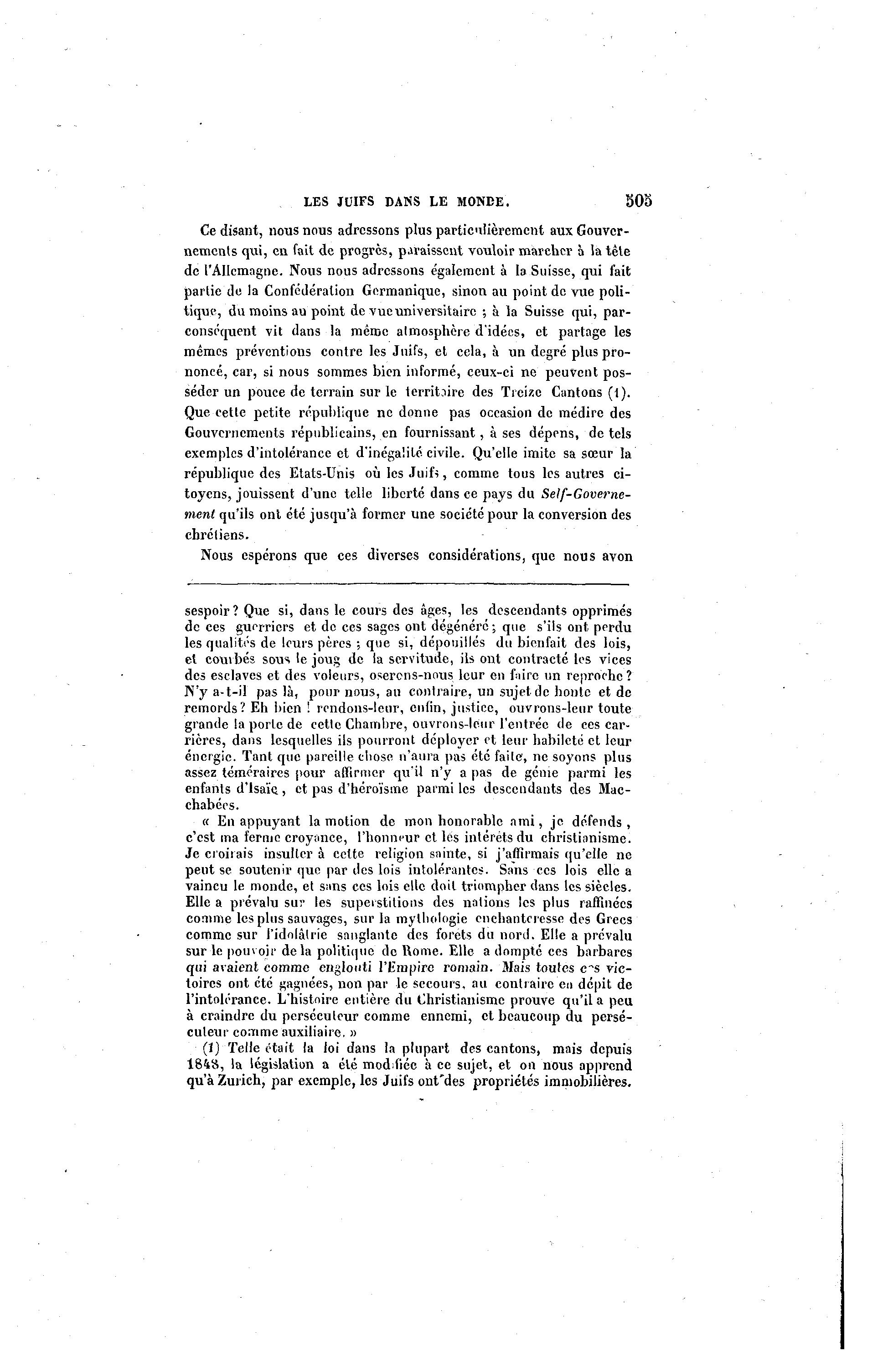 LES JUIFS DANS LE MONBE. SOo Ce disant, nous nous adressons plus particulièrement aux Gouver- nements qui, en fait de progrès, paraissent vouloir marcher à la tête de l'Allemagne. Nous nous adressons également à la Suisse, qui fait partie de la Confédération Germanique, sinon au point de vue poli- tique, du moins au point de vue universitaire ; à la Suisse qui, par- conséqiient vit dans la même atmosphère d'idées, et partage les mêmes préventions contre les Juifs, et cela, à un degré plus pro- noncé, car, si nous sommes bien informé, ceux-ci ne peuvent pos- séder un pouce de terrain sur le territoire des Treize Cantons (1). Que cette petite république ne donne pas occasion de médire des Gouvernements républicains, en fournissant, à ses dépens, de tels exemples d'intolérance et d'inégalité civile. Qu'elle imite sa sœur la république des Etats-Unis où les Juifs, comme tous les autres ci- toyens, jouissent d'une telle liberté dans ce pays du Self-Governe- ment qu'ils ont été jusqu'à former une société pour la conversion des chrétiens. Nous espérons que ces diverses considérations, que nous avon sespoir? Que si, dans le cours des âges, les descendants opprimés de ces guerriers et de ces sages ont dégénéré ; que s'ils ont perdu les qualités de leurs pères ; que si, dépouillés du bienfait des lois, et courbés sous le joug de la servitude, ils ont contracté les vices des esclaves et des voleurs, oserons-nous leur en faire un reproche ? N'y a-t-il pas là , pour nous, au contraire, un sujet de honte et de remords? Eh bien ! rendons-leur, enfin, justice, ouvrons-leur toute grande la porte de cette Chambre, ouvrons-leur l'entrée de ces car- rières, dans lesquelles ils pourront déployer et leur habileté et leur énergie. Tant que pareille chose n'aura pas été faite, ne soyons plus assez téméraires pour affirmer qu'il n'y a pas de génie parmi les enfants d'isaïc, et pas d'héroïsme parmi les descendants des Mac- chabées. « En appuyant la motion de mon honorable ami, je défends, c'est ma ferme croyance, l'honneur et lés intérêts du christianisme. Je croirais insulter à cette religion sainte, si j'affirmais qu'elle ne peut se soutenir que par des lois intolérantes. Sans ces lois elle a vaincu le monde, et sans ces lois elle doit triompher dans les siècles. Elle a prévalu sur les superstitions des nations les plus raffinées comme les plus sauvages, sur la mythologie enchanteresse des Grecs comme sur l'idolâtrie sanglante des forets du nord. Elle a prévalu sur le pouvoir delà politique do Rome. Elle a dompté ces barbares qui avaient comme englouti l'Empire romain. Mais toutes c~s vic- toires ont été gagnées, non par le secours, au contraire en dépit de l'intolérance. L'histoire entière du Christianisme prouve qu'il a peu à craindre du persécuteur comme ennemi, et beaucoup du persé- cuteur comme auxiliaire. » (1) Telle était la loi dans la plupart des cantons, mais depuis 1848, la législation a été modifiée à ce sujet, et on nous apprend qu'à Zurich, par exemple, les Juifs ont "des propriétés immobilières.