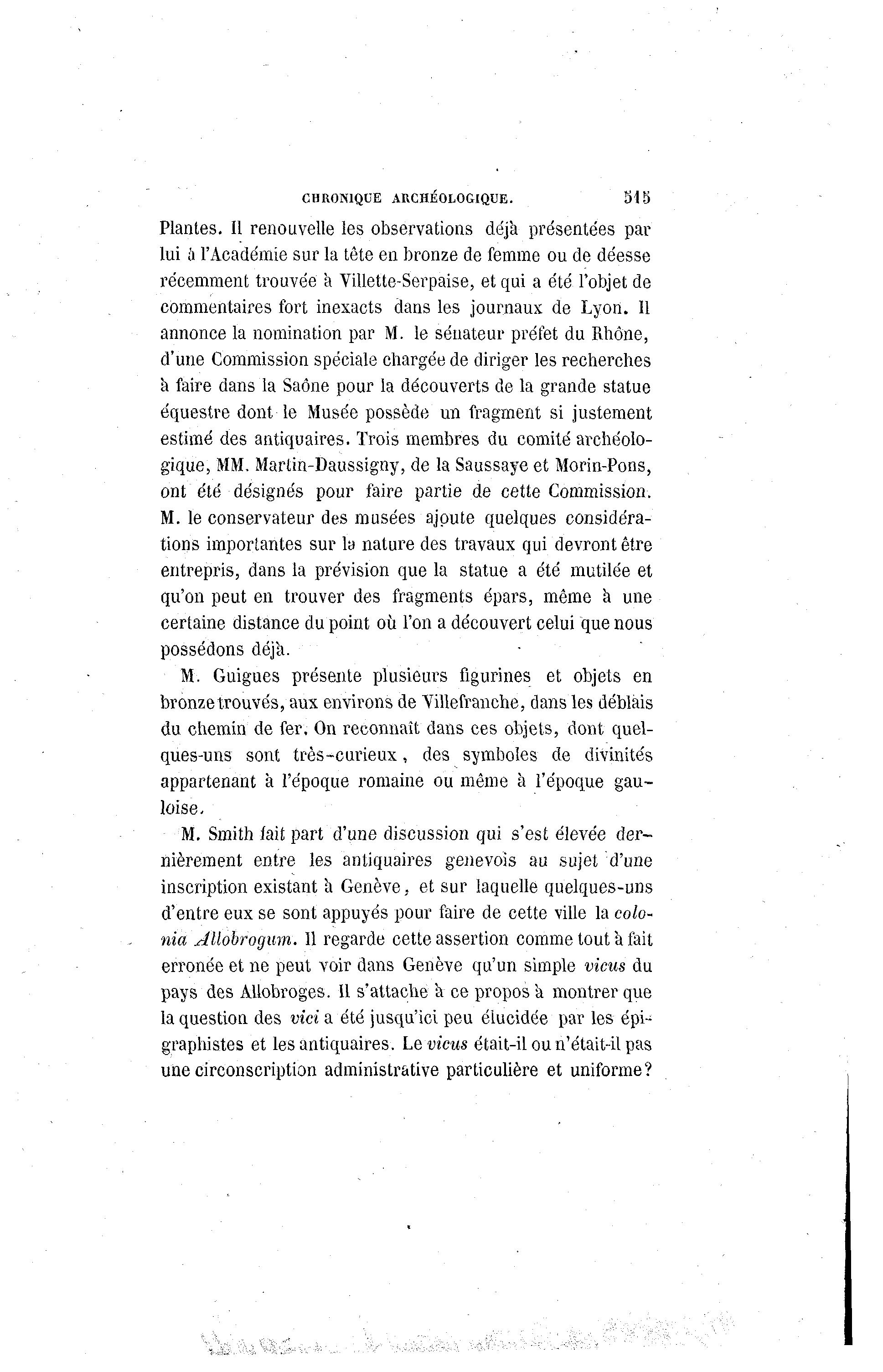 CHRONIQUE ARCHÉOLOGIQUE. 515 Plantes. Il renouvelle les observations déjà présentées par lui à l'Académie sur la tête en bronze de femme ou de déesse récemment trouvée a Villette-Serpaise, et qui a été l'objet de commentaires fort inexacts dans les journaux de Lyon. 11 annonce la nomination par M. le sénateur préfet du Rhône, d'une Commission spéciale chargée de diriger les recherches à faire dans la Saône pour la découverts de la grande statue équestre dont le Musée possède un fragment si justement estimé des antiquaires. Trois membres du comité archéolo- gique, MM. Martin-Daussigny, de la Saussaye et Morin-Pons, ont été désignés pour faire partie de cette Commission. M. le conservateur des musées ajoute quelques considéra- tions importantes sur la nature des travaux qui devront être entrepris, dans la prévision que la statue a été mutilée et qu'on peut en trouver des fragments épars, même à une certaine distance du point où l'on a découvert celui que nous possédons déjà . M. Guigues présente plusieurs figurines et objets en bronze trouvés, aux environs de Yillefranche, dans les déblais du chemin de fer. On reconnaît dans ces objets, dont quel- ques-uns sont très-curieux, des symboles de divinités appartenant à l'époque romaine ou même à l'époque gau- loise. M. Smith lait part d'une discussion qui s'est élevée der- nièrement entre les antiquaires genevois au sujet d'une inscription existant a Genève, et sur laquelle quelques-uns d'entre eux se sont appuyés pour faire de cette ville la colo- nia AUôbrogum. Il regarde cette assertion comme tout à fait erronée et ne peut voir dans Genève qu'un simple vicus du pays des AUobroges. Il s'attache 'a ce propos 'a montrer que la question des vici a été jusqu'ici peu élucidée par les épi- graphistes et les antiquaires. Levions était-il ou n'était-il pas une circonscription administrative particulière et uniforme?