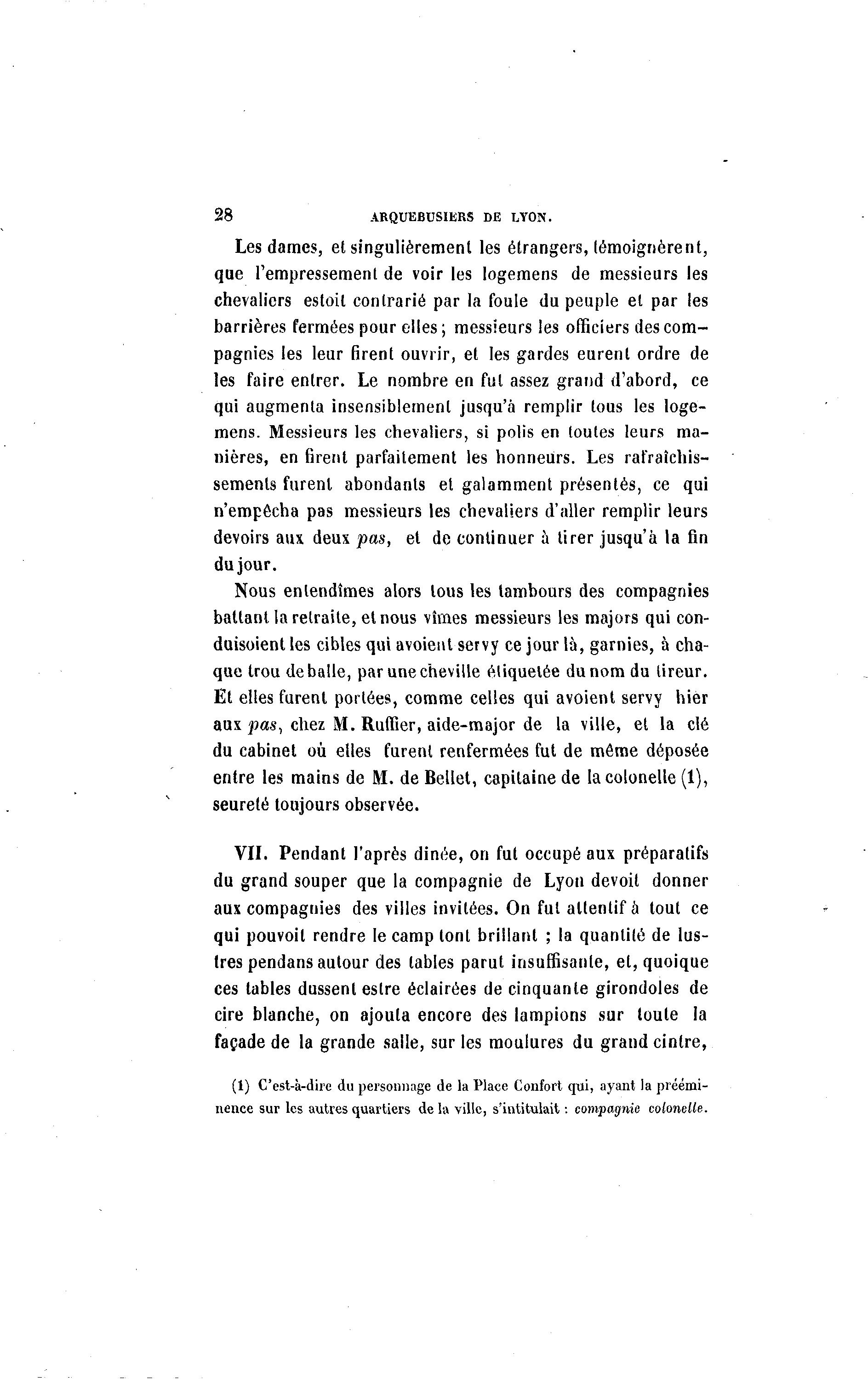 28 ARQUEBUSIERS DE LYON. Les dames, et singulièrement les étrangers, témoignèrent, que l'empressement de voir les logemens de messieurs les chevaliers estoil contrarié par la foule du peuple et par les barrières fermées pour elles ; messieurs les officiers des com- pagnies les leur firent ouvrir, et les gardes eurent ordre de les faire entrer. Le nombre en fut assez grand d'abord, ce qui augmenta insensiblement jusqu'à remplir tous les loge- mens. Messieurs les chevaliers, si polis en toutes leurs ma- nières, en firent parfaitement les honneurs. Les rafraîchis- sements furent abondants et galamment présentés, ce qui n'empêcha pas messieurs les chevaliers d'aller remplir leurs devoirs aux deux pas, et de continuer à tirer jusqu'à la fin du jour. Nous entendîmes alors tous les tambours des compagnies battant la retraite, et nous vîmes messieurs les majors qui con- duisoient les cibles qui avoient servy ce jour là , garnies, à cha- que trou déballe, par une cheville étiquetée du nom du tireur. Et elles furent portées, comme celles qui avoient servy hier aux pas, chez M. Ruffier, aide-major de la ville, et la clé du cabinet où elles furent renfermées fut de môme déposée entre les mains de M. de Bellet, capitaine de la colonelle (1), seureté toujours observée. VII. Pendant l'après dinée, on fut occupé aux préparatifs du grand souper que la compagnie de Lyon devoit donner aux compagnies des villes invitées. On fui attentif à tout ce qui pouvoit rendre le camp lonl brillant ; la quantité de lus- Ires pendans autour des tables parut insuffisante, et, quoique ces tables dussent eslre éclairées de cinquante girondoles de cire blanche, on ajouta encore des lampions sur toute la façade de la grande salle, sur les moulures du grand cintre, (1) C'est-à -dire du personnage de la Place Confort qui, ayant la préémi- nence sur les autres quartiers de la ville, s'intitulait : compagnie colonelle.