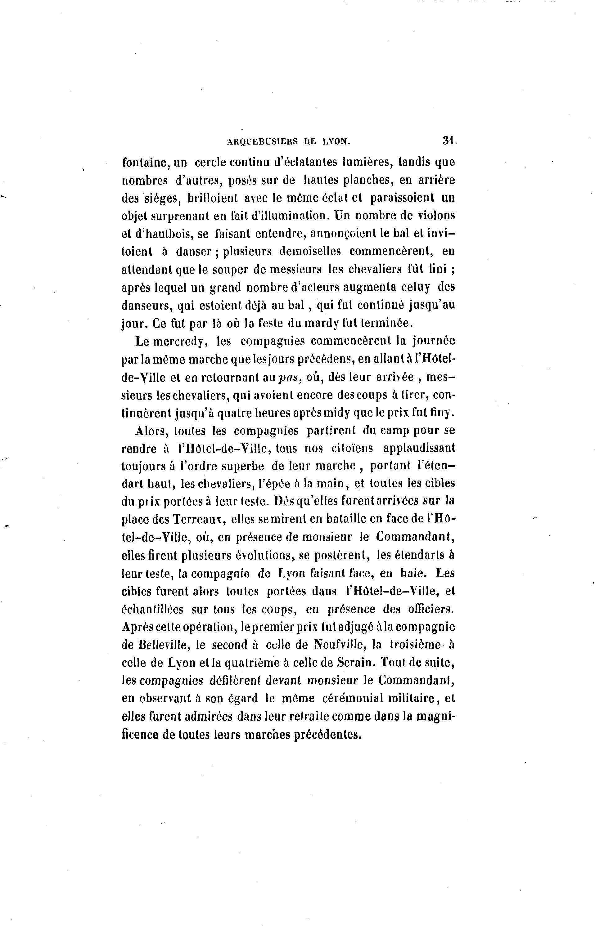 ARQUEBUSIERS DE LYON. 34 fontaine, un cercle continu d'éclatantes lumières, tandis que nombres d'autres, posés sur de hautes planches, en arrière des sièges, brilloienl avec le même éclut et paraissoient un objet surprenant en fait d'illumination. Un nombre de violons et d'hautbois, se faisant entendre, annonçoient le bal et invi- toient à danser ; plusieurs demoiselles commencèrent, en attendant que le souper de messieurs les chevaliers fût fini ; après lequel un grand nombre d'acteurs augmenta celuy des danseurs, qui estoienl déjà au bal , qui fut continué jusqu'au jour. Ce fut par là où la feste dumardy fut terminée. Le mercredy, les compagnies commencèrent la journée parla même marche que les jours précédent, en allant à l'Hôtel- de-Ville et en retournant au pas, où, dès leur arrivée , mes- sieurs les chevaliers, qui avoient encore des coups à tirer, con- tinuèrent jusqu'à quatre heures après midy que le prix fut finy. Alors, toutes les compagnies partirent du camp pour se rendre à l'Hôtel-de-Ville, tous nos ciioïens applaudissant toujours â l'ordre superbe de leur marche , portant l'éten- dart haut, les chevaliers, l'épée à la main, et toutes les cibles du prix portées à leur teste. Dès qu'elles furent arrivées sur la place des Terreaux, elles se mirent en bataille en face de l'Hô- lel-de-Ville, où, en présence de monsieur le Commandant, elles firent plusieurs évolutions,, se postèrent, les élendarts à leur leste, la compagnie de Lyon faisant face, en haie. Les cibles furent alors toutes portées dans l'Hôlel-de—Ville, et échantillées sur tous les coups, en présence des officiers. Après cette opération, Iepremierprix fuladjugéà la compagnie de Belleville, le second à celle de Neufville, la troisième à celle de Lyon et la quatrième à celle de Serain. Tout de suite, les compagnies défilèrent devant monsieur le Commandanl, en observant à son égard le même cérémonial militaire, et elles furent admirées dans leur retraite comme dans la magni- ficence de toutes leurs marches précédentes.