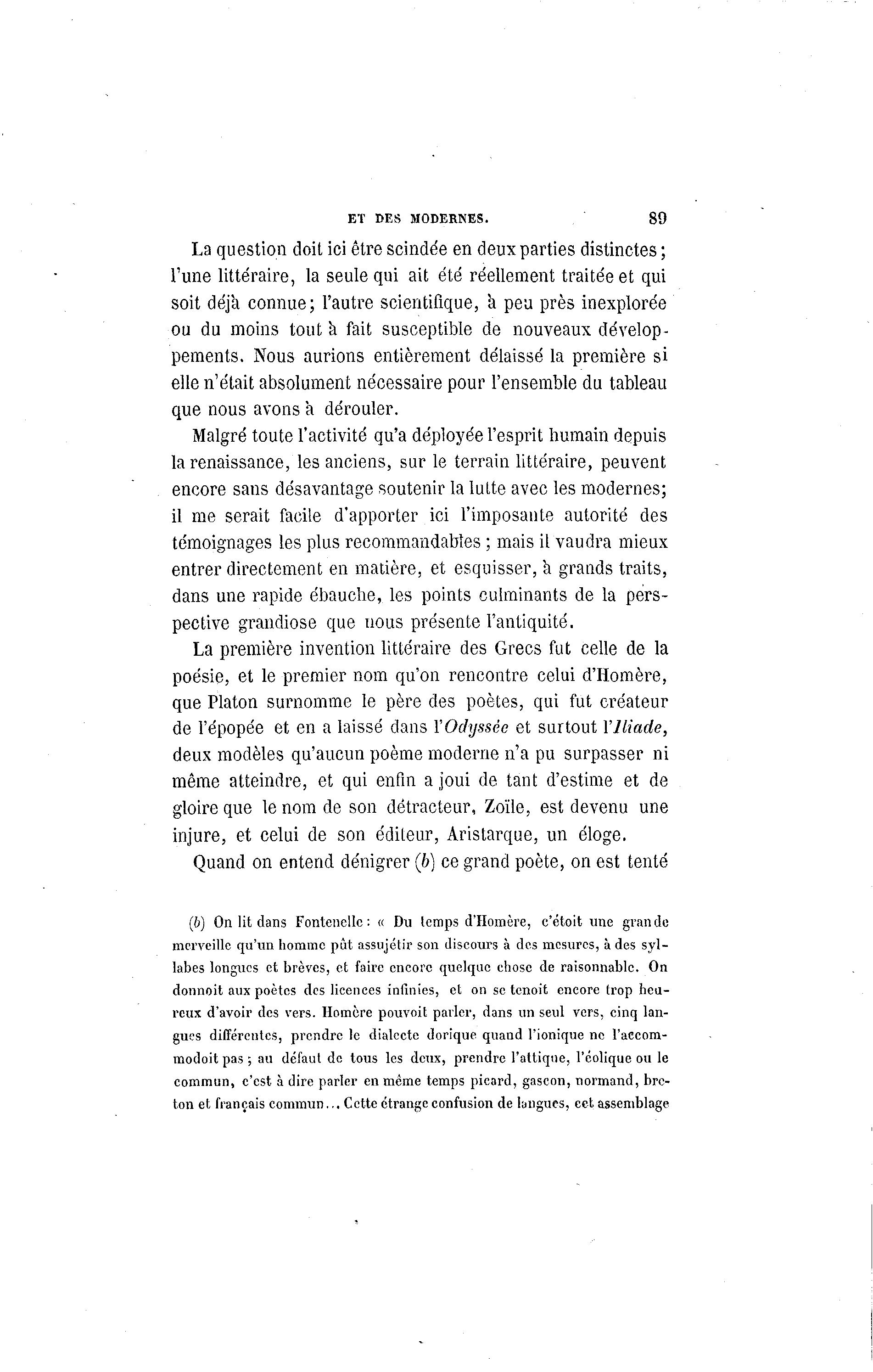 ET DES MODERNES. 89 La question doit ici être scindée en deux parties distinctes ; Tune littéraire, la seule qui ait été réellement traitée et qui soit déjà connue; l'autre scientifique, à peu près inexplorée ou du moins tout à fait susceptible de nouveaux dévelop- pements. Nous aurions entièrement délaissé la première si elle n'était absolument nécessaire pour l'ensemble du tableau que nous avons a dérouler. Malgré toute l'activité qu'a déployée l'esprit humain depuis la renaissance, les anciens, sur le terrain littéraire, peuvent encore sans désavantage soutenir la lutte avec les modernes; il me serait facile d'apporter ici l'imposante autorité des témoignages les plus recommandabîes ; mais il vaudra mieux entrer directement en matière, et esquisser, à grands traits, dans une rapide ébauche, les points culminants de la pers- pective grandiose que nous présente l'antiquité. La première invention littéraire des Grecs fut celle de la poésie, et le premier nom qu'on rencontre celui d'Homère, que Platon surnomme le père des poètes, qui fut créateur de l'épopée et en a laissé dans Y Odyssée et surtout l'Iliade, deux modèles qu'aucun poème moderne n'a pu surpasser ni même atteindre, et qui enfin a joui de tant d'estime et de gloire que le nom de son détracteur, Zoïle, est devenu une injure, et celui de son éditeur, Aristarque, un éloge. Quand on entend dénigrer (b) ce grand poète, on est tenté (b) On lit dans Fontenellc: « Du temps d'Homère, c'étoit une grande merveille qu'un homme pût assujétir son discours à des mesures, à des syl- labes longues et brèves, et faire encore quelque chose de raisonnable. On donnoit aux poètes des licences infinies, et on se tenoit encore trop heu- reux d'avoir des vers. Homère pouvoit parler, dans un seul vers, cinq lan- gues différentes, prendre le dialecte dorique quand l'ionique ne l'accom- modoit pas ; au défaut de tous les deux, prendre l'attiqne, l'éolique ou le commun, c'est à dire parler en même temps picard, gascon, normand, bre- ton et français commun... Cette étrange confusion de langues, cet assemblage