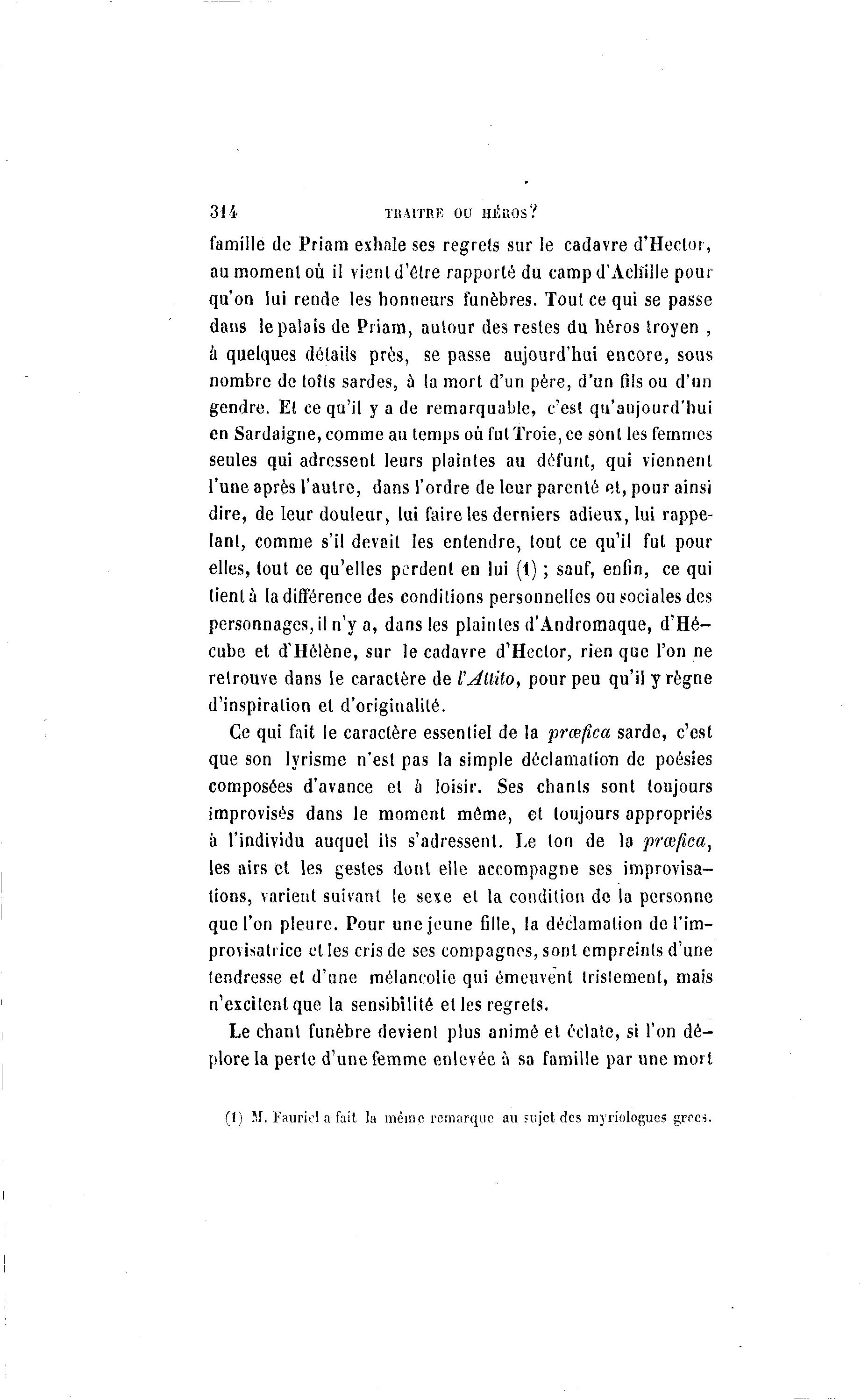 314 THAITRE ou nÉaos? famille de Priam exhale ses regrets sur le cadavre d'Hector, au moment où il vient d'être rapporté du camp d'Achille pour qu'on lui rende les honneurs funèbres. Tout ce qui se passe dans le palais de Priam, autour des restes du héros iroyen , à quelques détails près, se passe aujourd'hui encore, sous nombre de toîls sardes, à la mort d'un père, d'un fils ou d'un gendre. Et ce qu'il y a de remarquable, c'est qu'aujourd'hui en Sardaigne, comme au temps où fui Troie, ce sont les femmes seules qui adressent leurs plaintes au défunt, qui viennent l'une après l'autre, dans l'ordre de leur parenté et, pour ainsi dire, de leur douleur, lui faire les derniers adieux, lui rappe- lant, comme s'il devait les entendre, tout ce qu'il fut pour elles, tout ce qu'elles perdent en lui (1) ; sauf, enfin, ce qui lient à la différence des conditions personnelles ou sociales des personnages, il n'y a, dans les plaintes d'Androraaque, d'Hé- cube et d'Hélène, sur le cadavre d'Hector, rien que l'on ne retrouve dans le caractère de ïAiiiio, pour peu qu'il y règne d'inspiration et d'originalité. Ce qui fait le caractère essentiel de la prœfîca sarde, c'est que son lyrisme n'est pas la simple déclamation de poésies composées d'avance et â loisir. Ses chants sont toujours improvisés dans le moment même, et toujours appropriés à l'individu auquel ils s'adressent. Le ton de la prœfîca, les airs et les gestes dont elle accompagne ses improvisa- tions, varient suivant le sexe et la condition de la personne que l'on pleure. Pour une jeune fille, la déclamation de l'im- provisatrice cl les cris de ses compagnes, sont empreints d'une tendresse et d'une mélancolie qui émeuvent tristement, mais n'excitent que la sensibilité et les regrets. Le chant funèbre devient plus animé et éclate, si l'on dé- plore la perle d'une femme enlevée à sa famille par une mort (1) M. Fauriel a fait la même remarque au -ujet des myriologues grecs.