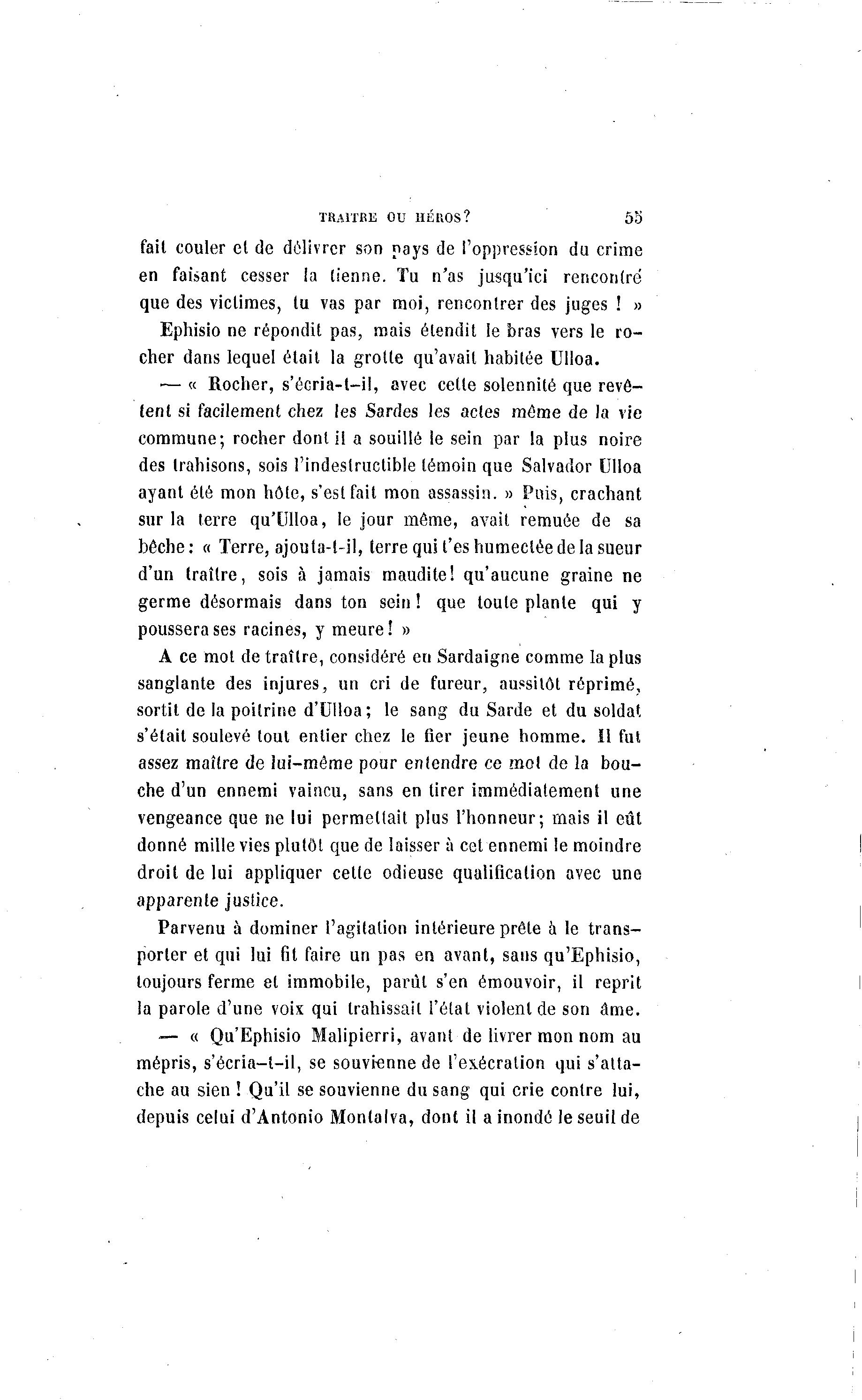 TRAITEE OU HÉROS? 55 fait couler et de délivrer son pays de l'oppression du crime en faisant cesser la tienne. Tu n'as jusqu'ici rencontré que des victimes, tu vas par moi, rencontrer des juges ! » Ephisio ne répondit pas, mais étendit le bras vers le ro- cher dans lequel était la grotte qu'avait habitée Ulloa. •— « Rocher, s'écria-t-il, avec cette solennité que revê- tent si facilement chez les Sardes les actes môme de la vie commune; rocher dont ii a souillé le sein par la plus noire des trahisons, sois l'indestructible témoin que Salvador Ulloa ayant été mon hôte, s'est fait mon assassin. » Puis, crachant sur la terre qu'Ulloa, le jour môme, avait remuée de sa bêche : o Terre, ajoula-t-il, terre qui l'es humectée de la sueur d'un traître, sois à jamais maudite! qu'aucune graine ne germe désormais dans ton sein ! que toute plante qui y poussera ses racines, y meure! » A ce mot de traître, considéré eu Sardaigne comme la plus sanglante des injures, un cri de fureur, aussitôt réprimé, sortit de la poitrine d'Ulloa; le sang du Sarde et du soldat s'était soulevé tout entier chez le fier jeune homme. Il fut assez maître de lui-même pour entendre ce mot de la bou- che d'un ennemi vaincu, sans en tirer immédiatement une vengeance que ne lui permettait plus l'honneur; mais il eût donné mille vies plutôt que de laisser à cet ennemi le moindre droit de lui appliquer cette odieuse qualification avec une apparente justice. Parvenu à dominer l'agitation intérieure prête à le trans- porter et qui lui fit faire un pas en avant, sans qu'Ephisio, toujours ferme et immobile, parût s'en émouvoir, il reprit la parole d'une voix qui trahissait l'état violent de son âme. — « Qu'Ephisio Malipierri, avant de livrer mon nom au mépris, s'écria-t-il, se souvienne de l'es.écration qui s'atta- che au sien ! Qu'il se souvienne du sang qui crie contre lui, depuis celui d'Antonio Montalva, dont il a inondé le seuil de