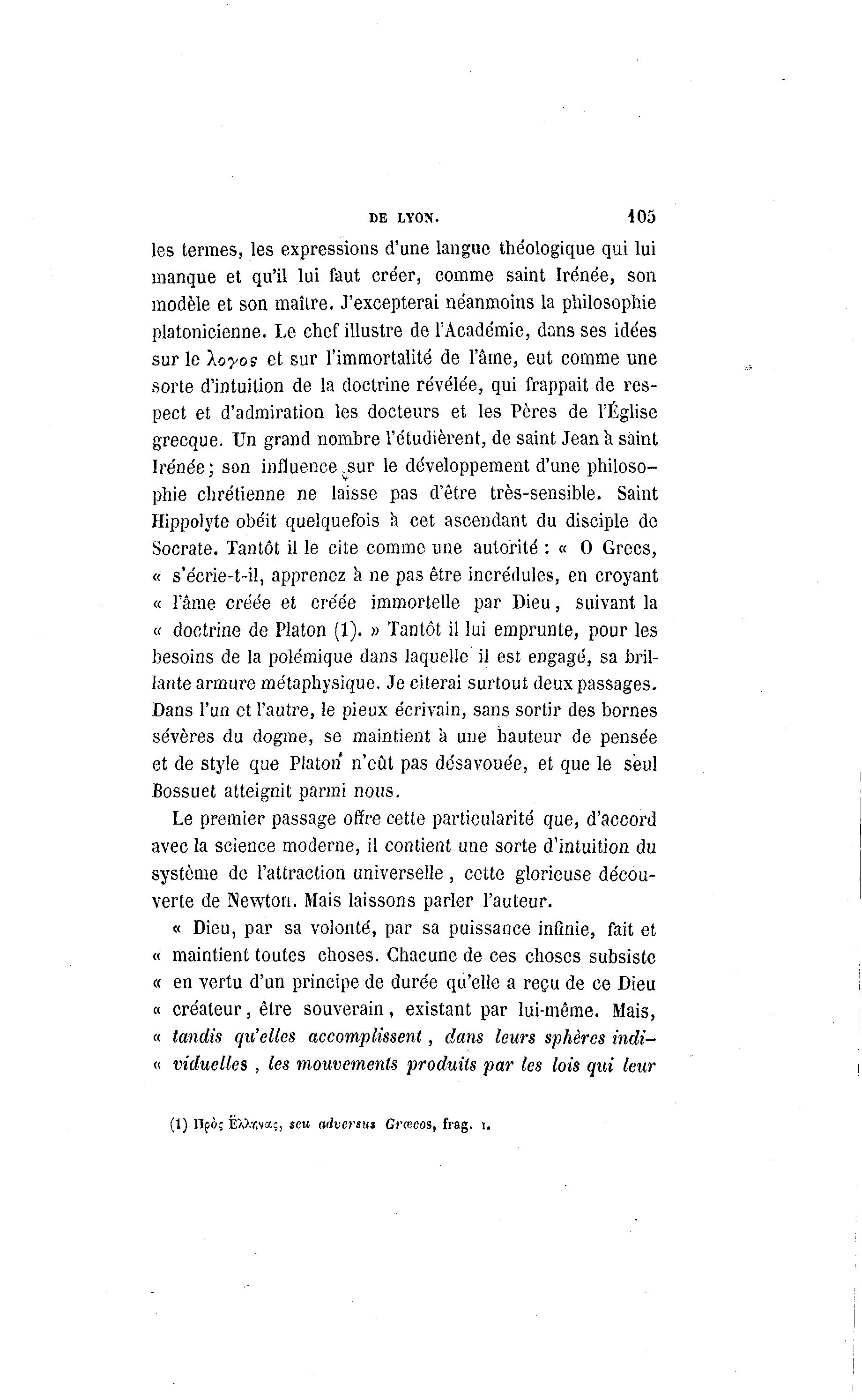 DE LYON. 405 les termes, les expressions d'une langue théologique qui lui manque et qu'il lui faut créer, comme saint Irénée, son modèle et son maître. J'excepterai néanmoins la philosophie platonicienne. Le chef illustre de l'Académie, dans ses idées sur le loyos et sur l'immortalité de l'âme, eut comme une sorte d'intuition de la doctrine révélée, qui frappait de res- pect et d'admiration les docteurs et les Pères de l'Église grecque. Un grand nombre l'étudierent, de saint Jean a saint Irénée ; son influence .sur le développement d'une philoso- phie chrétienne ne laisse pas d'être très-sensible. Saint Hippolyte obéit quelquefois a cet ascendant du disciple de Socrate. Tantôt il le cite comme une autorité : « 0 Grecs, « s'écrie-t-il, apprenez a ne pas être incrédules, en croyant « l'âme créée et créée immortelle par Dieu, suivant la « doctrine de Platon (1). » Tantôt il lui emprunte, pour les besoins de la polémique dans laquelle il est engagé, sa bril- lante armure métaphysique. Je citerai surtout deux passages. Dans l'un et l'autre, le pieux écrivain, sans sortir des bornes sévères du dogme, se maintient à une hauteur de pensée et de style que Platon n'eût pas désavouée, et que le seul Bossuet atteignit parmi nous. Le premier passage offre cette particularité que, d'accord avec la science moderne, il contient une sorte d'intuition du système de l'attraction universelle, cette glorieuse décou- verte de Newton. Mais laissons parler l'auteur. « Dieu, par sa volonté, par sa puissance infinie, fait et « maintient toutes choses. Chacune de ces choses subsiste « en vertu d'un principe de durée qu'elle a reçu de ce Dieu « créateur, être souverain, existant par lui-même. Mais, « tandis qu'elles accomplissent, dans leurs sphères indi- « viduelles , les mouvements produits par les lois qui leur (1) npè; ËX>.ïiva;, sets advenu» Grœcos, frag. i.