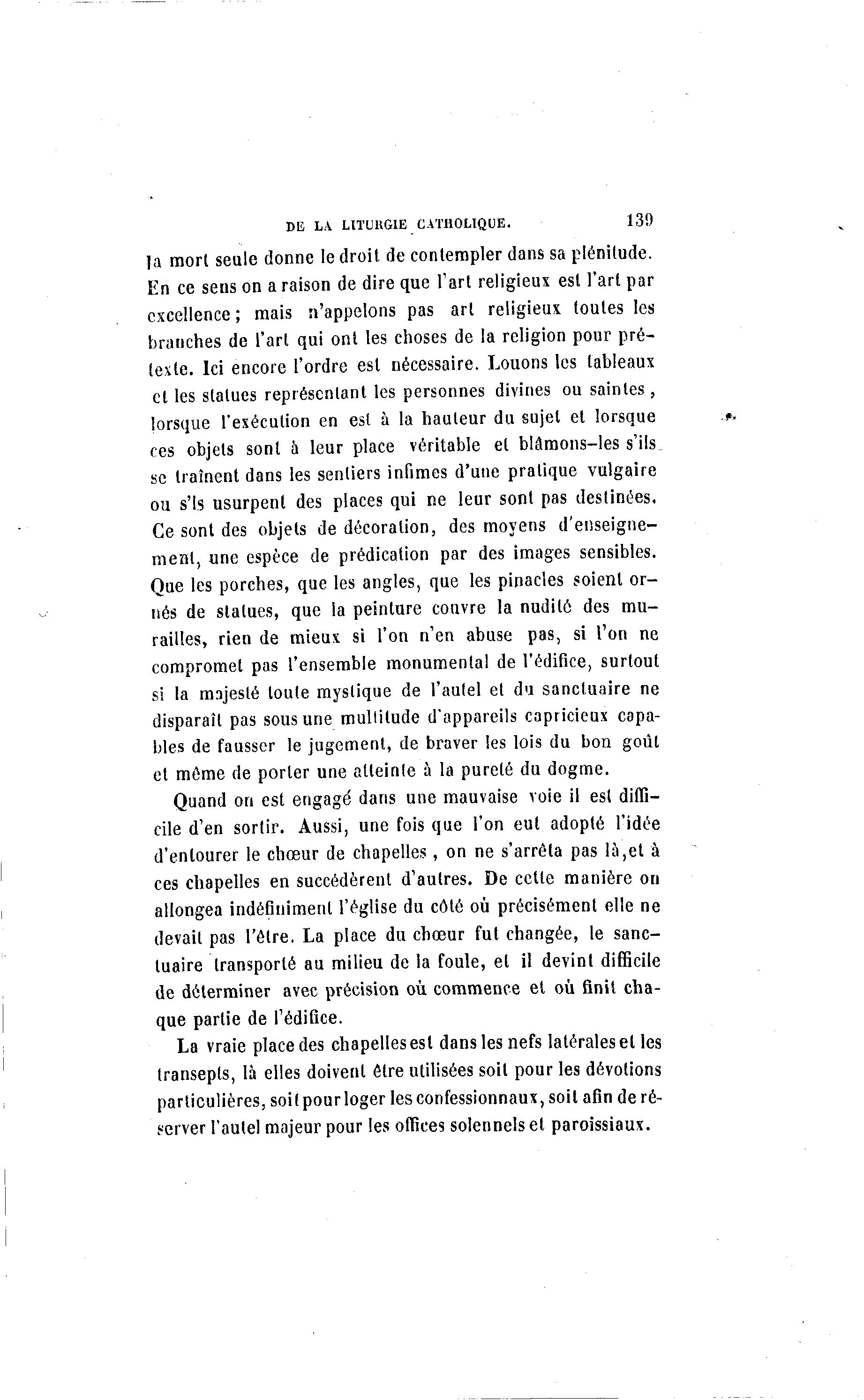DE LA LITURGIE CATHOLIQUE. 139 la mort seule donne le droit de contempler dans sa plénitude. En ce sens on a raison de dire que l'art religieux est l'art par excellence ; mais n'appelons pas arl religieux toutes les branches de l'art qui ont les choses de la religion pour pré- texte. Ici encore l'ordre est nécessaire. Louons les tableaux et les statues représentant les personnes divines ou saintes, lorsque l'exécution en est à la hauteur du sujet et lorsque ces objets sont à leur place véritable et blâmons-les s'ils se traînent dans les sentiers infimes d'une pratique vulgaire ou s'Is usurpent des places qui ne leur sont pas destinées. Ce sont des objets de décoration, des moyens d'enseigne- ment, une espèce de prédication par des images sensibles. Que les porches, que les angles, que les pinacles soient or- nés de statues, que la peinture couvre la nudité des mu- railles, rien de mieux si l'on n'en abuse pas, si l'on ne compromet pas l'ensemble monumental de l'édifice, surtout si la majesté toute mystique de l'autel et du sanctuaire ne disparaît pas sous une mullilude d'appareils capricieux capa- bles de fausser le jugement, de braver les lois du bon goût et môme de porter une atteinte à la pureté du dogme. Quand on est engagé dans une mauvaise voie il est diffi- cile d'en sortir. Aussi, une fois que l'on eut adopté l'idée d'entourer le chœur de chapelles, on ne s'arrêta pas là ,et à ces chapelles en succédèrent d'autres. De cette manière on allongea indéfiniment l'église du côté où précisément elle ne devait pas l'être. La place du chœur fut changée, le sanc- tuaire transporté au milieu de la foule, et il devint difficile de déterminer avec précision où commence et où finit cha- que partie de l'édifice. La vraie place des chapelles est dans les nefs latérales et les transepts, là elles doivent être utilisées soit pour les dévotions particulières, soit pour loger les confessionnaux, soit afin de ré- server l'autel majeur pour les offices solennels et paroissiaux.