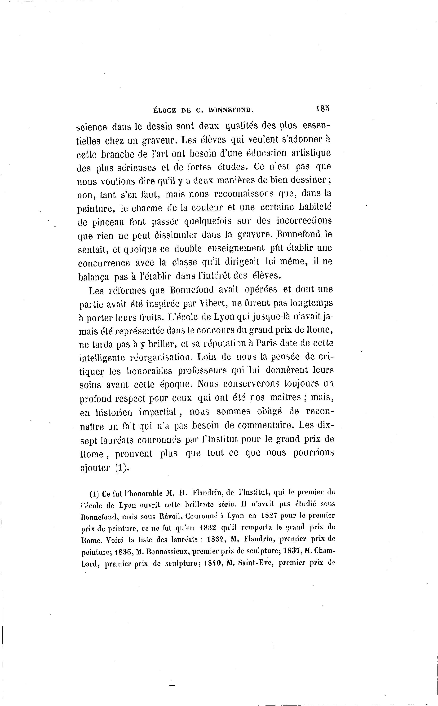 ÉLOGE DE C. BONNEFOND. 185 science dans le dessin sont deux qualités des plus essen- tielles chez un graveur. Les élèves qui veulent s'adonner h cette branche de l'art ont besoin d'une éducation artistique des plus sérieuses et de fortes études. Ce n'est pas que nous voulions dire qu'il y a deux manières de bien dessiner ; non, tant s'en faut, mais nous reconnaissons que, dans la peinture, le charme de la couleur et une certaine habileté de pinceau font passer quelquefois sur des incorrections que rien ne peut dissimuler dans la gravure. Bonnefond le sentait, et quoique ce double enseignement pût établir une concurrence avec la classe qu'il dirigeait lui-même, il ne balança pas a l'établir dans l'intérêt des élèves. Les réformes que Bonnefond avait opérées et dont une partie avait été inspirée par Vibert, ne furent pas longtemps à porter leurs fruits. L'école de Lyon qui jusque-là n'avait ja- mais été représentée dans le concours du grand prix de Rome, ne tarda pas à y briller, et sa réputation a Paris date de cette intelligente réorganisation. Loin de nous la pensée de cri- tiquer les honorables professeurs qui lui donnèrent leurs soins avant cette époque. Nous conserverons toujours un profond respect pour ceux qui ont été nos maîtres ; mais, en historien impartial, nous sommes obligé de recon- naître un fait qui n'a pas besoin de commentaire. Les dix- sept lauréats couronnés par l'Institut pour le grand prix de Rome, prouvent plus que tout ce que nous pourrions ajouter (1). (1) Ce fut l'honorable M. H. Flandrin, de l'Institut, qui le premier de l'école de Lyon ouvrit cette brillante série. Il n'avait pas étudié sous Bonnefond, mais sous Révoil. Couronné à Lyon en 1827 pour lo premier prix de peinture, ce ne fut qu'en 1832 qu'il remporta le grand prix de Rome. Voici la liste des lauréats : 1832, M. Flandrin, premier prix de peinture; 1836, M. Bonnassieux, premier prix de sculpture; 1837, M. Cham- bard, premier prix de sculpture; 1840, M, Saint-Eve, premier prix de