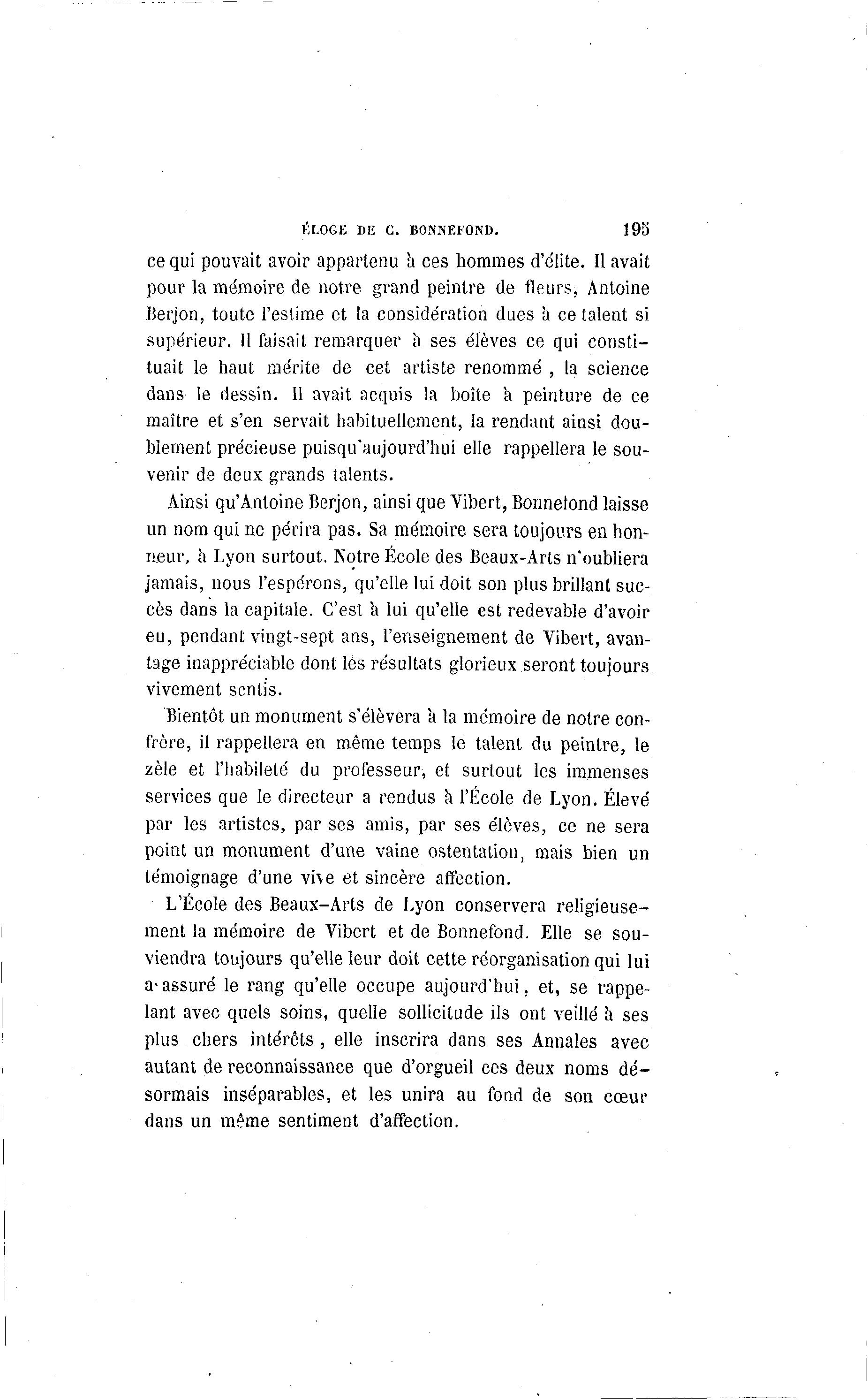 ÉLOGE DE C. BONNEFOND. 193 ce qui pouvait avoir appartenu a ces hommes d'e'lite. Il avait pour la mémoire de notre grand peintre de fleurs, Antoine Berjon, toute l'estime et la considération dues a ce talent si supérieur. Il faisait remarquer à ses élèves ce qui consti- tuait le haut mérite de cet artiste renommé , la science dans le dessin. Il avait acquis la boîte a peinture de ce maître et s'en servait habituellement, la rendant ainsi dou- blement précieuse puisqu'aujourd'hui elle rappellera le sou- venir de deux grands talents. Ainsi qu'Antoine Berjon, ainsi que Yibert, Bonnetond laisse un nom qui ne périra pas. Sa mémoire sera toujours en hon- neur, h Lyon surtout. Notre École des Beaux-Arts n'oubliera jamais, nous l'espérons, qu'elle lui doit son plus brillant suc- cès dans la capitale. C'est a lui qu'elle est redevable d'avoir eu, pendant vingt-sept ans, l'enseignement de Vibert, avan- tage inappréciable dont lès résultats glorieux seront toujours vivement sentis. Bientôt un monument s'élèvera a la mémoire de notre con- frère, il rappellera en même temps le talent du peintre, le zèle et l'habileté du professeur, et surtout les immenses services que le directeur a rendus a l'École de Lyon. Élevé par les artistes, par ses amis, par ses élèves, ce ne sera point un monument d'une vaine ostentation, mais bien un témoignage d'une vive et sincère affection. L'École des Beaux-Arts de Lyon conservera religieuse- ment la mémoire de Vibert et de Bonnefond. Elle se sou- viendra toujours qu'elle leur doit cette réorganisation qui lui a- assuré le rang qu'elle occupe aujourd'hui, et, se rappe- lant avec quels soins, quelle sollicitude ils ont veillé a ses plus chers intérêts , elle inscrira dans ses Annales avec autant de reconnaissance que d'orgueil ces deux noms dé- sormais inséparables, et les unira au foud de son cœur dans un même sentiment d'affection.