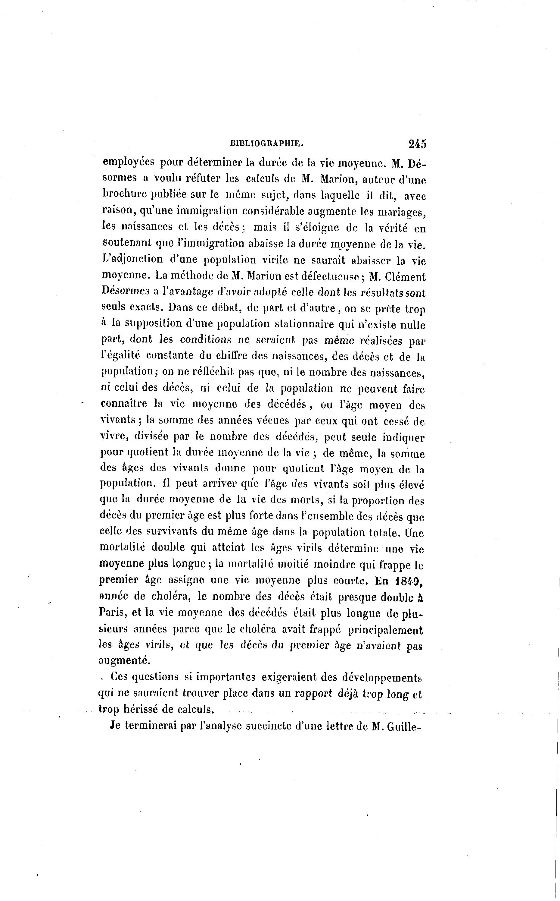 BIBLIOGRAPHIE. 245 employées pour déterminer la durée de la vie moyenne. M. Dé- sormes a voulu réfuter les calculs de M. Marion, auteur d'une brochure publiée sur le même sujet, dans laquelle iJ dit, avec raison, qu'une immigration considérable augmente les mariages, les naissances et les décès ; mais il s'éloigne de la vérité en soutenant que l'immigration abaisse la durée moyenne de la vie. L'adjonction d'une population virile ne saurait abaisser la vie moyenne. La méthode de M. Marion est défectueuse ; M. Clément Désormes a l'avantage d'avoir adopté celle dont les résultats sont seuls exacts. Dans ce débat, de part et d'autre, on se prête trop à la supposition d'une population stationnaire qui n'existe nulle part, dont les conditions ne seraient pas même réalisées par l'égalité constante du chiffre des naissances, des décès et de la population ; on ne réfléchit pas que, ni le nombre des naissances, ni celui des décès, ni celui de la population ne peuvent faire connaître la vie moyenne des décédés, ou l'âge moyen des vivants ; la somme des années vécues par ceux qui ont cessé de vivre, divisée par le nombre des décédés, peut seule indiquer pour quotient la durée moyenne de la vie ; de même, la somme des âges des vivants donne pour quotient l'âge moyen de la population. II peut arriver que l'âge des vivants soit plus élevé que la durée moyenne de la vie des morts, si la proportion des décès du premier âge est plus forte dans l'ensemble des décès que celle des survivants du même âge dans la population totale. Une mortalité double qui atteint les âges virils détermine une vie moyenne plus longue ; la mortalité moitié moindre qui frappe le premier âge assigne une vie moyenne plus courte. En 1849, année de choléra, le nombre des décès était presque double à Paris, et la vie moyenne des décédés était plus longue de plu- sieurs années parce que le choléra avait frappé principalement les âges virils, et que les décès du premier âge n'avaient pas augmenté. . Ces questions si importantes exigeraient des développements qui ne sauraient trouver place dans un rapport déjà trop long et trop hérissé de calculs. Je terminerai par l'analyse succincte d'une lettre de M. Guille-