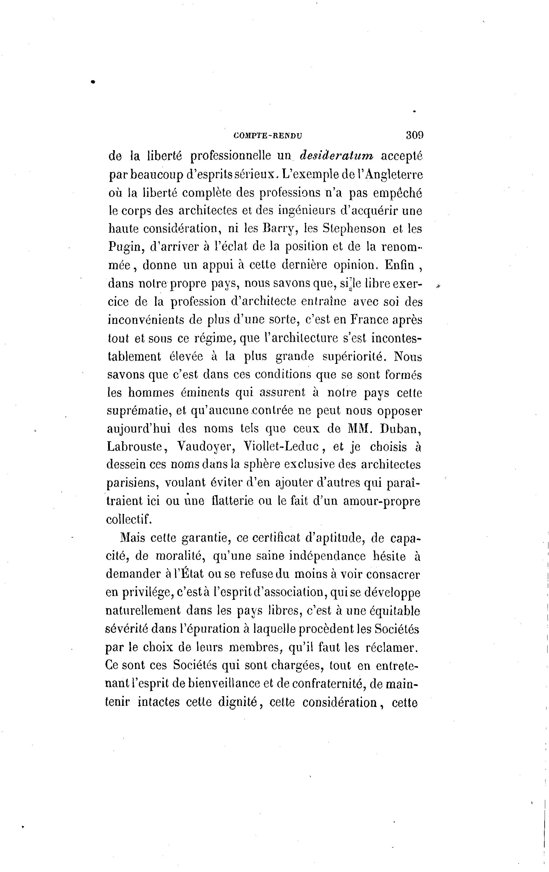 COMPTE-REKDU 309 de la liberté professionnelle un desideratum accepté par beaucoup d'esprits sérieux. L'exemple de l'Angleterre où la liberté complète des professions n'a pas empêché le corps des architectes et des ingénieurs d'acquérir une haute considération, ni les Barry, les Slephenson et les Pugin, d'arriver à l'éclat de la posiiion et de la renom- mée, donne un appui à cette dernière opinion. Enfin , dans notre propre pays, nous savons que, si^le libre exer- cice de la profession d'architecte entraîne avec soi des inconvénients de plus d'une sorte, c'est en France après tout et sous ce régime, que l'architecture s'est incontes- tablement élevée à la plus grande supériorité. Nous savons que c'est dans ces conditions que se sont formés les hommes éminents qui assurent à notre pays cette suprématie, et qu'aucune contrée ne peut nous opposer aujourd'hui des noms tels que ceux de MM. Duban, Labrouste, Vaudoyer, Viollet-Leduc, et je choisis à dessein ces noms dans la sphère exclusive des architectes parisiens, voulant éviter d'en ajouter d'autres qui paraî- traient ici ou une flatterie ou le fait d'un amour-propre collectif. Mais cette garantie, ce certificat d'aptitude, de capa- cité, de moralité, qu'une saine indépendance hésite à demander à l'État ou se refuse du moins à voir consacrer en privilège, c'està respritd'association, quise développe naturellement dans les pays libres, c'est à une équitable sévérité dans l'épuration à laquelle procèdent les Sociétés par le choix de leurs membres, qu'il faut les réclamer. Ce sont ces Sociétés qui sont chargées, tout en entrete- nant l'esprit de bienveillance et de confraternité, de main- tenir intactes cette dignité, celte considération, cette
