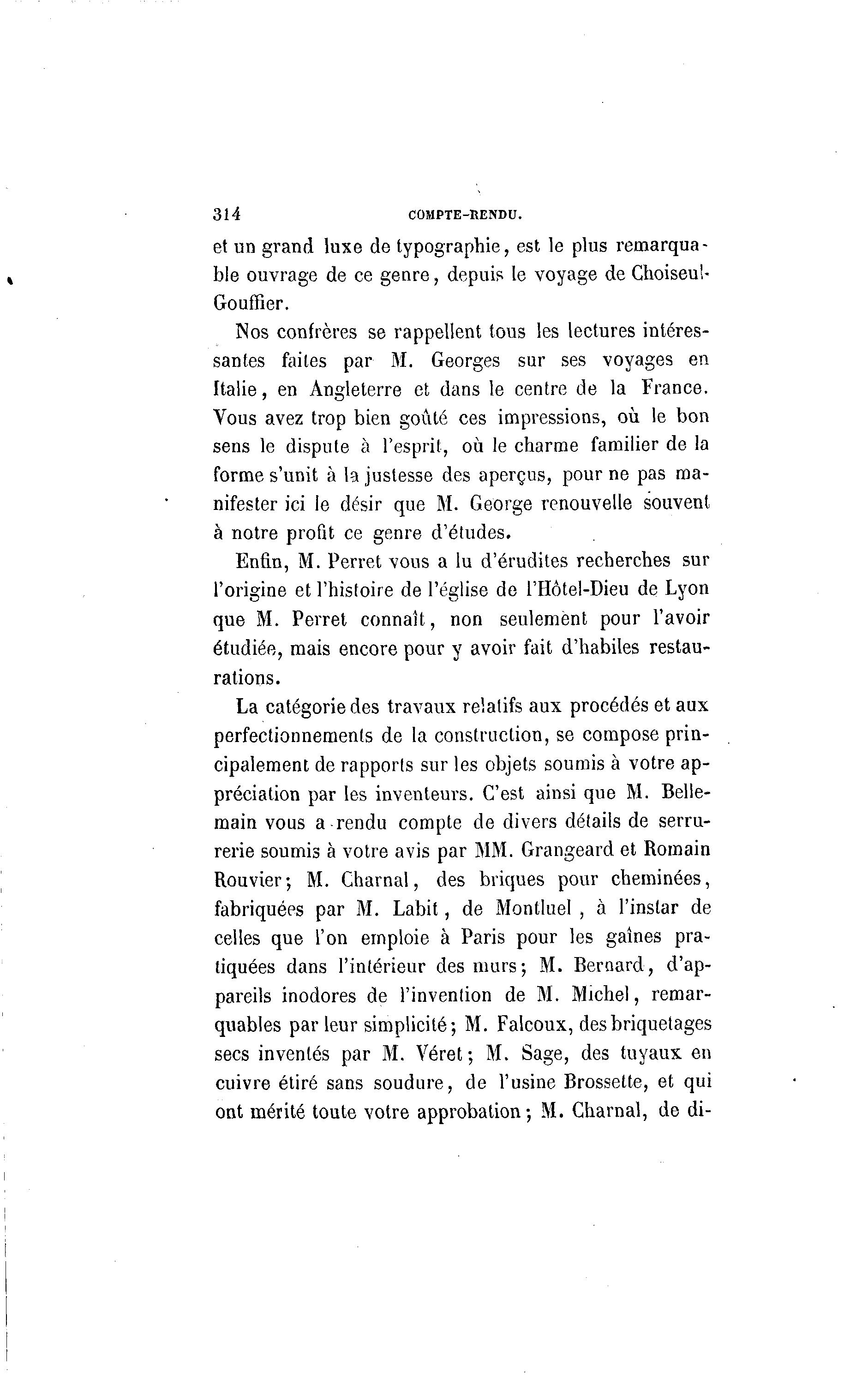 314 COMPTE-KENDU. et un grand luxe de typographie, est le plus remarqua- ble ouvrage de ce genre, depuis le voyage de Choiseu!- Gouffier. Nos confrères se rappellent tous les lectures intéres- santes faites par M. Georges sur ses voyages en Italie, en Angleterre et dans le centre de la France. Vous avez trop bien goûté ces impressions, où le bon sens le dispute à l'esprit, où le charme familier de la forme s'unit à la justesse des aperçus, pour ne pas ma- nifester ici le désir que M. George renouvelle souvent à notre profit ce genre d'études. Enfin, M. Perret vous a lu d'érudites recherches sur l'origine et l'histoire de l'église de l'Hôtel-Dieu de Lyon que M. Perret connaît, non seulement pour l'avoir étudiée, mais encore pour y avoir fait d'habiles restau- rations. La catégorie des travaux relatifs aux procédés et aux perfectionnements de la construction, se compose prin- cipalement de rapports sur les objets soumis à votre ap- préciation par les inventeurs. C'est ainsi que M. Belle- main vous a rendu compte de divers détails de serru- rerie soumis à votre avis par MM. Grangeard et Romain Rouvier; M. Charnal, des briques pour cheminées, fabriquées par M. Labit, de Montluel , à l'instar de celles que l'on emploie à Paris pour les gaines pra- tiquées dans l'intérieur des murs; M. Bernard, d'ap- pareils inodores de l'invention de M. Michel, remar- quables par leur simplicité; M. Falcoux, desbriquetages secs inventés par M. Véret ; M. Sage, des tuyaux en cuivre étiré sans soudure, de l'usine Brossette, et qui ont mérité toute votre approbation; M. Charnal, de di-