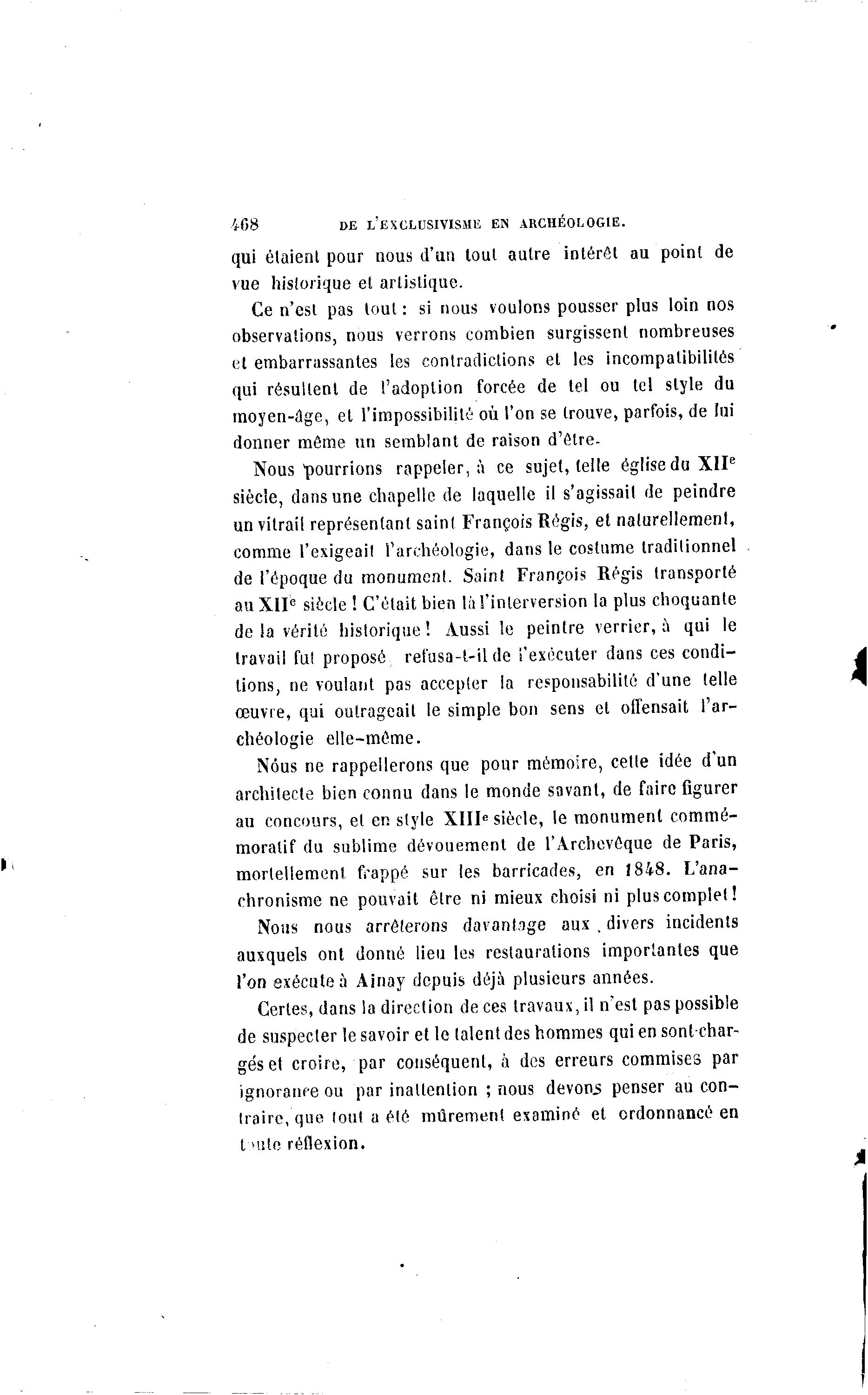 408 DE L'EXCLUSIVISME EN ARCHÉOLOGIE. qui étaient pour nous d'un tout autre intérêt au point de vue historique et artistique. Ce n'est pas tout : si nous voulons pousser plus loin nos observations, nous verrons combien surgissent nombreuses et embarrassantes les contradictions et les incompatibilités qui résultent de l'adoption forcée de tel ou tel style du moyen-âge, et l'impossibilité où l'on se trouve, parfois, de lui donner môme un semblant de raison d'êlre- Nous "pourrions rappeler, à ce sujet, telle église du XII e siècle, dans une chapelle de laquelle il s'agissait de peindre un vitrail représentant saint François Régis, et naturellement, comme l'exigeait l'archéologie, dans le costume traditionnel de l'époque du monument. Saint François Régis transporté au XII e siècle ! C'était bien là l'interversion la plus choquante de la vérité historique ! Aussi le peintre verrier, à qui le travail fut proposé refusa-l-ilde l'exécuter dans ces condi- tions, ne voulant pas accepter la responsabilité d'une telle œuvre, qui outrageait le simple bon sens et offensait l'ar- chéologie elle-même. Nous ne rappellerons que pour mémoire, cette idée d'un architecte bien connu dans le monde savant, de faire figurer au concours, et en style XIII e siècle, le monument commé- moratif du sublime dévouement de l'Archevêque de Paris, mortellement frappé sur les barricades, en 1848. L'ana- chronisme ne pouvait être ni mieux choisi ni plus complet! Nous nous arrêterons davantage aux . divers incidents auxquels ont donné lieu les restaurations importantes que l'on exécute à Ainay depuis déjà plusieurs années. Certes, dans la direction de ces travaux, il n'est pas possible de suspecter le savoir et le talent des hommes qui en sont-char- gés et croire, par conséquent, à des erreurs commises par ignorance ou par inattention ; nous devoos penser au con- traire, que tout a été mûrement examiné et ordonnancé en l mtc réflexion.