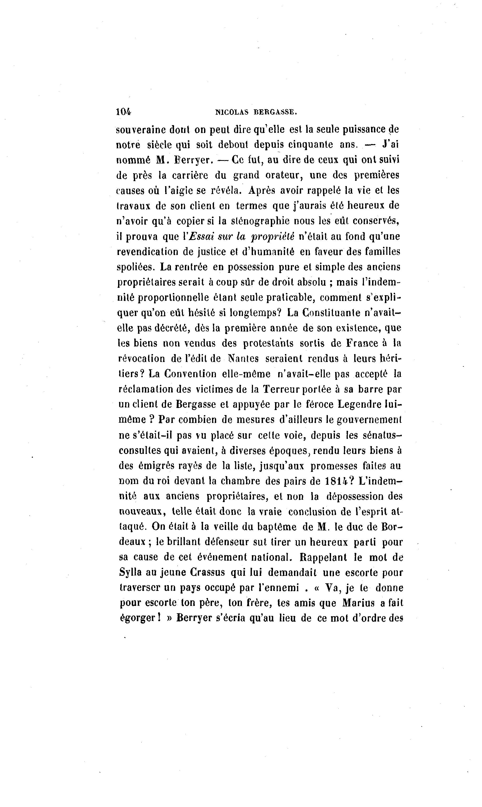 104 NICOLAS BERGASSE. souveraine dont on peut dire qu'elle est la seule puissance de notre siècle qui soit debout depuis cinquante ans. — J'ai nommé M. Berryer. —Ce fut, au dire de ceux qui ont suivi de près la carrière du grand orateur, une des premières causes où l'aigie se révéla. Après avoir rappelé la vie et les travaux de son client en termes que j'aurais été heureux de n'avoir qu'à copier si la sténographie nous les eût conservés, il prouva que l'Essai sur la propriété n'était au fond qu'une revendication de justice et d'humanité en faveur des familles spoliées. La rentrée en possession pure et simple des anciens propriétaires serait à coup sûr de droit absolu ; mais l'indem- nité proportionnelle étant seule praticable, comment s'expli- quer qu'on eût hésité si longtemps? La Constituante n'avait- elle pas décrété, dès la première année de son existence, que les biens non vendus des protestants sortis de France à la révocation de l'édit de Nantes seraient rendus à leurs héri- tiers? La Convention elle-même n'avait-elle pas accepté la réclamation des viclimes de la Terreur portée à sa barre par un client de Bergasse et appuyée par le féroce Legendre lui- môme ? Par combien de mesures d'ailleurs le gouvernement ne s'était-il pas vu placé sur celle voie, depuis les sénatus- consultes qui avaient, à diverses époques, rendu leurs biens à des émigrés rayés de la liste, jusqu'aux promesses faites au nom du roi devant la chambre des pairs de 1814? L'indem- nité aux anciens propriétaires, et non la dépossession des nouveaux, telle était donc la vraie conclusion de l'esprit at- taqué. On était à la veille du baptême de M. le duc de Bor- deaux ; le brillant défenseur sut tirer un heureux parti pour sa cause de cet événement national. Rappelant le mot de Sylla au jeune Crassus qui lui demandait une escorte pour traverser un pays occupé par l'ennemi . « Va, je le donne pour escorte ton père, ton frère, tes amis que Marius a fait égorger ! » Berryer s'écria qu'au lieu de ce mot d'ordre des