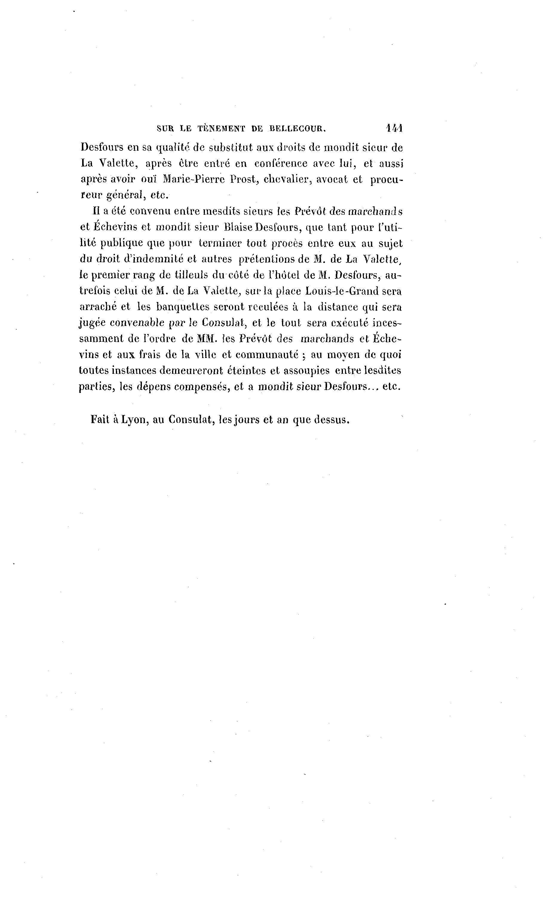 SUR LE TÈNEMENT DE BELLECOUR. 141 Desfours en sa qualité de substitut aux droits de mondit sieur de La Valette, après être entré en conférence avec lui, et aussi après avoir ouï Marie-Pierre Prost, chevalier, avocat et procu- reur général, etc. Il a été convenu entre mesdits sieurs les Prévôt des marchands et Échevins et mondit sieur Biaise Desfours, que tant pour l'uti- lité publique que pour terminer tout procès entre eux au sujet du droit d'indemnité et autres prétentions de M. de La Valette, le premier rang de tilleuls du côté de l'hôtel de M. Desfours, au- trefois celui de M. de La Valette, sur la place Louis-le-Grand sera arraché et les banquettes seront reculées à la distance qui sera jugée convenable par le Consulat, et le tout sera exécuté inces- samment de l'ordre de MM. les Prévôt des marchands et Eche- vins et aux frais de la ville et communauté ; au moyen de quoi toutes instances demeureront éteintes et assoupies entre lesdites parties, les dépens compensés, et a mondit sieur Desfours... etc. Fait à Lyon, au Consulat, les jours et an que dessus.