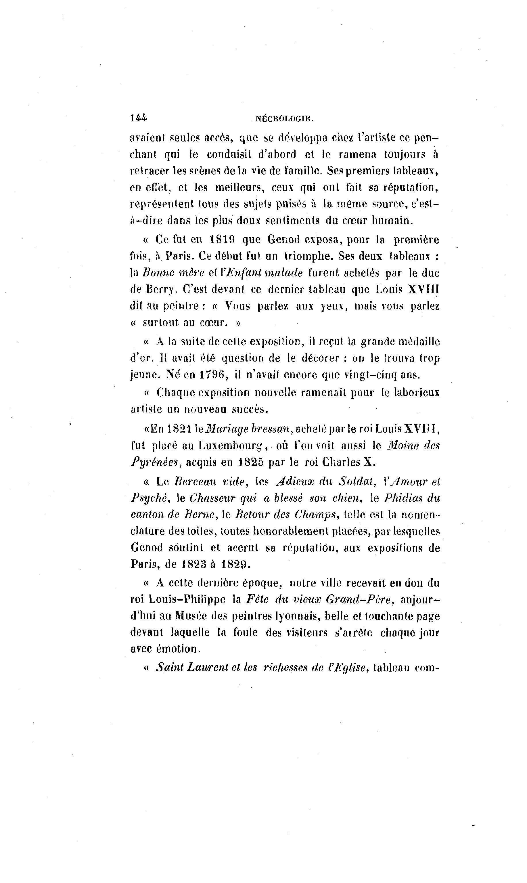 144 NÉCROLOGIE. avaient seules accès, que se développa chez l'artiste ce pen- chant qui le conduisit d'abord et le ramena toujours à retracer les scènes delà vie de famille. Ses premiers tableaux, en effet, et les meilleurs, ceux qui ont fait sa réputation, représentent tous des sujets puisés à la même source, c'est- a-dire dans les plus doux sentiments du cœur humain. « Ce fut en 1819 que Genod exposa, pour la première fois, à Paris. Ce début fut un triomphe. Ses deux tableaux : la Bonne mère et l'Enfant malade furent achetés par le duc de Berry. C'est devant ce dernier tableau que Louis XVIII dit au peintre: « Vous parlez aux yeux, mais vous parlez « surtout au cœur. » « A la suite de cette exposition, il reçut la grande médaille d'or. I! avait été question de le décorer : on le Irouva trop jeune. Né en 1796, il n'avait encore que vingt-cinq ans. « Chaque exposition nouvelle ramenait pour le laborieux artiste un nouveau succès. «En 1821 \eMariage bressan, acheté par le roi Louis XVI! I, fut placé au Luxembourg, où l'on voit aussi le Moine des Pyrénées, acquis en 1825 par le roi Charles X. « Le Berceau vide, les Jl dieux du Soldat, ¥ Amour et Psyché, le Chasseur qui a blessé son chien, le Phidias du canton de Berne, le Retour des Champs, telle est la nomen- clature des toiles, toutes honorablement placées, par lesquelles Genod soutint et accrut sa réputation, aux expositions de Paris, de 1823 à 1829. « A cette dernière époque, notre ville recevait en don du roi Louis-Philippe la Fête du vieux Grand-Père, aujour- d'hui au Musée des peintres lyonnais, belle et touchante page devant laquelle la foule des visiteurs s'arrête chaque jour avec émotion. « Saint Laurent et les richesses de l'Eglise, tableau corn-