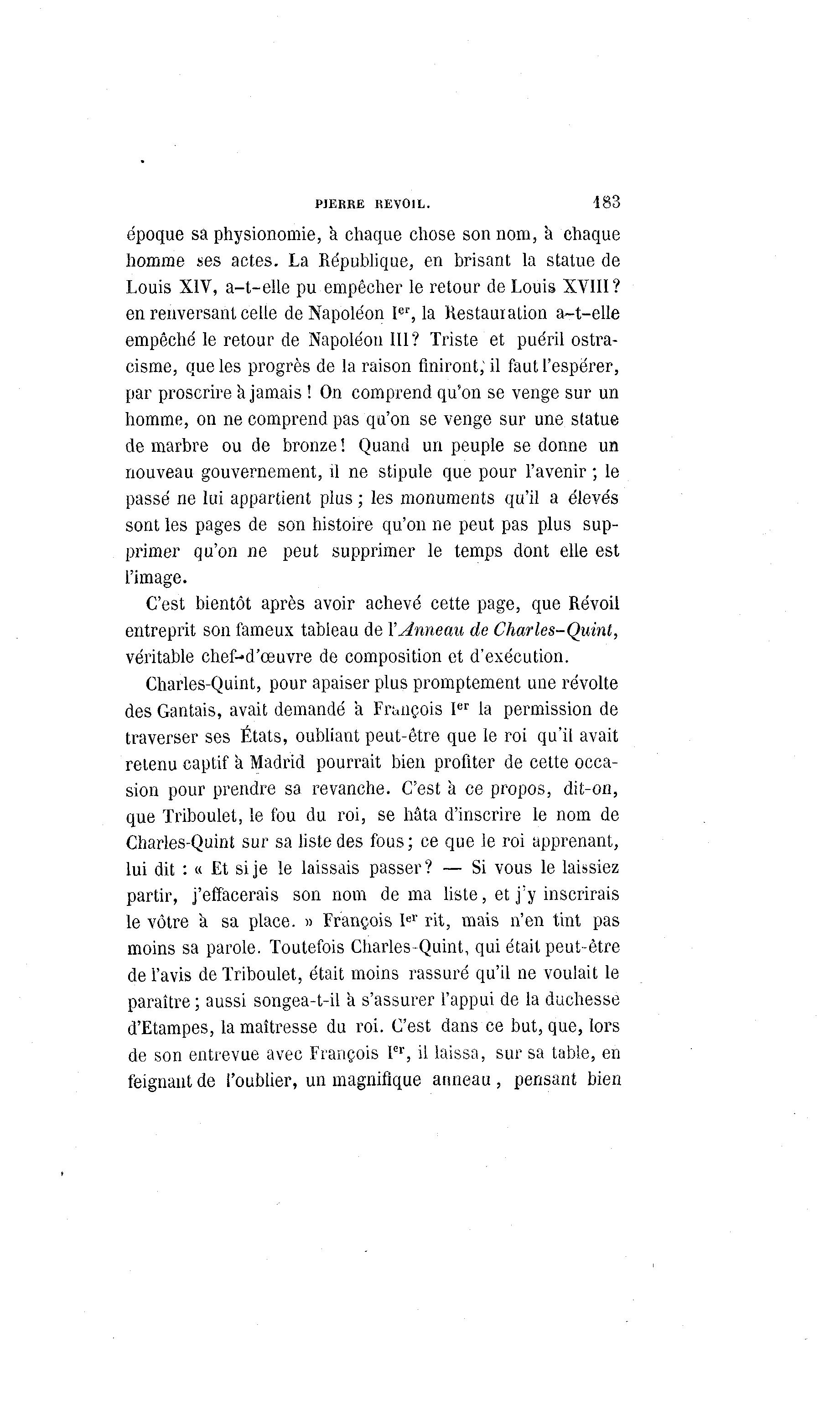 PIERRE REV01L. 183 époque sa physionomie, h chaque chose son nom, a chaque homme ses actes. La République, en brisant la statue de Louis XIV, a-t-elle pu empêcher le retour de Louis XVIII? en renversant celle de Napoléon Ier, la Restauration a-t-elle empêché le retour de Napoléon III? Triste et puéril ostra- cisme, que les progrès de la raison finiront, il faut l'espérer, par proscrire à jamais ! On comprend qu'on se venge sur un homme, on ne comprend pas qu'on se venge sur une statue de marbre ou de bronze! Quand un peuple se donne un nouveau gouvernement, il ne stipule que pour l'avenir ; le passé ne lui appartient plus ; les monuments qu'il a élevés sont les pages de son histoire qu'on ne peut pas plus sup- primer qu'on ne peut supprimer le temps dont elle est l'image. C'est bientôt après avoir achevé cette page, que Révoil entreprit son fameux tableau de Y Anneau de Charles-Quint, véritable chef-d'œuvre de composition et d'exécution. Charles-Quint, pour apaiser plus promptement une révolte des Gantais, avait demandé a François Ier la permission de traverser ses États, oubliant peut-être que le roi qu'il avait retenu captif à Madrid pourrait bien profiter de cette occa- sion pour prendre sa revanche. C'est à ce propos, dit-on, que Triboulet, le fou du roi, se hâta d'inscrire le nom de Charles-Quint sur sa liste des fous; ce que le roi apprenant, lui dit : « Et si je le laissais passer? — Si vous le laissiez partir, j'effacerais son nom de ma liste, et j'y inscrirais le vôtre a sa place. » François Ier rit, mais n'en tint pas moins sa parole. Toutefois Charles-Quint, qui était peut-être de l'avis de Triboulet, était moins rassuré qu'il ne voulait le paraître ; aussi songea-t-il a s'assurer l'appui de la duchesse d'Etampes, la maîtresse du roi. C'est dans ce but, que, lors de son entrevue avec François Ier, il laissa, sur sa table, en feignant de l'oublier, un magnifique anneau , pensant bien