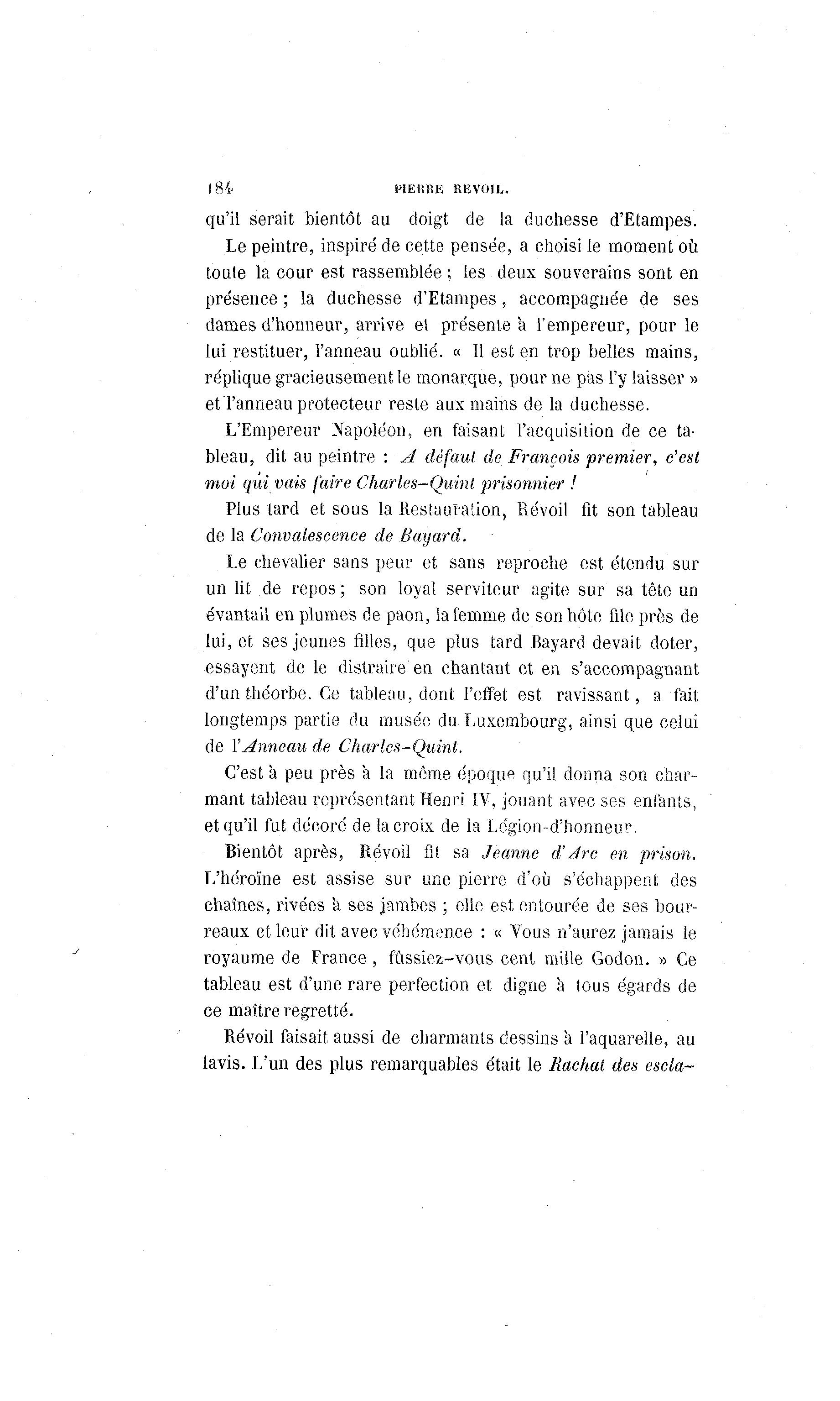 (84 PIERRE REV01L. qu'il serait bientôt au doigt de la duchesse d'Etampes. Le peintre, inspiré de cette pensée, a choisi le moment où toute la cour est rassemblée ; les deux souverains sont en présence ; la duchesse d'Etampes, accompagnée de ses dames d'honneur, arrive et présente a l'empereur, pour le lui restituer, l'anneau oublié. « il est en trop belles mains, réplique gracieusement le monarque, pour ne pas l'y laisser » et l'anneau protecteur reste aux mains de la duchesse. L'Empereur Napoléon, en faisant l'acquisition de ce ta- bleau, dit au peintre : A défaut de François premier, c'est moi qui vais faire Charles-Quint prisonnier ! Plus tard et sous la Restauration, Révoil fit son tableau de la Convalescence de Bayard. Le chevalier sans peur et sans reproche est étendu sur un lit de repos ; son loyal serviteur agite sur sa tête un évantail en plumes de paon, la femme de son hôte file près de lui, et ses jeunes filles, que plus tard Bayard devait doter, essayent de le distraire en chantant et en s'accompagnant d'unthéorbe. Ce tableau, dont l'effet est ravissant, a fait longtemps partie du musée du Luxembourg, ainsi que celui de l'Anneau de Charles-Quint. C'est à peu près a la même époque qu'il donna son char- mant tableau représentant Henri IV, jouant avec ses enfants, et qu'il fut décoré de la croix de la Légiou-d'honneur. Bientôt après, lévoil fit sa Jeanne d'Arc en prison. L'héroïne est assise sur une pierre d'où s'échappent des chaînes, rivées a ses jambes ; elle est entourée de ses bour- reaux et leur dit avec véhémence : « Vous n'aurez jamais le royaume de France , fûssiez-vous cent mille Godon. » Ce tableau est d'une rare perfection et digne à tous égards de ce maître regretté. Révoil faisait aussi de charmants dessins à l'aquarelle, au lavis. L'un des plus remarquables était le Rachat des escla-