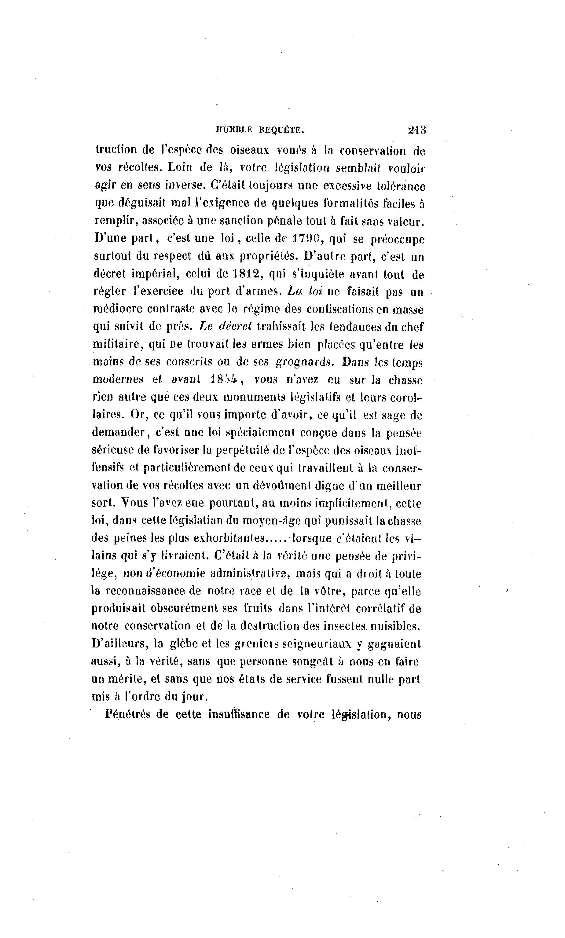 HUMBLE REQUÊTE. 213 (ruction de l'espèce des oiseaux voués à la conservation de vos récoltes. Loin de là , votre législation semblait vouloir agir en sens inverse. C'était toujours une excessive tolérance que déguisait mal l'exigence de quelques formalités faciles à remplir, associée à une sanction pénale tout à fait sans valeur. D'une part, c'est une loi, celle de 1790, qui se préoccupe surtout du respect dû aux propriétés. D'autre part, c'est un décret impérial, celui de 1812, qui s'inquiète avant tout de régler l'exerciee du port d'armes. La loi ne faisait pas un médiocre contraste avec le régime des confiscations en masse qui suivit de prés. Le décret trahissait les tendances du chef militaire, qui ne trouvait les armes bien placées qu'entre les mains de ses conscrits ou de ses grognards. Dans les temps modernes et avant 1814, vous n'avez eu sur la chasse rien autre que ces deux monuments législatifs et leurs corol- laires. Or, ce qu'il vous importe d'avoir, ce qu'il est sage de demander, c'est une loi spécialement conçue dans la pensée sérieuse de favoriser la perpétuité de l'espèce des oiseaux inof- fensifs et particulièrement de ceux qui travaillent à la conser- vation de vos récoltes avec un dôvoûmenl digne d'un meilleur sort. Vous l'avez eue pourtant, au moins implicitement, cette loi, dans celle législalian du moyen-âge qui punissait lâchasse des peines les plus exhorbitantes lorsque c'étaient les vi- lains qui s'y livraient. C'était à la vérité une pensée de privi- lège, non d'économie administrative, mais qui a droit à toute la reconnaissance de notre race et de la vôtre, parce qu'elle produisait obscurément ses fruits dans l'intérêt corrélatif de notre conservation et de la destruction des insectes nuisibles. D'ailleurs, la glèbe et les greniers seigneuriaux y gagnaient aussi, à la vérité, sans que personne songeât à nous en faire un mérile, et sans que nos étals de service fussent nulle part mis à l'ordre du jour. Pénétrés de cette insuffisance de votre législation, nous