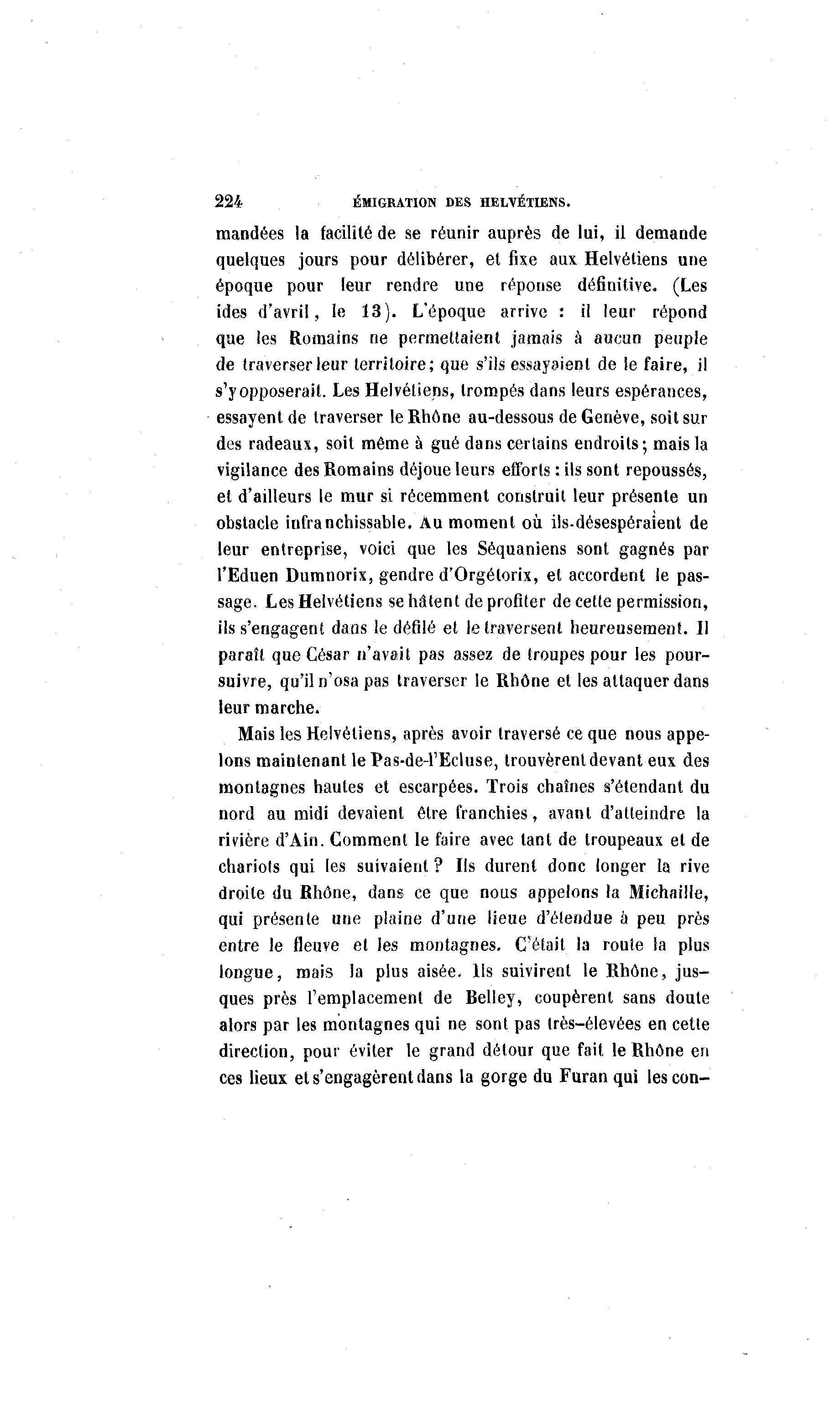 224 ÉMIGRATION DES HELVÉTIENS. mandées la facilité de se réunir auprès de lui, il demande quelques jours pour délibérer, et fixe aux Helvétiens une époque pour leur rendre une réponse définitive. (Les ides d'avril, le 13). L'époque arrive : il leur répond que îes Romains ne permettaient jamais à aucun peuple de traverser leur territoire; que s'ils essayaient de le faire, il s'y opposerait. Les Helvétiens, trompés dans leurs espérances, essayent de traverser le Rhône au-dessous de Genève, soit sur des radeaux, soit même à gué dans certains endroits; mais la vigilance des Romains déjoue leurs efforts : ils sont repoussés, et d'ailleurs le mur si récemment construit leur présente un obstacle infranchissable. Au moment où ils-désespéraient de leur entreprise, voici que les Séquaniens sont gagnés par l'Eduen Dumnorix, gendre d'Orgélorix, et accordent le pas- sage. Les Helvétiens se hâtent de profiter de cette permission, ils s'engagent dans le défilé et le traversent heureusement. Il paraît que César n'avait pas assez de troupes pour les pour- suivre, qu'il n'osa pas traverser le Rhône et les attaquer dans leur marche. Mais les Helvétiens, après avoir traversé ce que nous appe- lons maintenant lePas-de-1'Ecluse, trouvèrent devant eux des montagnes hautes et escarpées. Trois chaînes «'étendant du nord au midi devaient être franchies, avant d'atteindre la rivière d'Ain. Comment le faire avec tant de troupeaux et de chariots qui les suivaient ? Us durent donc longer la rive droite du Rhône, dans ce que nous appelons la Michaille, qui présente une plaine d'une lieue d'étendue à peu près entre le fleuve et les montagnes. C'était la route la plus longue, mais la plus aisée. Ils suivirent le Rhône, jus- ques près l'emplacement de Relley, coupèrent, sans doute alors par les montagnes qui ne sont pas très-élevées en cette direction, pour éviter le grand détour que fait le Rhône en ces lieux et s'engagèrent dans la gorge du Furan qui les con-