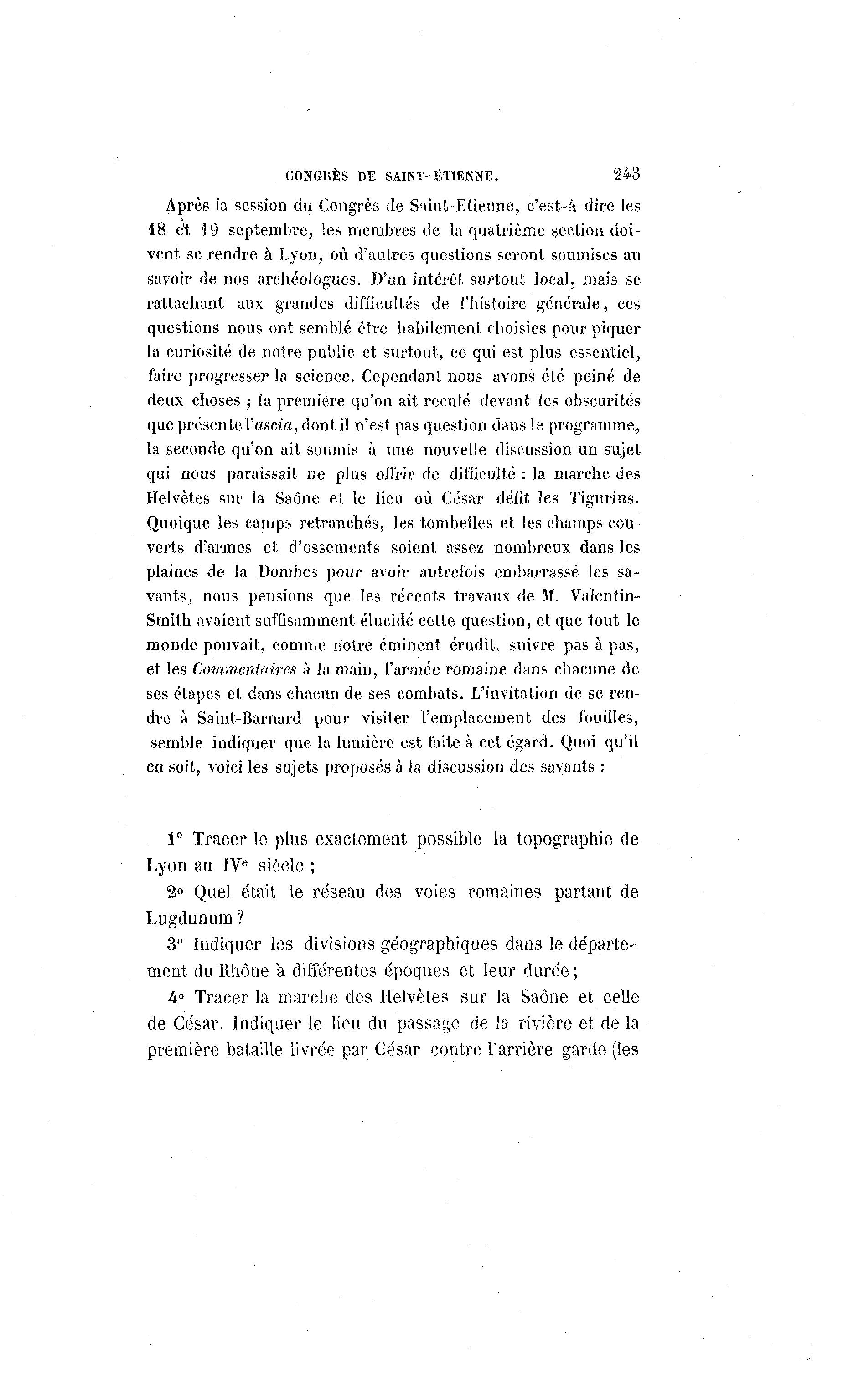 CONGRÈS DE SAINT-ETIENNE. 243 Après la session du Congrès de Saiut-Etienne, c'est-à -dire les 18 et 19 septembre, les membres de la quatrième section doi- vent se rendre à Lyon, où d'autres questions seront soumises au savoir de nos archéologues. D'un intérêt surtout local, mais se rattachant aux grandes difficultés de l'histoire générale, ces questions nous ont semblé être habilement choisies pour piquer la curiosité de notre public et surtout, ce qui est plus essentiel, faire progresser la science. Cependant nous avons élé peiné de deux choses ; la première qu'on ait reculé devant les obscurités que présente Yascia, dont il n'est pas question dans le programme, la seconde qu'on ait soumis à une nouvelle discussion un sujet qui nous paraissait ne plus offrir de difficulté : la marche des Helvètes sur la Saône et le lieu où César défit les Tigurins. Quoique les camps retranchés, les torahelles et les champs cou- verts d'armes et d'ossements soient assez nombreux dans les plaines de la Dombes pour avoir autrefois embarrassé les sa- vants; nous pensions que les récents travaux de M. Valentin- Smith avaient suffisamment élucidé cette question, et que tout le monde pouvait, comme notre éminent érudit, suivre pas à pas, et les Commentaires à la main, l'armée romaine dans chacune de ses étapes et dans chacun de ses combats. L'invitation de se ren- dre à Saint-Barnard pour visiter l'emplacement des fouilles, semble indiquer que la lumière est faite à cet égard. Quoi qu'il en soit, voici les sujets proposés à la discussion des savants : 1° Tracer le plus exactement possible la topographie de Lyon au IVe siècle ; 2° Quel était le réseau des voies romaines partant de Lugdunum? 3° Indiquer les divisions géographiques dans le départe- ment du Rhône à différentes époques et leur durée; 4° Tracer la marche des Helvètes sur la Saône et celle de César. Indiquer le lieu du passage de la rivière et de la première bataille livrée par César contre l'arrière garde (les