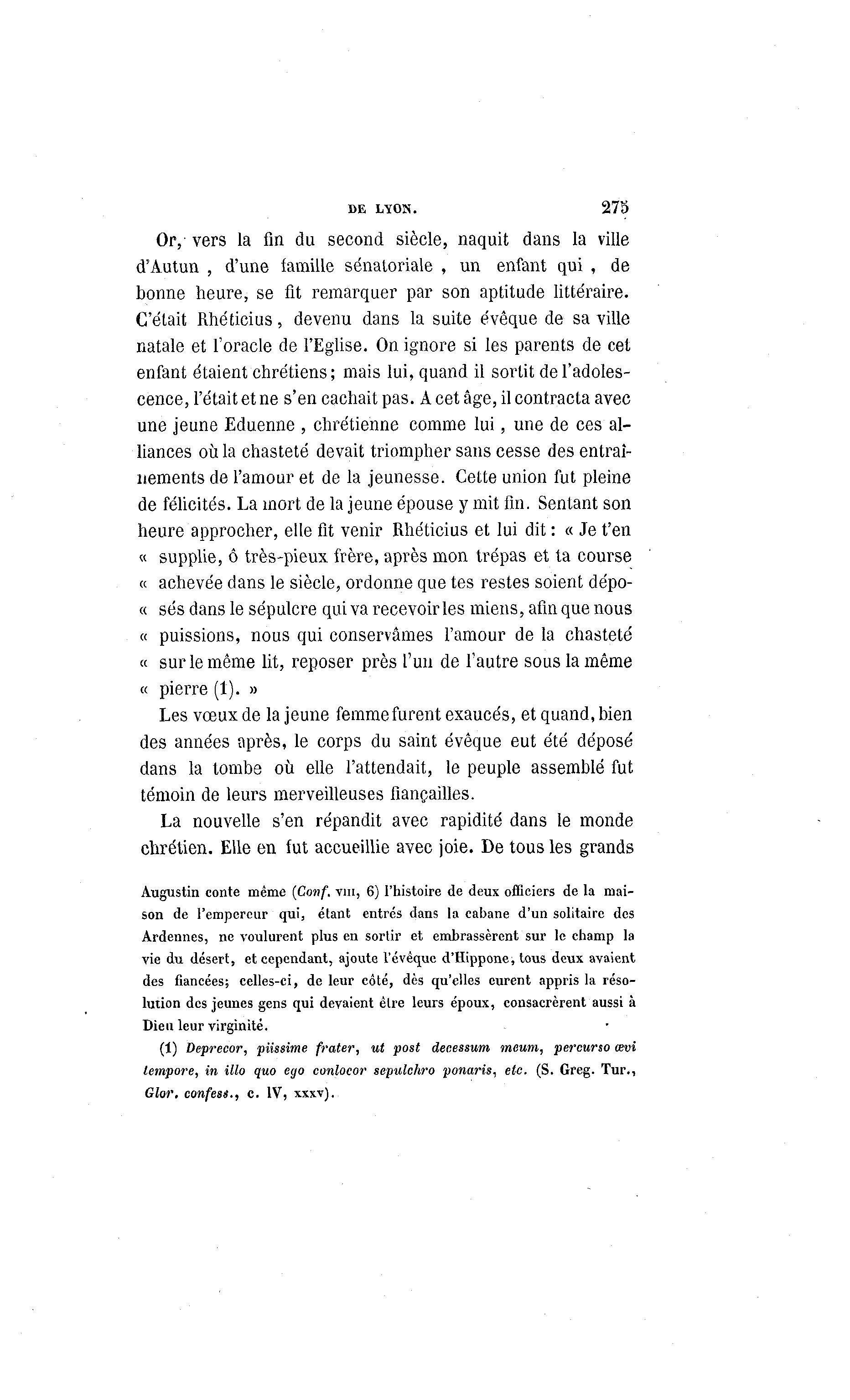 DE LYON. 275 Or, vers la fin du second siècle, naquit dans la ville d'Autun , d'une famille sénatoriale , un enfant qui , de bonne heure, se fit remarquer par son aptitude littéraire. C'était Rhéticius, devenu dans la suite évêque de sa ville natale et l'oracle de l'Eglise. On ignore si les parents de cet enfant étaient chrétiens; mais lui, quand il sortit de l'adoles- cence, l'était et ne s'en cachait pas. A cet âge, il contracta avec une jeune Eduenne , chrétienne comme lui, une de ces al- liances où la chasteté devait triompher sans cesse des entraî- nements de l'amour et de la jeunesse. Cette union fut pleine de félicités. La mort de la jeune épouse y mit fin. Sentant son heure approcher, elle fit venir Rhéticius et lui dit : « Je t'en « supplie, ô très-pieux frère, après mon trépas et ta course « achevée dans le siècle, ordonne que tes restes soient dépo- « ses dans le sépulcre qui va recevoir les miens, afin que nous « puissions, nous qui conservâmes l'amour de la chasteté « sur le même lit, reposer près l'un de l'autre sous la même « pierre (1). » Les vœux de la jeune femme furent exaucés, et quand, bien des années après, le corps du saint évêque eut été déposé dans la tombe où elle l'attendait, le peuple assemblé fut témoin de leurs merveilleuses fiançailles. La nouvelle s'en répandit avec rapidité dans le monde chrétien. Elle en fut accueillie avec joie. De tous les grands Augustin conte même (Conf. vm, 6) l'histoire de deux officiers de la mai- son de l'empereur qui, étant entrés dans la cabane d'un solitaire des Ardennes, ne voulurent plus en sortir et embrassèrent sur le champ la vie du désert, et cependant, ajoute l'évêquc d'Hippone, tous deux avaient des fiancées; celles-ci, de leur côté, dès qu'elles eurent appris la réso- lution des jeunes gens qui devaient être leurs époux, consacrèrent aussi à Dieu leur virginité. (1) Deprecor, piissime frater, ut post decessum moum, percurso œvi tempore, in Mo quo ego conlocor sepulchro ponaris-, etc. (S. Greg. Tur., G/or. confeu., c. IV, xxxv).