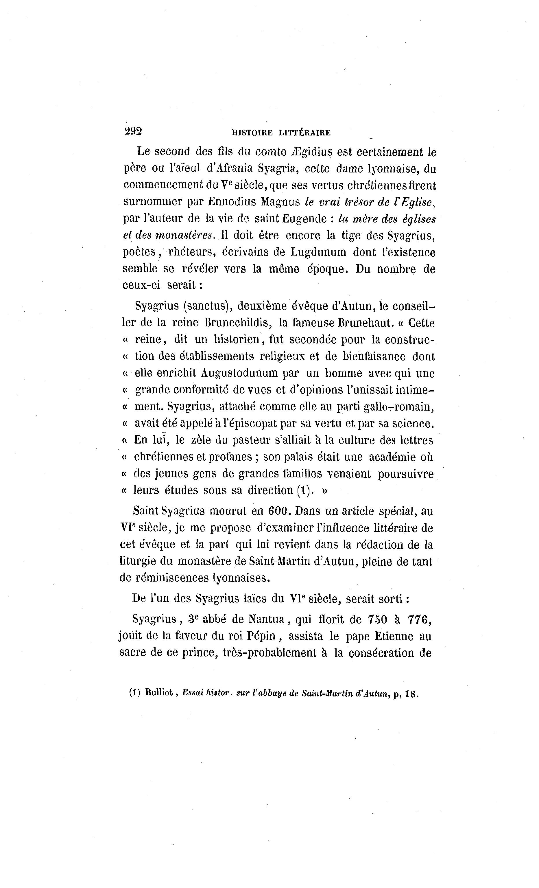 292 HISTOIRE LITTÉRAIRE Le second des fils du comte Jigidius est certainement le père ou l'aïeul d'Afrania Syagria, cette dame lyonnaise, du commencement du Ve siècle, que ses vertus chrétiennes firent surnommer par Ennodius Magnus le vrai trésor de l'Eglise, par l'auteur de la vie de saint Eugende : la mère des églises et des monastères. II doit être encore la tige des Syagrius, poètes/rhéteurs, écrivains de Lugdunum dont l'existence semble se révéler vers la même époque. Du nombre de ceux-ci serait : Syagrius (sanctus), deuxième évêque d'Autun, le conseil- ler de la reine Brunechildis, la fameuse Brunehaut. « Cette « reine, dit un historien, fut secondée pour la construc- « tion des établissements religieux et de bienfaisance dont « elle enrichit Augustodunum par un homme avec qui une « grande conformité de vues et d'opinions l'unissait intime- « ment. Syagrius, attaché comme elle au parti gallo-romain, « avait été appelé a l'épiscopat par sa vertu et par sa science. « En lui, le zèle du pasteur s'alliait a la culture des lettres « chrétiennes et profanes ; son palais était une académie où « des jeunes gens de grandes familles venaient poursuivre « leurs études sous sa direction (1). » Saint Syagrius mourut en 600. Dans un article spécial, au e VI siècle, je me propose d'examiner l'influence littéraire de cet évêque et la pari qui lui revient dans la rédaction de la liturgie du monastère de Saint-Martin d'Autun, pleine de tant de réminiscences lyonnaises. De l'un des Syagrius laïcs du VIe siècle, serait sorti : Syagrius, 3 e abbé de Nantua, qui florit de 750 à 776, jouit de la faveur du roi Pépin, assista le pape Etienne au sacre de ce prince, très-probablement a la consécration de (1) Bulliot, Essai histor. sur l'abbaye de Saint-Martin d'Autun, p, 18.