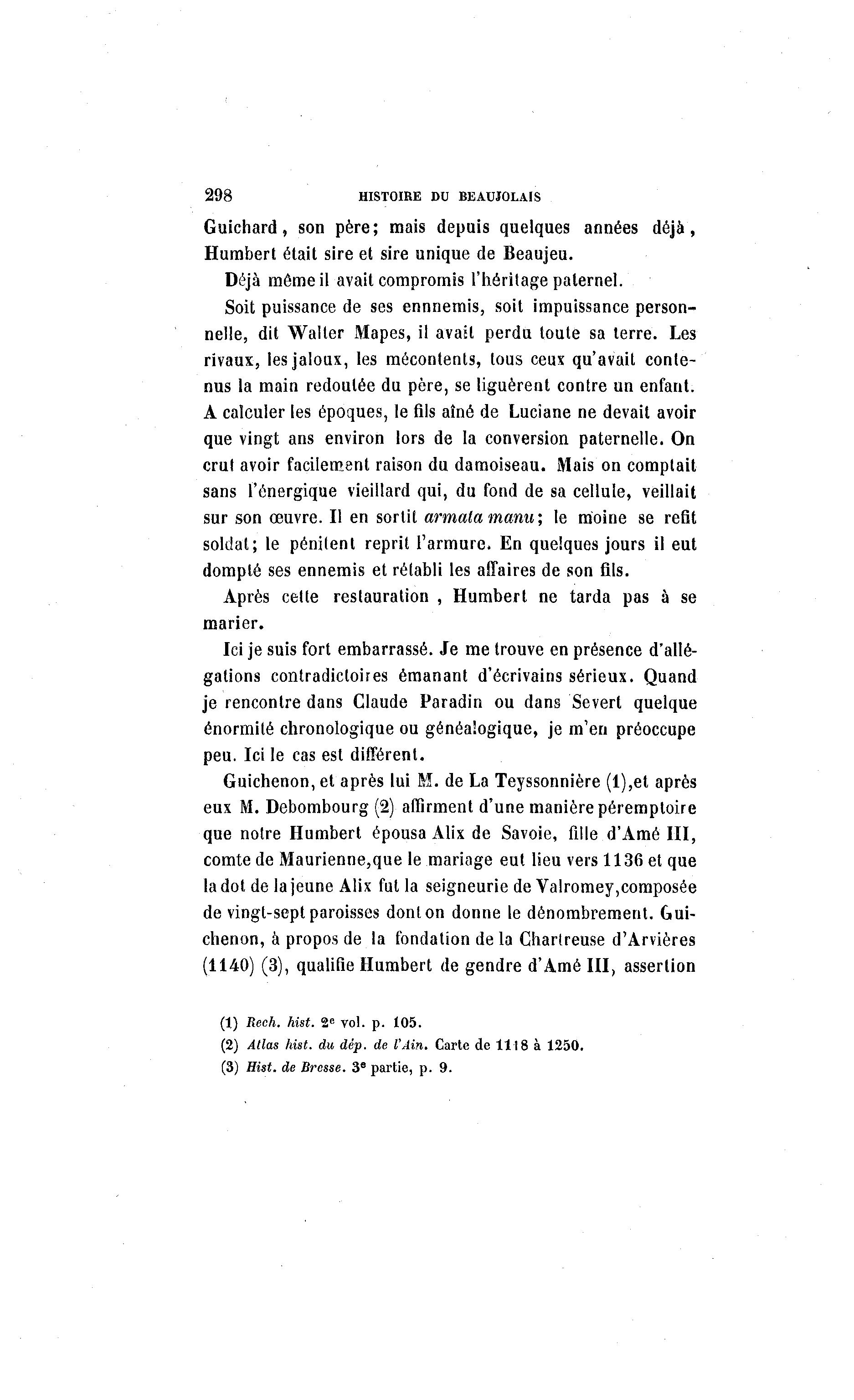 298 HISTOIRE DU BEAUJOLAIS Guichard, son père; mais depuis quelques années déjà , Humbert était sire et sire unique de Beaujeu. Déjà même il avait compromis l'héritage paternel. Soit puissance de ses ennnemis, soit impuissance person- nelle, dit Walter Mapes, il avait perdu toute sa terre. Les rivaux, les jaloux, les mécontents, tous ceux qu'avait conte- nus la main redoutée du père, se liguèrent contre un enfant. A calculer les époques, le fils aîné de Lucîane ne devait avoir que vingt ans environ lors de la conversion paternelle. On crut avoir facilement raison du damoiseau. Mais on comptait sans l'énergique vieillard qui, du fond de sa cellule, veillait sur son œuvre. Il en sortit armalamanw, le moine se refit soldat; le pénitent reprit l'armure. En quelques jours il eut dompté ses ennemis et rétabli les affaires de son fils. Après cette restauration , Humbert ne tarda pas à se marier. Ici je suis fort embarrassé. Je me trouve en présence d'allé- galions contradictoires émanant d'écrivains sérieux. Quand je rencontre dans Claude Paradin ou dans Severt quelque énormité chronologique ou généalogique, je m'en préoccupe peu. Ici le cas est différent. Guichenon, et après lui M. de La Teyssonnière (l),et après eux M. Debombourg (2) affirment d'une manière péremptoire que notre Humbert épousa Alix de Savoie, fille d'Ame III, comte de Maurienne,que le mariage eut lieu vers 1136 et que la dot de la jeune Alix fut la seigneurie de Valromey composée de vingt-sept paroisses dont on donne le dénombrement. Gui- chenon, à propos de la fondation de la Chartreuse d'Arvières (1140) (3), qualifie Humbert de gendre d'Ame III, assertion (1) Rech. hist. 2 e vol. p. 105. (2) Atlas hist. du dêp. de l'Ain. Carte de 1118 à 1250. (3) Hist. de Bresse. 3° partie, p. 9.