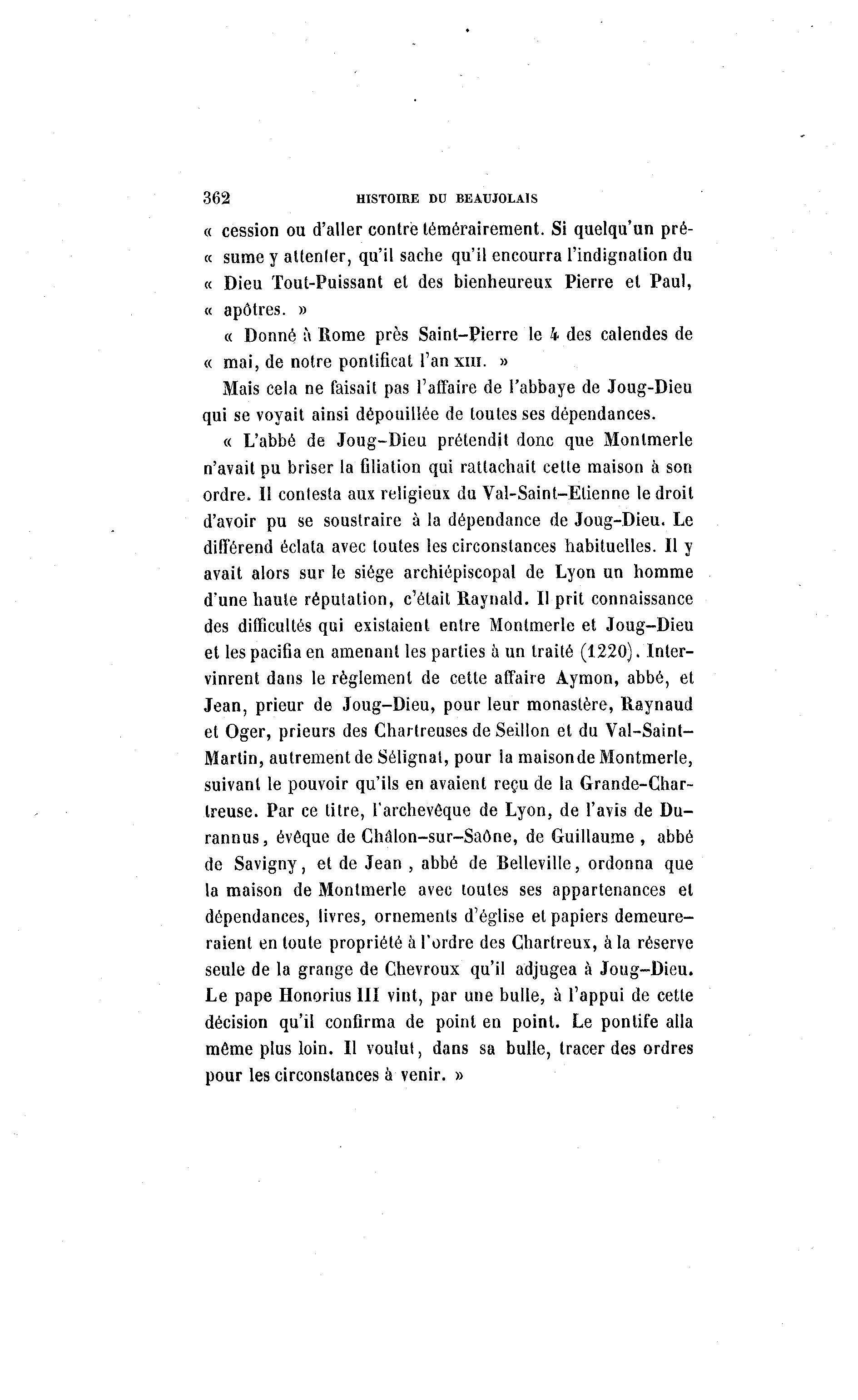 362 HISTOIRE D0 BEAUJOLAIS « cession ou d'aller contre témérairement. Si quelqu'un pré- c sume y attenter, qu'il sache qu'il encourra l'indignation du e « Dieu Tout-Puissant et des bienheureux Pierre et Paul, « apôtres. » « Donné à Rome près Saint-Pierre le 4 des calendes de « mai, de notre pontificat l'anxin. » Mais cela ne faisait pas l'affaire de l'abbaye de Joug-Dieu qui se voyait ainsi dépouillée de toutes ses dépendances. « L'abbé de Joug-Dieu prétendit donc que Monlmerle n'avait pu briser la filiation qui rattachait cette maison à son ordre. Il contesta aux religieux du Val-Saint-Elienne le droit d'avoir pu se soustraire à la dépendance de Joug-Dieu. Le différend éclata avec toutes les circonstances habituelles. Il y avait alors sur le siège archiépiscopal de Lyon un homme d'une haute réputation, c'était Raynald. Il prit connaissance des difficultés qui existaient entre Montmerle et Joug-Dieu et les pacifia en amenant les parties à un traité (1220). Inter- vinrent dans le règlement de cette affaire Aymon, abbé, et Jean, prieur de Joug-Dieu, pour leur monastère, Raynaud et Oger, prieurs des Chartreuses de Seillon et du Val-Saint- Martin, autrement de Sélignat, pour la maison de Montmerle, suivant le pouvoir qu'ils en avaient reçu de la Grande-Char- treuse. Par ce titre, l'archevêque de Lyon, de l'avis de Du- rannus, évêque de Chalon-sur-Saône, de Guillaume , abbé de Savigny, et de Jean , abbé de Belleville, ordonna que la maison de Monlmerle avec toutes ses appartenances et dépendances, livres, ornements d'église et papiers demeure- raient en toute propriété à l'ordre des Chartreux, à la réserve seule de la grange de Chevroux qu'il adjugea à Joug-Dieu. Le pape Honorius III vint, par une bulle, à l'appui de cette décision qu'il confirma de point en point. Le pontife alla môme plus loin. Il voulut, dans sa bulle, tracer des ordres pour les circonstances à venir. »