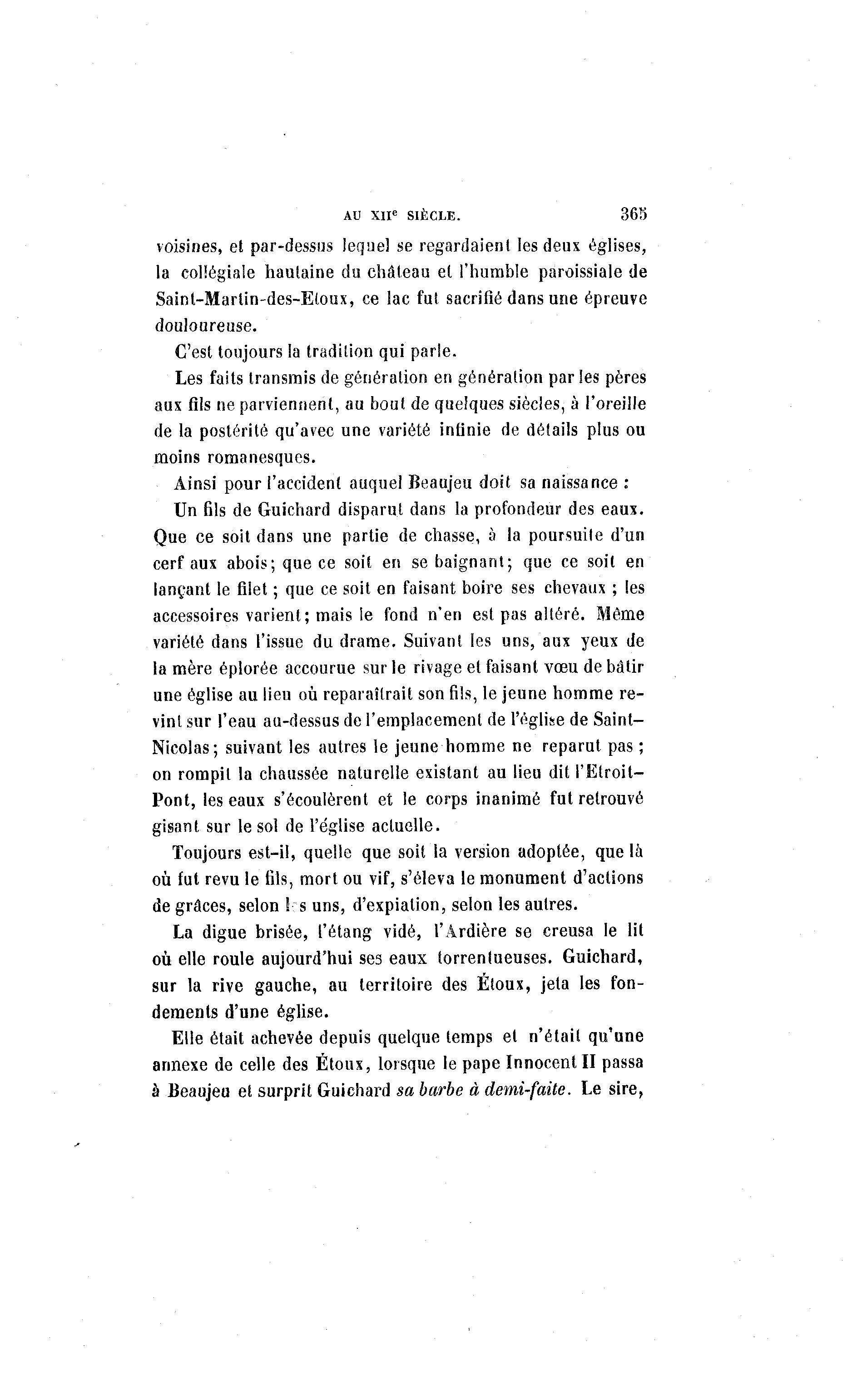 AU XIIe SIÈCLE. 365 voisines, et par-dessus lequel se regardaient les deux églises, la collégiale hautaine du château et l'humble paroissiale de Saint-Marlin-des-Eloux, ce lac fut sacrifié dans une épreuve douloureuse. C'est toujours la tradition qui parle. Les faits transmis de génération en génération par les pères aux fils ne parviennent, au bout de quelques siècles, à l'oreille de la postérité qu'avec une variété infinie de détails plus ou moins romanesques. Ainsi pour l'accident auquel Beaujeu doit sa naissance : Un fils de Guichard disparut dans la profondeur des eaux. Que ce soit dans une partie de chasse, à la poursuite d'un cerf aux abois; que ce soit en se baignant; que ce soit en lançant le filet ; que ce soit en faisant boire ses chevaux ; les accessoires varient; mais le fond n'en est pas altéré. Môme variété dans l'issue du drame. Suivant les uns, aux yeux de la mère éplorée accourue sur le rivage et faisant vœu de bâtir une église au lieu où reparaîtrait sonfils,le jeune homme re- vint sur l'eau au-dessus de l'emplacement de l'église de Saint- Nicolas; suivant les autres le jeune homme ne reparut pas ; on rompit la chaussée naturelle existant au lieu dit l'Etroit— Pont, les eaux s'écoulèrent et le corps inanimé fut retrouvé gisant sur le sol de l'église actuelle. Toujours est-il, quelle que soit la version adoptée, que là où fut revu le fils, mort ou vif, s'éleva le monument d'actions de grâces, selon I s uns, d'expiation, selon les autres. La digue brisée, l'étang vidé, l'.lrdière se creusa le lit où elle roule aujourd'hui ses eaux torrentueuses. Guichard, sur la rive gauche, au territoire des Étoux, jeta les fon- dements d'une église. Elle était achevée depuis quelque temps et n'était qu'une annexe de celle des Étoux, lorsque le pape Innocent II passa à Beaujeu et surprit Guichard sa barbe à demi-faite. Le sire,