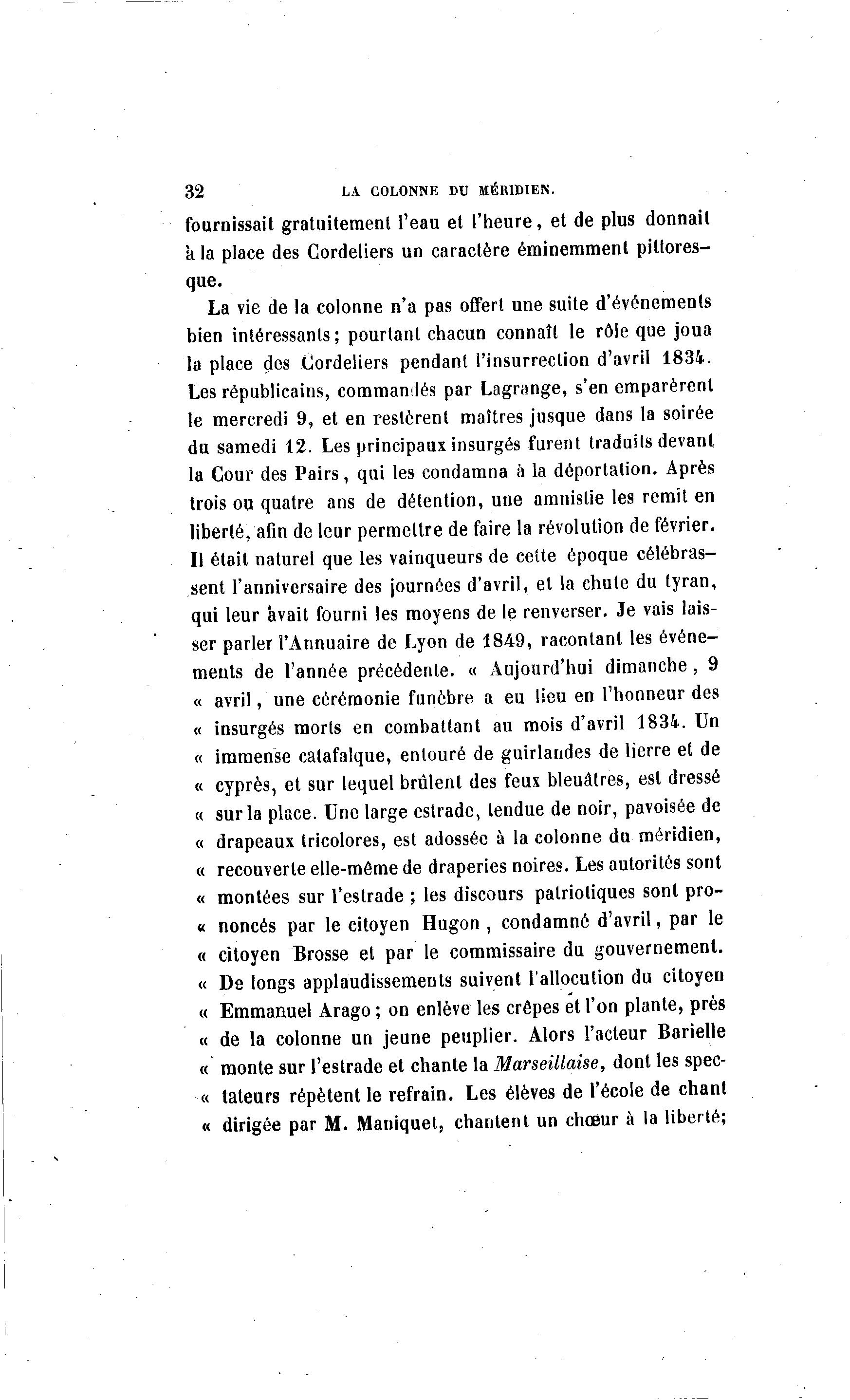 32 LA COLONNE DU MÉRIDIEN. fournissait gratuitement l'eau et l'heure, et de plus donnait à la place des Cordeliers un caractère éminemment pittores- que. La vie de la colonne n'a pas offert une suite d'événements bien intéressants; pourtant chacun connaît le rôle que joua la place des Cordeliers pendant l'insurrection d'avril 1834. Les républicains, commandés par Lagrange, s'en emparèrent le mercredi 9, et en restèrent maîtres jusque dans la soirée du samedi 12. Les principaux insurgés furent traduits devant la Cour des Pairs, qui les condamna ù la déportation. Après trois ou quatre ans de détention, une amnistie les remit en liberté, afin de leur permettre de faire la révolution de février. Il était naturel que les vainqueurs de cette époque célébras- sent l'anniversaire des journées d'avril, et la chute du tyran, qui leur avait fourni les moyens de le renverser. Je vais lais- ser parler l'Annuaire de Lyon de 1849, racontant les événe- ments de l'année précédente. « Aujourd'hui dimanche, 9 « avril, une cérémonie funèbre a eu lieu en l'honneur des « insurgés morts en combattant au mois d'avril 1834. Un « immense catafalque, entouré de guirlandes de lierre et de « cyprès, et sur lequel brûlent des feux bleuâtres, est dressé « sur la place. Une large estrade, tendue de noir, pavoisée de « drapeaux tricolores, est adossée à la colonne du méridien, « recouverte elle-même de draperies noires. Les autorités sont « montées sur l'estrade ; les discours patriotiques sont pro- « nonces par le citoyen Hugon , condamné d'avril, par le « citoyen Brosse et par le commissaire du gouvernement. « De longs applaudissements suivent l'allocution du citoyen « Emmanuel Arago ; on enlève les crêpes et l'on plante, près « de la colonne un jeune peuplier. Alors l'acteur Barielle « monte sur l'estrade et chante la Marseillaise, dont les spec- •« tateurs répètent le refrain. Les élèves de l'école de chant « dirigée par M. Maniquet, chantent un chœur à la liberté;