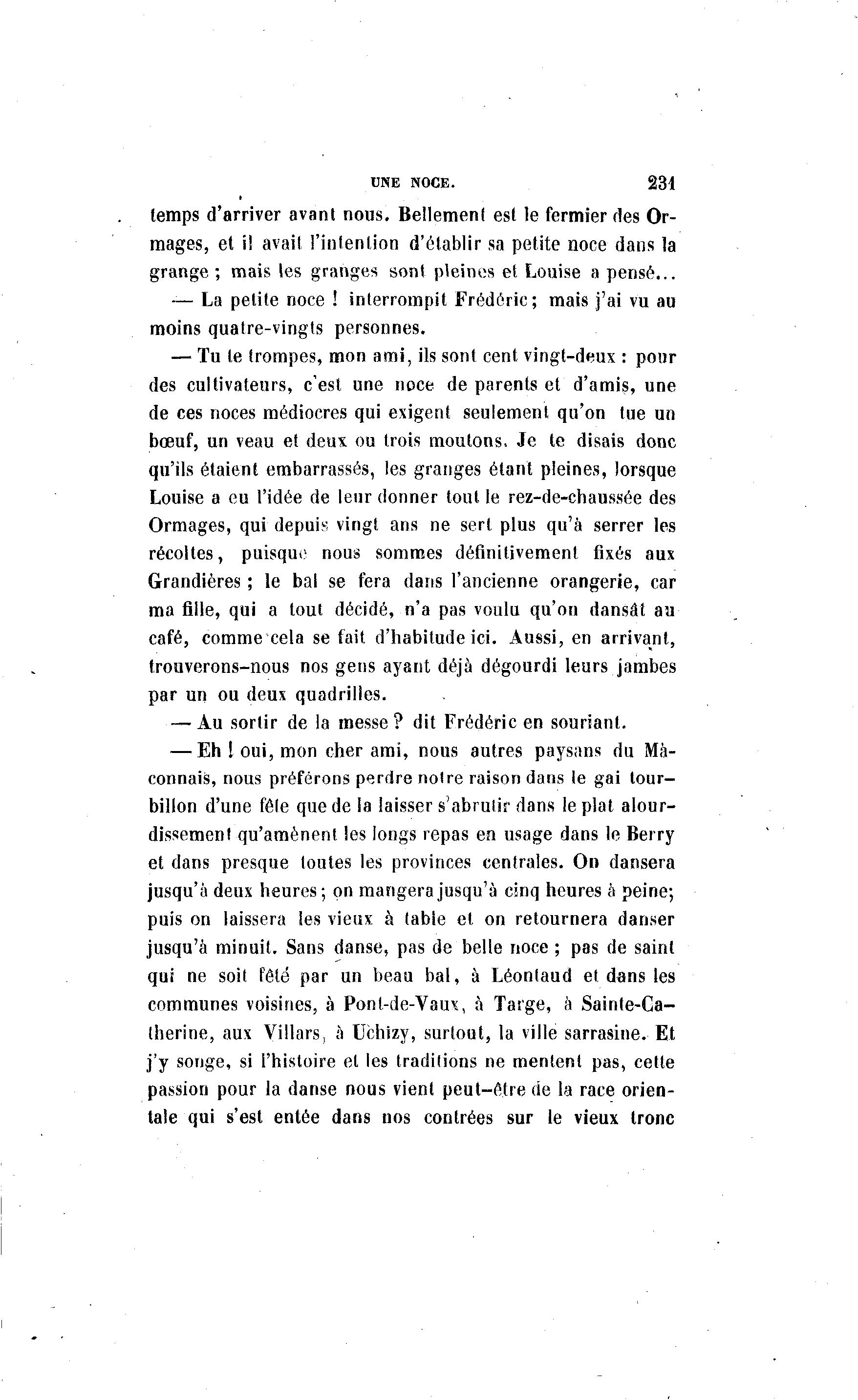 UNE NOCE. 231 temps d'arriver avant nous. Bellement est le fermier des Or- mages, et il avait l'intention d'établir sa petite noce dans la grange ; mais les granges sont pleines et Louise a pensé... — La petite noce ! interrompit Frédéric ; mais j'ai vu au moins quatre-vingts personnes. — Tu te trompes, mon ami, ils sont cent vingt-deux : pour des cultivateurs, c'est une noce de parents et d'amis, une de ces noces médiocres qui exigent seulement qu'on tue un bœuf, un veau et deux ou trois moutons. Je te disais donc qu'ils étaient embarrassés, les granges étant pleines, lorsque Louise a eu l'idée de leur donner tout le rez-de-chaussée des Ormages, qui depuis vingt ans ne sert plus qu'à serrer les récoltes, puisque nous sommes définitivement fixés aux Grandières ; le bal se fera dans l'ancienne orangerie, car ma fille, qui a tout décidé, n'a pas voulu qu'on dansât au café, comme cela se fait d'habitude ici. Aussi, en arrivant, trouverons-nous nos gens ayant déjà dégourdi leurs jambes par un ou deux quadrilles. — Au sortir de la messe ? dit Frédéric en souriant. — Eh t oui, mon cher ami, nous autres paysans du Ma- çonnais, nous préférons perdre notre raison dans le gai tour- billon d'une fêle que de la laisser s'abrutir dans le plat alour- dissement qu'amènent les longs repas en usage dans le Berry et dans presque toutes les provinces centrales. On dansera jusqu'à deux heures; on mangera jusqu'à cinq heures à peine; puis on laissera les vieux à table et on retournera danser jusqu'à minuit. Sans danse, pas de belle noce ; pas de saint qui ne soit fêlé par un beau bal, à Léontaud et dans les communes voisines, à Pont-de-Vaux, à Targe, à Sainte-Ca- therine, aux Villars, à Uchizy, surtout, la ville sarrasine. Et j'y songe, si l'histoire et les traditions ne mentent pas, cette passion pour la danse nous vient peut-être de la race orien- tale qui s'est entée dans nos contrées sur le vieux tronc