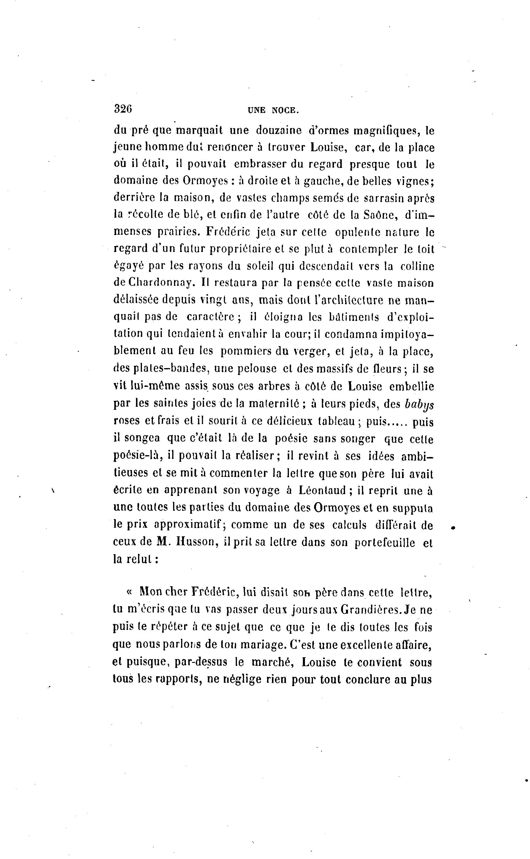320 UNE NOCE. du pré que marquait une douzaine d'ormes magnifiques, le jeune homme dut renoncer à trouver Louise, car, de la place où il était, il pouvait embrasser du regard presque tout le domaine des Ormoyes : à droite et à gauche, de belles vignes; derrière la maison, de vastes champs semés de sarrasin après la récolte de blé, et enfin de l'autre côté de la Saône, d'im- menses prairies. Frédéric jeta sur cette opulente nature le regard d'un futur propriétaire et se plut à contempler le toit égayé par les rayons du soleil qui descendait vers la colline de Chardonnay. Il restaura par la pensée cette vaste maison délaissée depuis vingt ans, mais dont l'architecture ne man- quait pas de caractère ; il éloigna les bâtiments d'exploi- tation qui tendaient à envahir la cour; il condamna impitoya- blement au feu les pommiers du verger, et jeta, à la place, des plates-bandes, une pelouse et des massifs de fleurs ; il se vit lui-même assis sous ces arbres a côté de Louise embellie par les saintes joies de la maternité ; à leurs pieds, des babys roses et frais et il sourit à ce délicieux tableau; puis puis il songea que c'était là de la poésie sans songer que cette poésie-là , il pouvait la réaliser; il revint à ses idées ambi- tieuses et se mita commenter la lettre que son père lui avait écrite en apprenant son voyage à Léonlaud ; il reprit une à une toutes les parties du domaine des Ormoyes et en supputa le prix approximatif; comme un de ses calculs différait de ceux de M. Husson, il prit sa lettre dans son portefeuille et la relut : « Mon cher Frédéric, lui disait soh père dans cette lettre, lu m'écris que lu vas passer deux jours aux Grandières. Je ne puis le répéter a ce sujet que ce que je le dis toutes les fois que nous parlons de ton mariage. C'est une excellente affaire, et puisque, par-dessus le marché, Louise le convient sous tous les rapports, ne néglige rien pour tout conclure au plus