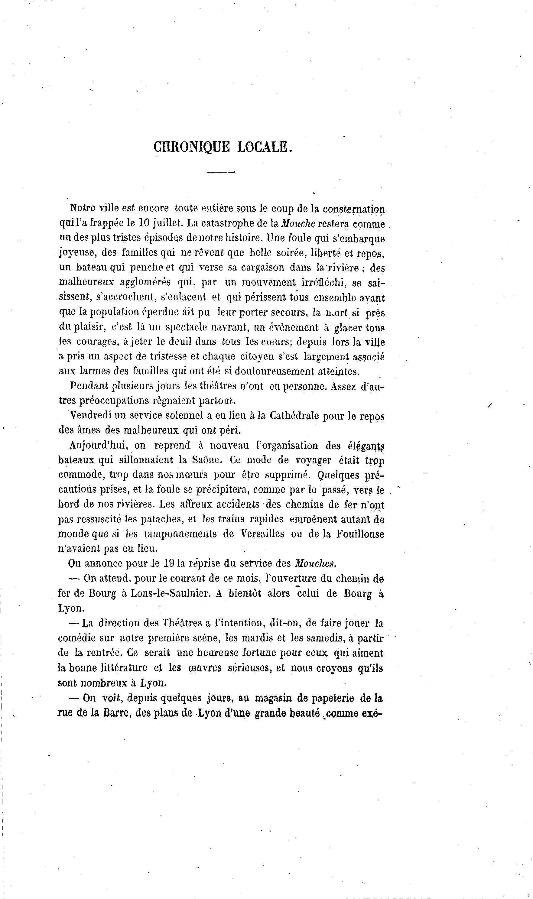 CHRONIQUE LOCALE. Notre ville est encore toute entière sous le coup de la consternation qui l'a frappée le 10 juillet. La catastrophe de la Mouche restera comme un des plus tristes épisodes de notre histoire. Une foule qui s'embarque joyeuse, des familles qui ne rêvent que belle soirée, liberté et repos, un bateau qui penche et qui verse sa cargaison dans larivière ; des malheureux agglomérés qui, par un mouvement irréfléchi, se sai- sissent, s'accrochent, s'enlacent et qui périssent tous ensemble avant que la population éperdue ait pu leur porter secours, la mort si près du plaisir, c'est là un spectacle navrant, un événement à glacer tous les courages, à jeter le deuil dans tous les cœurs; depuis lors la ville a pris un aspect de tristesse et chaque citoyen s'est largement associé aux larmes des familles qui ont été si douloureusement atteintes. Pendant plusieurs jours les théâtres n'ont eu personne. Assez d'au- tres préoccupations régnaient partout. Vendredi un service solennel a eu lieu à la Cathédrale pour le repos des âmes des malheureux qui ont péri. Aujourd'hui, on reprend à nouveau l'organisation des élégants bateaux qui sillonnaient la Saône. Ce mode de voyager était trpp commode, trop dans nos mœurs pour être supprimé. Quelques pré- cautions prises, et la foule se précipitera, comme par le passé, vers le bord de nos rivières. Les affreux accidents des chemins de fer n'ont pas ressuscité les pataches, et les trains rapides emmènent autant de monde que si les tamponnements de Versailles ou de la Fouillouse n'avaient pas eu lieu. On annonce pour Je 19 la reprise du service des Mouches. — On attend, pour le courant de ce mois, l'ouverture du chemin de fer de Bourg à Lons-le-Saulnier. A bientôt alors celui de Bourg à Lyon. — La direction des Théâtres a l'intention, dit-on, de faire jouer la comédie sur notre première scène, les mardis et les samedis, à partir de la rentrée. Ce serait une heureuse fortune pour ceux qui aiment la bonne littérature et les œuvres sérieuses, et nous croyons qu'ils sont nombreux à Lyon. — On voit, depuis quelques jours, au magasin de papeterie de la rue de la Barre, des plans de Lyon d'une grande beauté .comme exé-