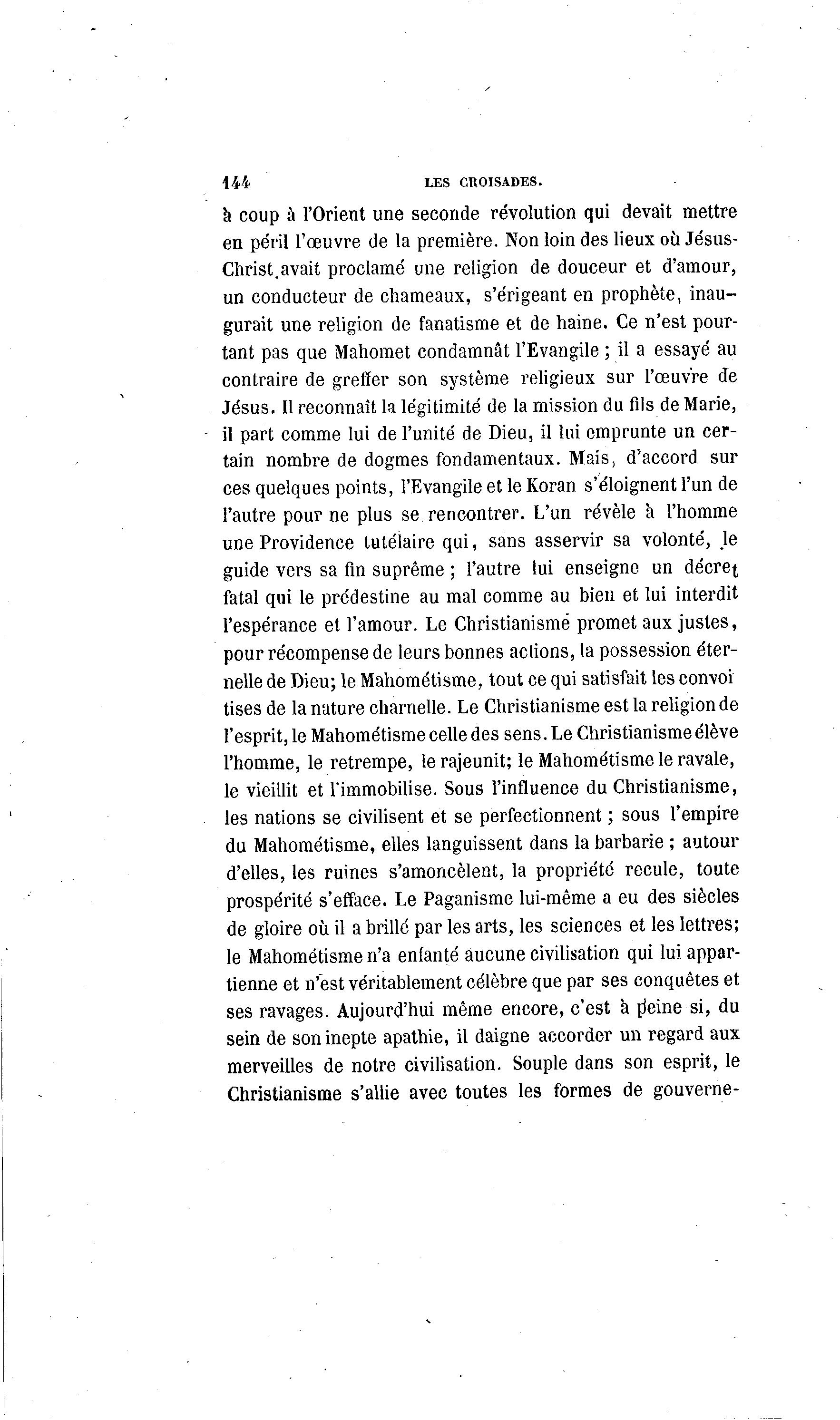 144 LES CROISADES. h coup à l'Orient une seconde révolution qui devait mettre en péril l'œuvre de la première. Non loin des lieux où Jésus- Christ.avait proclamé une religion de douceur et d'amour, un conducteur de chameaux, s'érigeant en prophète, inau- gurait une religion de fanatisme et de haine. Ce n'est pour- tant pas que Mahomet condamnât l'Evangile ; il a essayé au contraire de greffer son système religieux sur l'œuvre de Jésus. Il reconnaît la légitimité de la mission du fils de Marie, il part comme lui de l'unité de Dieu, il lui emprunte un cer- tain nombre de dogmes fondamentaux. Mais, d'accord sur ces quelques points, l'Evangile et le Koran s'éloignent l'un de l'autre pour ne plus se rencontrer. L'un révèle à l'homme une Providence tutélaire qui, sans asservir sa volonté, .le guide vers sa fin suprême ; l'autre lui enseigne un décret fatal qui le prédestine au mal comme au bien et lui interdit l'espérance et l'amour. Le Christianisme promet aux justes, pour récompense de leurs bonnes actions, la possession éter- nelle de Dieu; le Mahométisme, tout ce qui satisfait les convoi Uses de la nature charnelle. Le Christianisme est la religion de l'esprit, le Mahométisme celle des sens. Le Christianisme élève l'homme, le retrempe, le rajeunit; le Mahométisme le ravale, le vieillit et l'immobilise. Sous l'influence du Christianisme, les nations se civilisent et se perfectionnent ; sous l'empire du Mahométisme, elles languissent dans la barbarie ; autour d'elles, les ruines s'amoncèlent, la propriété recule, toute prospérité s'efface. Le Paganisme lui-même a eu des siècles de gloire où il a brillé par les arts, les sciences et les lettres; le Mahométisme n'a enfanté aucune civilisation qui lui appar- tienne et n'est véritablement célèbre que par ses conquêtes et ses ravages. Aujourd'hui même encore, c'est à pleine si, du sein de son inepte apathie, il daigne accorder un regard aux merveilles de notre civilisation. Souple dans son esprit, le Christianisme s'allie avec toutes les formes de gouverne-