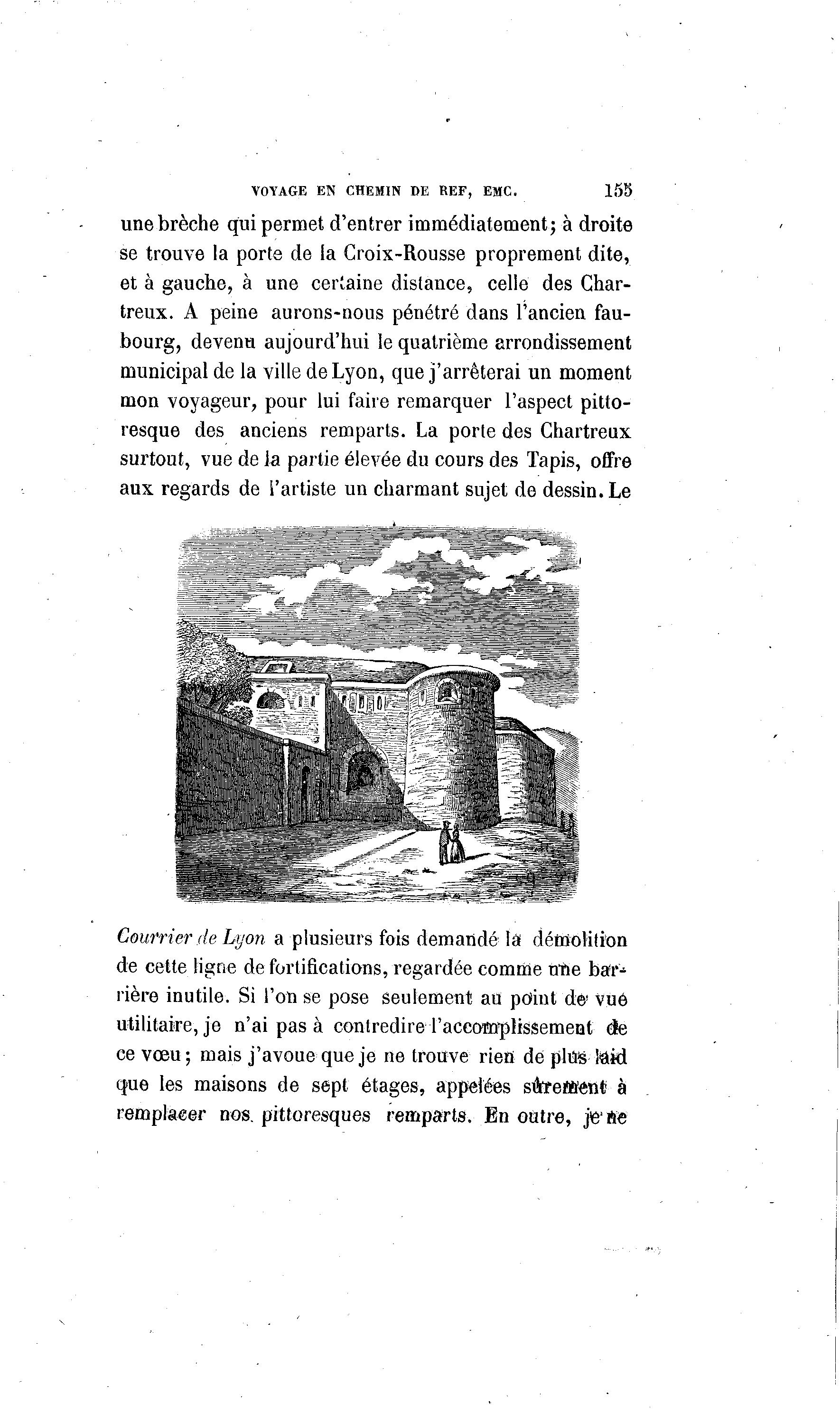 VOYAGE EN CHEMW DE REF, EMC. 155 une brèche qui permet d'entrer immédiatement; à droite se trouve la porte de la Croix-Rousse proprement dite, et à gauche, à une certaine distance, celle des Char- treux. A peine aurons-nous pénétré dans l'ancien fau- bourg, devenu aujourd'hui le quatrième arrondissement municipal de la ville de Lyon, que j'arrêterai un moment mon voyageur, pour lui faire remarquer l'aspect pitto- resque des anciens remparts. La porte des Chartreux surtout, vue de la partie élevée du cours des Tapis, offre aux regards de l'artiste un charmant sujet de dessin. Le Courrier de Lyon a plusieurs fois demandé là démolition de cette ligne de fortifications, regardée comme nue bar- rière inutile. Si l'on se pose seulement au pdiut dé' vue utilitaire, je n'ai pas à contredire TaceoffifpMssement de ce vœu; mais j'avoue que je ne trouve rien de plus laid que les maisons de sept étages, appelées stirfetttènt à remplacer nos. pittoresques remparts. En outre, je'ne