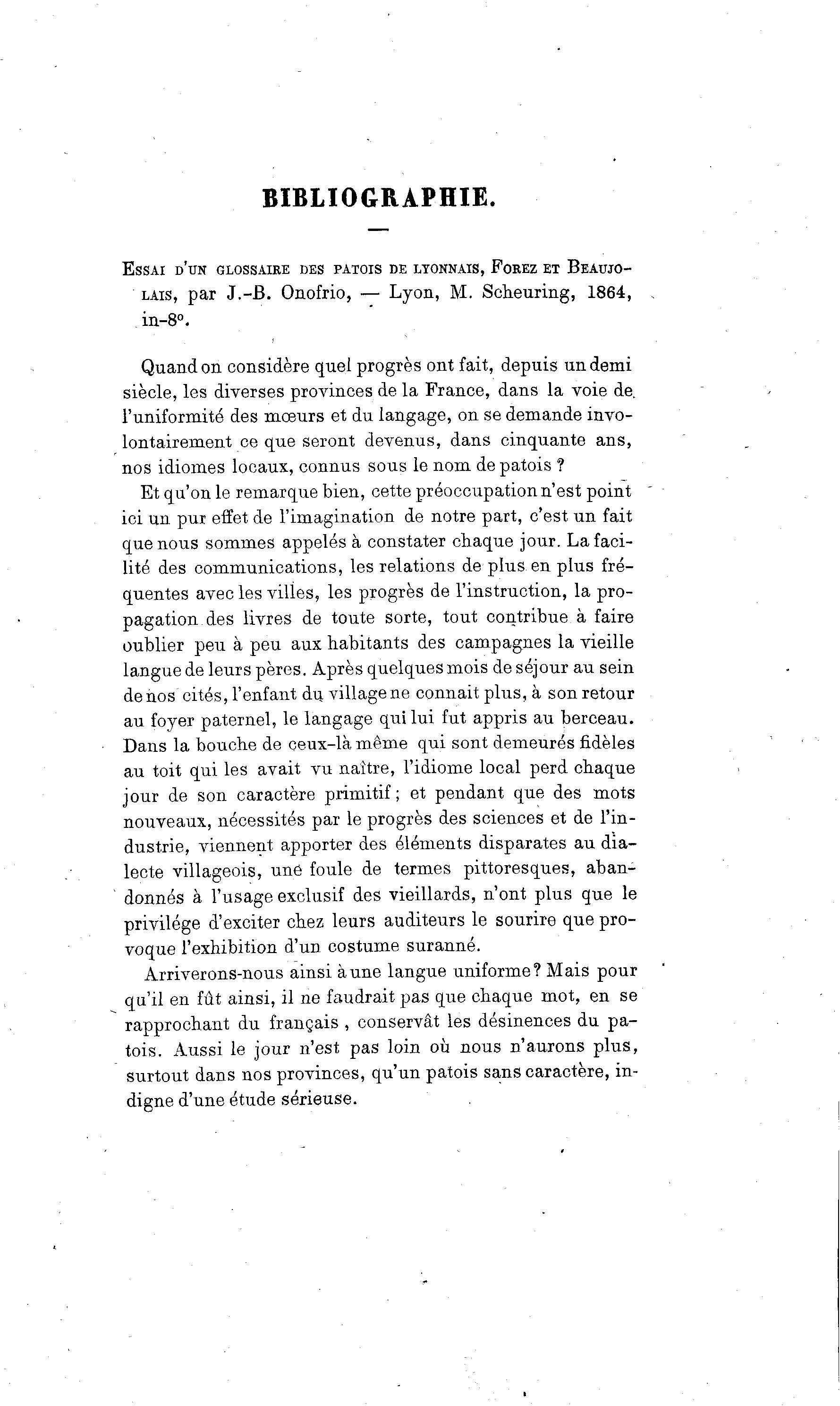 BIBLIOGRAPHIE. ESSAI D'UN GLOSSAIRE DES PATOIS DE LYONNAIS, FOREZ ET BEAUJO- LAIS, par J.-B. Onofrio, — Lyon, M. Scheuring, 1864, . in-8°. Quand on considère quel progrès ont fait, depuis un demi siècle, les diverses provinces de la France, dans la voie de. l'uniformité des mœurs et du langage, on se demande invo- lontairement ce que seront devenus, dans cinquante ans, nos idiomes locaux, connus sous le nom de patois ? Et qu'on le remarque bien, cette préoccupation n'est point ~ ici un pur effet de l'imagination de notre part, c'est un fait que nous sommes appelés à constater chaque jour. La faci- lité des communications, les relations de plus en plus fré- quentes avec les villes, les progrès de l'instruction, la pro- pagation des livres de toute sorte, tout contribue à faire oublier peu à peu aux habitants des campagnes la vieille langue de leurs pères. Après quelques mois de séjour au sein de nos cités, l'enfant du village ne connait plus, à son retour au foyer paternel, le langage qui lui fut appris au berceau. Dans la bouche de ceux-là même qui sont demeurés fidèles au toit qui les avait vu naître, l'idiome local perd chaque jour de son caractère primitif; et pendant que des mots nouveaux, nécessités par le progrès des sciences et de l'in- dustrie, viennent apporter des éléments disparates au dia- lecte villageois, une foule de termes pittoresques, aban- donnés à l'usage exclusif des vieillards, n'ont plus que le privilège d'exciter chez leurs auditeurs le sourire que pro- voque l'exhibition d'un costume suranné. Arriverons-nous ainsi aune langue uniforme? Mais pour qu'il en fût ainsi, il ne faudrait pas que chaque mot, en se rapprochant du français , conservât les désinences du pa- tois. Aussi le jour n'est pas loin où nous n'aurons plus, surtout dans nos provinces, qu'un patois sans caractère, in- digne d'une étude sérieuse.