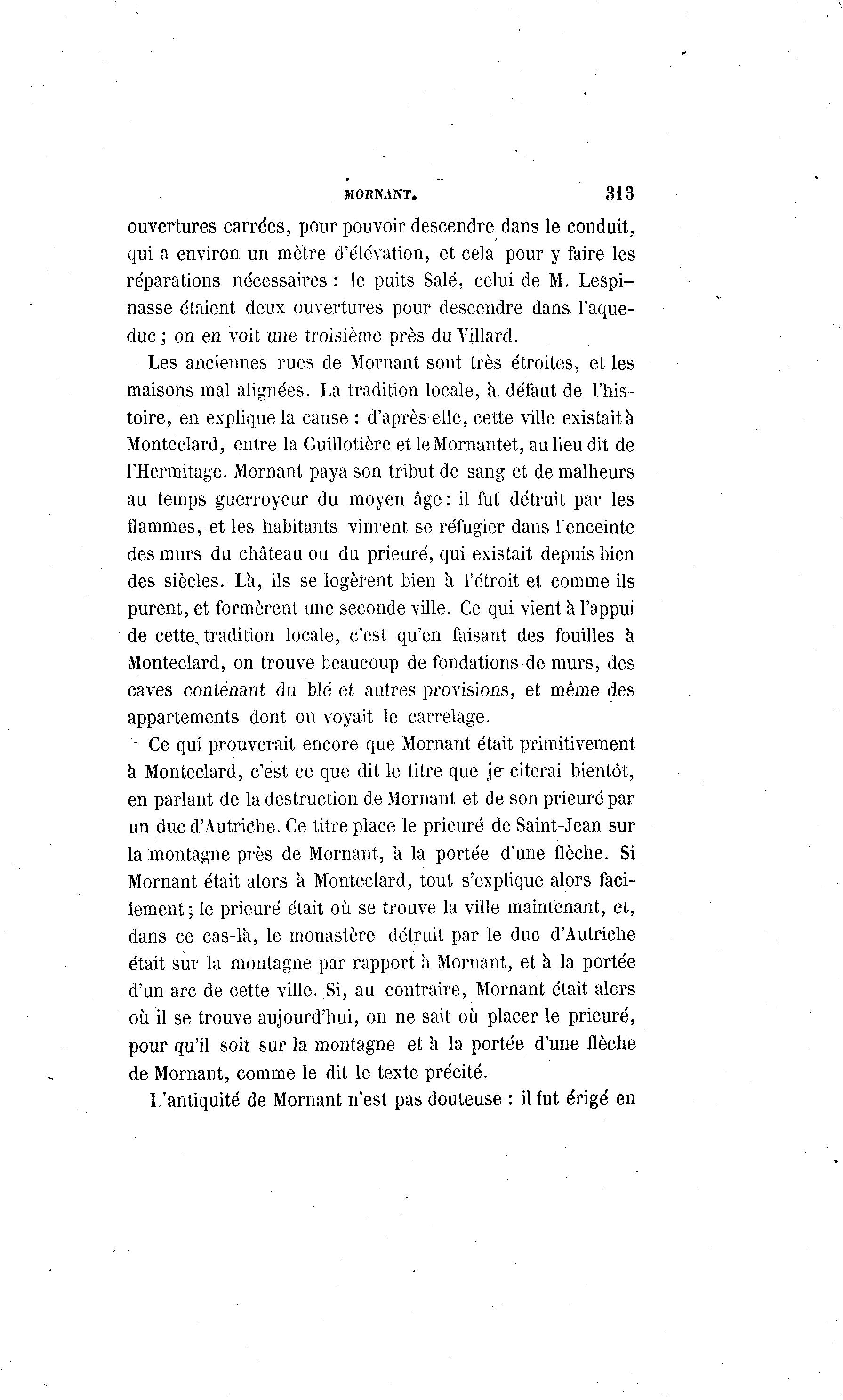 MORNANT. 313 ouvertures carrées, pour pouvoir descendre dans le conduit, qui a environ un mètre d'élévation, et cela pour y faire les réparations nécessaires : le puits Salé, celui de M. Lespi- nasse étaient deux ouvertures pour descendre dans, l'aque- duc ; on en voit une troisième près du Yillard. Les anciennes rues de Mornant sont très étroites, et les maisons mal alignées. La tradition locale, a défaut de l'his- toire, en explique la cause : d'après elle, cette ville existait à Monteclard, entre la Guillotière et leMornantet, au lieu dit de l'Hermitage. Mornant paya son tribut de sang et de malheurs au temps guerroyeur du moyen âge ; il fut détruit par les flammes, et les habitants vinrent se réfugier dans l'enceinte des murs du château ou du prieuré, qui existait depuis bien des siècles. La, ils se logèrent bien a l'étroit et comme ils purent, et formèrent une seconde ville. Ce qui vient a l'appui de cette, tradition locale, c'est qu'en faisant des fouilles a Monteclard, on trouve beaucoup de fondations de murs, des caves contenant du blé et autres provisions, et même des appartements dont on voyait le carrelage. - Ce qui prouverait encore que Mornant était primitivement a Monteclard, c'est ce que dit le titre que je citerai bientôt, en parlant de la destruction de Mornant et de son prieuré par un duc d'Autriche. Ce titre place le prieuré de Saint-Jean sur la montagne près de Mornant, a la portée d'une flèche. Si Mornant était alors a Monteclard, tout s'explique alors faci- lement ; le prieuré était où se trouve la ville maintenant, et, dans ce cas-là , le monastère détruit par le duc d'Autriche était sur la montagne par rapport à Mornant, et a la portée d'un arc de cette ville. Si, au contraire, Mornant était alors où il se trouve aujourd'hui, on ne sait où placer le prieuré, pour qu'il soit sur la montagne et à la portée d'une flèche de Mornant, comme le dit le texte précité. L'antiquité de Mornant n'est pas douteuse : il fut érigé en