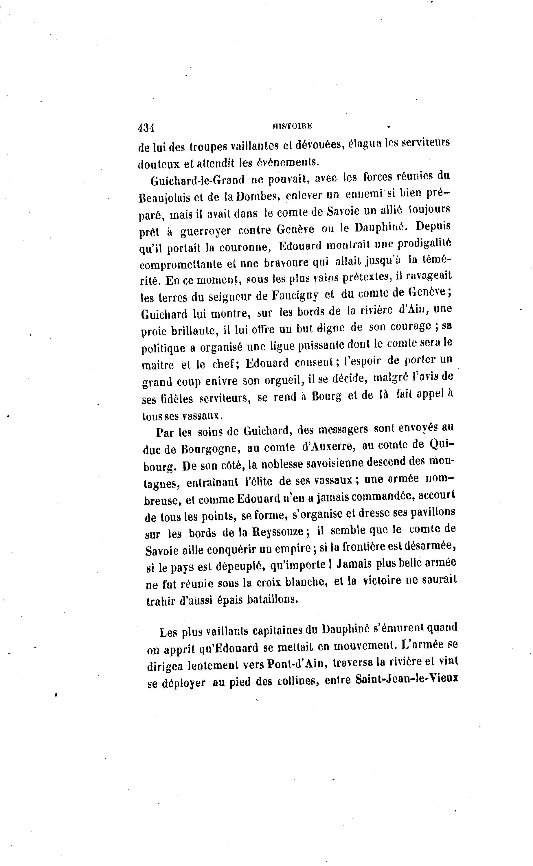 434 HIST01BE de lui des troupes vaillantes et dévouées, élagua les serviteurs douteux et attendit les événements. Guichard-le-Grand ne pouvait, avec les forces réunies du Beaujolais et de laDornbes, enlever un ennemi si bien pré- paré, mais il avait dans le comte de Savoie un allié toujours prêt à guerroyer contre Genève ou le Dauphiné. Depuis qu'il portait la couronne, Edouard montrait une prodigalité compromettante et une bravoure qui allait jusqu'à la témé- rité. En ce moment, sous les plus vains prétextes, il ravageait les terres du seigneur de Faucigny et du comte de Genève; Guichard lui montre, sur les bords de la rivière d'Ain, une proie brillante, il lui offre un but digne de son courage ; sa politique a organisé une ligue puissante dont le comte sera le maitre et le chef; Edouard consent ; l'espoir de porter un grand coup enivre son orgueil, il se décide, malgré l'avis de ses fidèles serviteurs, se rend a Bourg et de là fait appel à tousses vassaux. Par les soins de Guichard, des messagers sont envoyés au duc de Bourgogne, au comte d'Auxerre, au comte de Qui- bourg. De son côté, la noblesse savoisienne descend des mon- tagnes, entraînant l'élite de ses vassaux ; une armée nom- breuse, et comme Edouard n'en a jamais commandée, accourt de tous les points, se forme, s'organise et dresse ses pavillons sur les bords de la Reyssouze ; il semble que le comte de Savoie aille conquérir un empire ; si la frontière est désarmée, si le pays est dépeuplé, qu'importe ! Jamais plus belle armée ne fut réunie sous la croix blanche, et la victoire ne saurait trahir d'aussi épais bataillons. Les plus vaillants capitaines du Dauphiné s'émurent quand on apprit qu'Edouard se mettait en mouvement. L'armée se dirigea lentement vers Pont-d'Ain, traversa la rivière et vint se déployer au pied des collines, entre Saint-Jean-le-Vieux