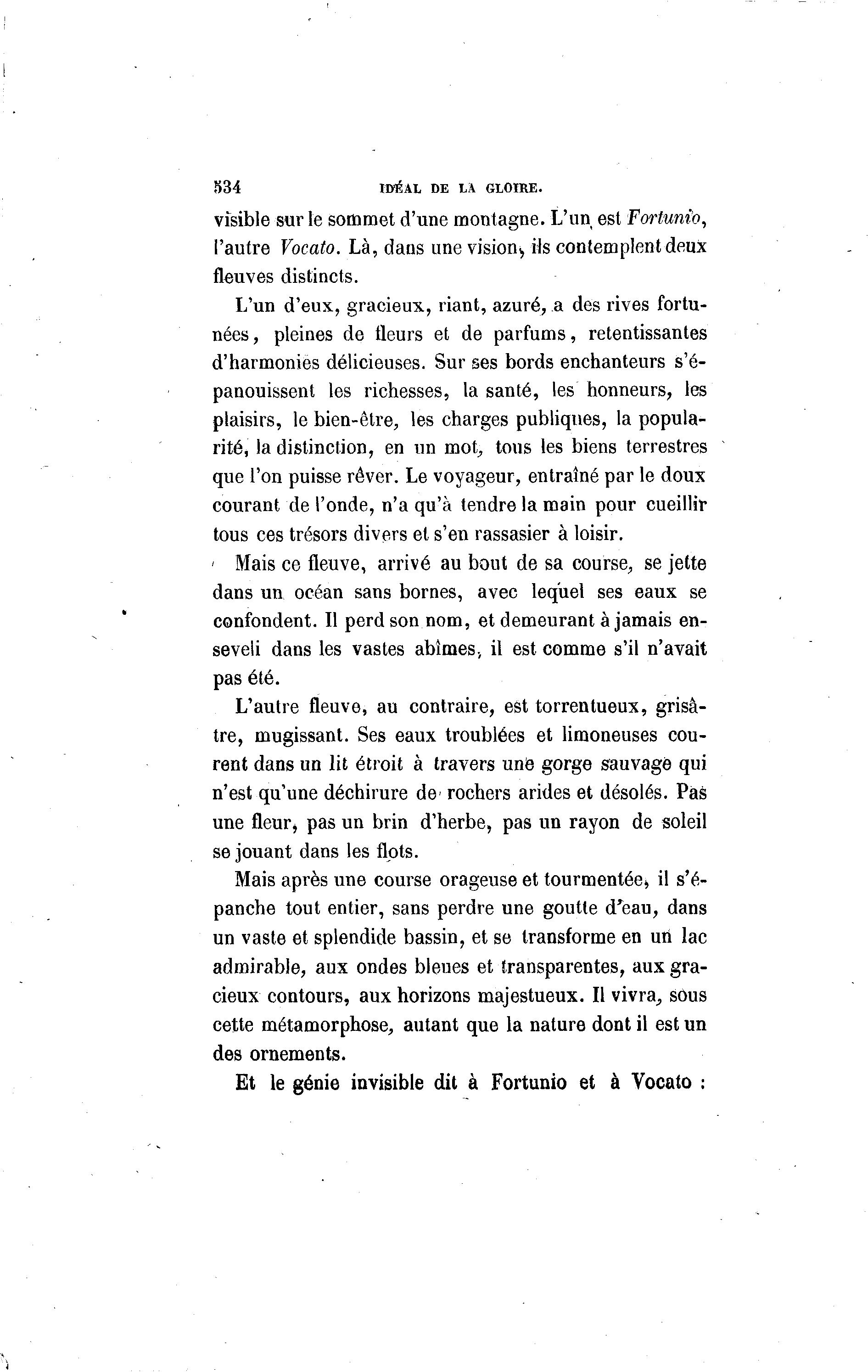 534 IDÉAL DE LA GLOIRE. visible sur le sommet d'une montagne. L'un est Fortuni'o, l'autre Vocato. Là , dans une vision,, ils contemplent deux fleuves distincts. L'un d'eux, gracieux, riant, azuré, a des rives fortu- nées, pleines de fleurs et de parfums, retentissantes d'harmonies délicieuses. Sur ses bords enchanteurs s'é- panouissent les richesses, la santé, les honneurs, les plaisirs, le bien-être, les charges publiques, la popula- rité, la distinction, en un mot, tous les biens terrestres que l'on puisse rêver. Le voyageur, entraîné par le doux courant de l'onde, n'a qu'à tendre la main pour cueillir tous ces trésors divers et s'en rassasier à loisir. - Mais ce fleuve, arrivé au bout de sa course, se jette dans un océan sans bornes, avec lequel ses eaux se confondent. Il perd son nom, et demeurant à jamais en- seveli dans les vastes abîmes., il est comme s'il n'avait pas été. L'autre fleuve, au contraire, est torrentueux, grisâ- tre, mugissant. Ses eaux troublées et limoneuses cou- rent dans un lit étroit à travers une gorge sauvage qui n'est qu'une déchirure de' rochers arides et désolés. Pas une fleur, pas un brin d'herbe, pas un rayon de soleil se jouant dans les flots. Mais après une course orageuse et tourmentée, il s'é- panche tout entier, sans perdre une goutte d'eau, dans un vaste et splendide bassin, et se transforme en uii lac admirable, aux ondes bleues et transparentes, aux gra- cieux contours, aux horizons majestueux. Il vivra, sous cette métamorphose, autant que la nature dont il est un des ornements. Et le génie invisible dit à Fortunio et à Vocato :