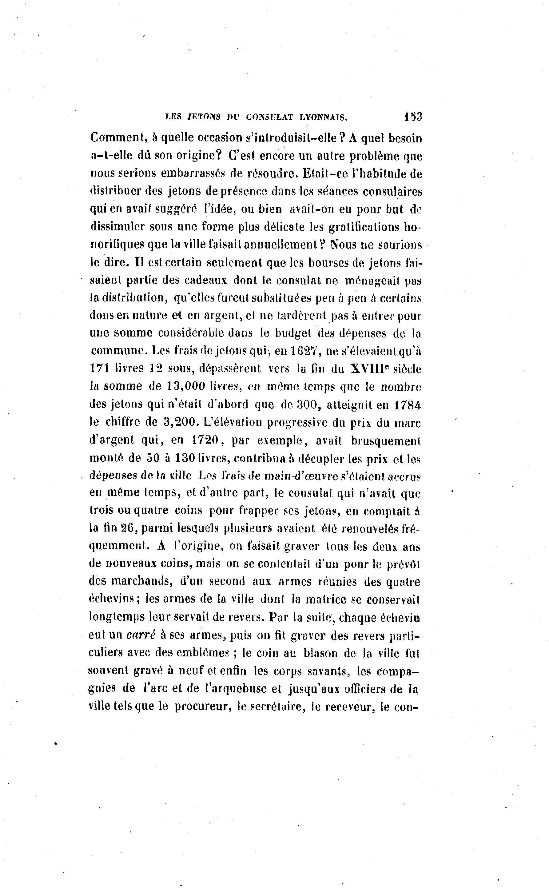 LES JETONS DU CONSULAT LYONNAIS. 153 Comment, à quelle occasion s'introduisit—elle ? A quel besoin a-t-elle dû son origine? C'est encore un autre problème que Mousserions embarrassés de résoudre. Etait-ce l'habitude de distribuer des jetons de présence dans les séances consulaires qui en avait suggéré l'idée, ou bien avait-on eu pour but de dissimuler sous une forme plus délicate les gratifications ho- norifiques que la ville faisait annuellement? Nous ne saurions le dire. Il est certain seulement que les bourses de jetons fai- saient partie des cadeaux dont le consulat ne ménageait pas la distribution, qu'elles fureut substituées peu à peu à certains dons en nature ei en argent, et ne tardèrent pas à entrer pour- une somme considérable dans le budget des dépenses de la commune. Les frais de jetons qui, en 1627, ne s'élevaienlqu'à 171 livres 12 sous, dépassèrent vers la fin du XVIII e siècle la somme de 13,000 livres, en môme temps que !e nombre des jetons qui n'était d'abord que de 300, atteignit en 1784 le chiffre de 3,200. L'élévation progressive du prix du marc d'argent qui, en 1720, par exemple, avait brusquement monté de 50 à 130 livres, contribua à décupler les prix et les dépenses de la sille Les frais de main-d'œuvre s'étaient accrus en même temps, et d'autre part, le consulat qui n'avait que trois ou quatre coins pour frapper ses jetons, en comptait à la fin 26, parmi lesquels plusieurs avaient été renouvelés fré- quemment. A l'origine, on faisait graver tous les deux ans de nouveaux coins, mais on se contentait d'un pour le prévôt des marchands, d'un second aux armes réunies des quatre échevins ; les armes de la ville dont la matrice se conservait longtemps leur servait de revers. Par la suite, chaque éehevio eut un carré à ses armes, puis on fit graver des revers parti- culiers avec des emblèmes ; le coin au blason de la ville fut souvent gravé à neuf et enfin les corps savants, les compa- gnies de l'arc et de l'arquebuse et jusqu'aux officiers de la ville tels que le procureur, le secrétaire, le receveur, le con-
