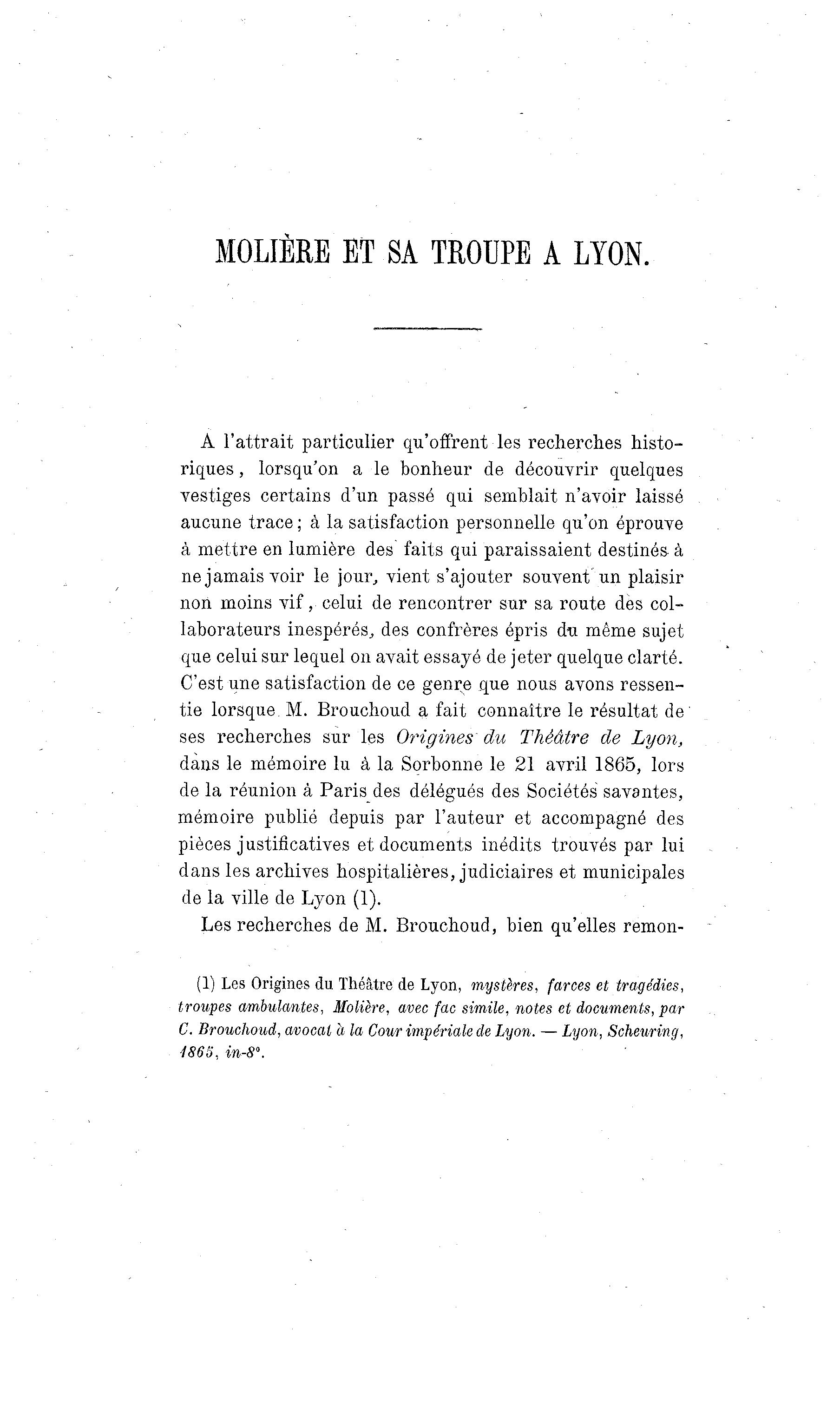 MOLIÈRE ET SA TROUPE A LYON. A l'attrait particulier qu'offrent les recherches histo- riques , lorsqu'on a le bonheur de découvrir quelques vestiges certains d'un passé qui semblait n'avoir laissé aucune trace ; à la satisfaction personnelle qu'on éprouve à mettre en lumière des faits qui paraissaient destinés à ne jamais voir le jour, vient s'ajouter souvent un plaisir non moins vif, celui de rencontrer sur sa route des col- laborateurs inespérés, des confrères épris du même sujet que celui sur lequel on avait essayé de jeter quelque clarté. C'est une satisfaction de ce genre que nous avons ressen- tie lorsque, M. Brouchoud a fait connaître le résultat de ses recherches sur les Origines du Théâtre de Lyon, dans le mémoire lu à la Sorbonne le 21 avril 1865, lors de la réunion à Paris des délégués des Sociétés savantes, mémoire publié depuis par l'auteur et accompagné des pièces justificatives et documents inédits trouvés par lui dans les archives hospitalières, judiciaires et municipales de la ville de Lyon (1). Les recherches de M. Brouchoud, bien qu'elles remon- (1) Les Origines du Théâtre de Lyon, mystères, farces et tragédies, troupes ambulantes, Molière, avec fac simile, notes et documents, par C. Brouchoud, avocat à la Cour impériale de Lyon. — Lyon, Scheuring, •186S, in-S'.