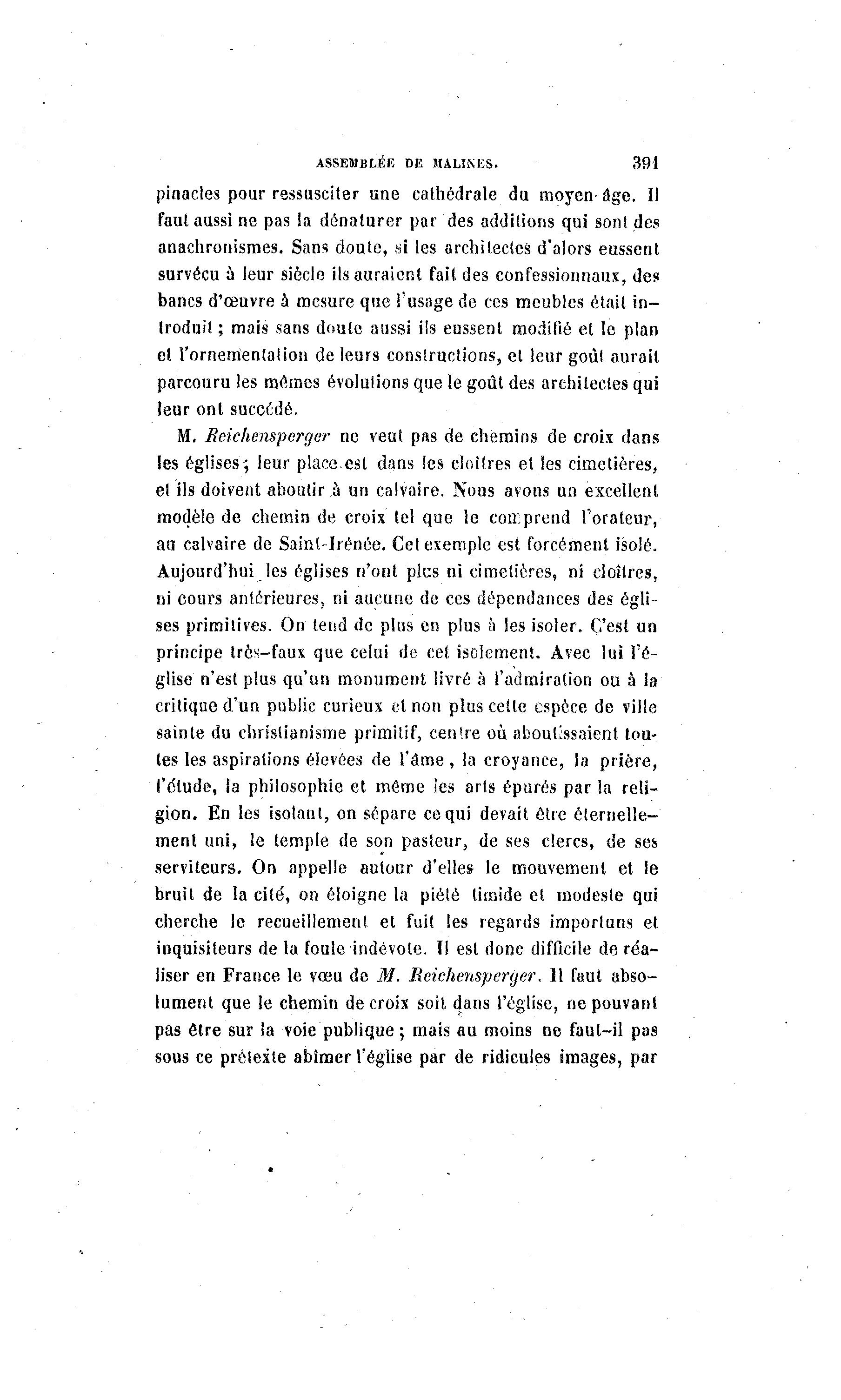 ASSEMBLÉE DE MALIKKS. 391 pinacles pour ressusciter une cathédrale du moyen- âge. Il faut aussi ne pas la dénaturer par des additions qui sont des anachronismes. Sans doute, si les architectes d'alors eussent survécu à leur siècle ils auraient fait des confessionnaux, des bancs d'œuvre à mesure que l'usage de ces meubles était in- troduit ; mais sans doute aussi ils eussent modifié et le plan et l'ornementation de leurs constructions, et leur goût aurait parcouru les mêmes évoluions que le goût des architectes qui leur ont succédé. M. Reichensperger ne veut pas de chemins de croix dans les églises; leur place est dans les cloîtres et les cimetières, et ils doivent aboutir à un calvaire. Nous avons un excellent modèle de chemin de croix tel que le cottprend l'orateur, au calvaire de SamMrénée. Cet exemple est forcément isolé. Aujourd'hui les églises n'ont ptes ni cimetières, ni cloîtres, ni cours antérieures, ni aucune de ces dépendances des égli- ses primitives. On tend de plus en plus h les isoler. C'est un principe très-faux que celui de cet isolement. Avec lui l'é- glise n'est plus qu'un monument livré à l'admiration ou à la critique d'un public curieux et non plus cette espèce de ville sainte du christianisme primitif, centre où aboutissaient tou- tes les aspirations élevées de l'âme , la croyance, la prière, l'élude, la philosophie et même Ses arts épurés par la reli- gion. En les isolant, on sépare ce qui devait être éternelle- ment uni, le temple de son pasteur, de ses clercs, de ses serviteurs. On appelle autour d'elles le mouvement et le bruit de la cité, on éloigne la piété timide et modeste qui cherche le recueillement et fuit les regards importuns et inquisiteurs de la foule indévote. Il est donc difficile de réa- liser en France le vœu de M. Reichensperger. 11 faut abso- lument que le chemin de croix soit dans l'église, ne pouvant pas être sur la voie publique ; mais au moins ne faut-il pas sous ce prétexte abîmer l'église par de ridicules «mages, par