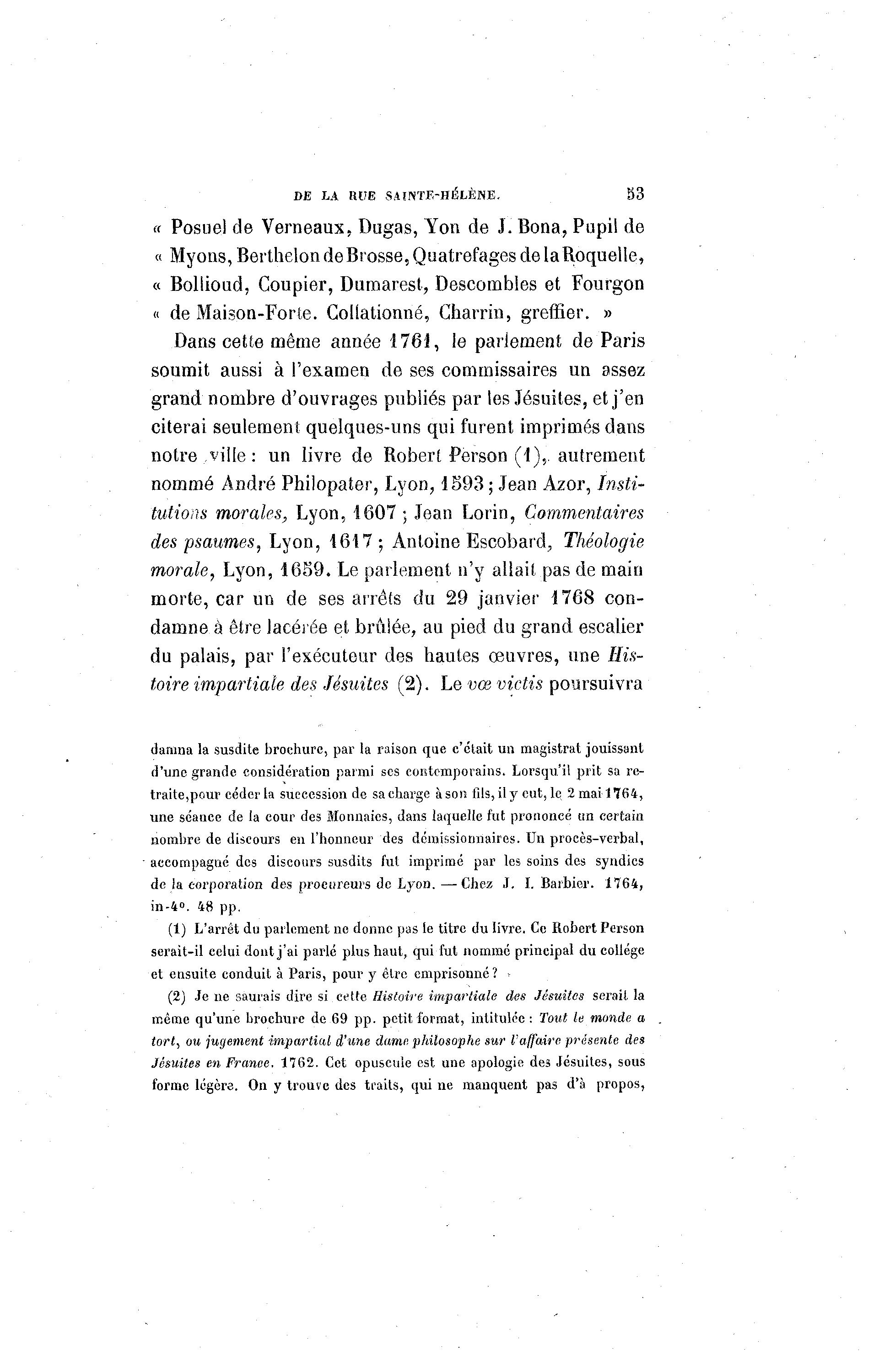 DE LA HUE SAINTE-HÉLÈNE. 83 « Posuel de Verneaux, Dugas, Yon de J. Bona, Pupil de « Myons,BerthelondeBrosse,QuatrefagesdeIaRoquelle, « Bollioud, Coupier, Dumarest, Descombles et Fourgon « de Maison-Forte. Collationné, Charrin, greffier. » Dans cette même année 1764, le parlement de Paris soumit aussi à l'examen de ses commissaires un assez grand nombre d'ouvrages publiés par les Jésuites, et j'en citerai seulement quelques-uns qui furent imprimés dans notre ville : un livre de Robert Person (1),. autrement nommé André Philopater, Lyon, 1593 ; Jean Àzor, Insti- tutions morales, Lyon, 1607 ; Jean Lorin, Commentaires des psaumes, Lyon, 1617; Antoine Escobard, Théologie morale, Lyon, 1659. Le parlement n'y allait pas de main morte, car un de ses arrêts du 29 janvier 1768 con- damne à être lacérée et brûlée, au pied du grand escalier du palais, par l'exécuteur des hautes œuvres, une His- toire impartiale des Jésuites (2). Le vœ victis poursuivra damna la susdite brochure, par la raison que c'était un magistrat jouissant d'une grande considération parmi ses contemporains. Lorsqu'il prit sa re- traite,pour céder la succession de sa charge à son fils, il y eut, le 2 mai 1764, une séauce de la cour des Monnaies, dans laquelle fut prononcé un certain nombre de discours en l'honneur des démissionnaires. Un procès-verbal, accompagné des discours susdits fut imprimé par les soins des syndics de la corporation des procureurs de Lyon.—Chez J. I. Barbier. 1764, in-4°. 48 pp. (1) L'arrêt du parlement ne donne pas le titre du livre. Ce Robert Person serait-il celui dont j'ai parlé plus haut, qui fut nommé principal du collège et ensuite conduit à Paris, pour y être emprisonné? (2) Je ne saurais dire si cette Histoire impartiale des Jésuites serait la même qu'une brochure de 69 pp. petit format, intitulée : Tout te monde a tort, ou jugement impartial d'une dame philosophe sur l'affaire présente des Jésuites en France. 1762. Cet opuscule est une apologie des Jésuites, sous forme légère. On y trouve des traits, qui ne manquent pas d'à propos,