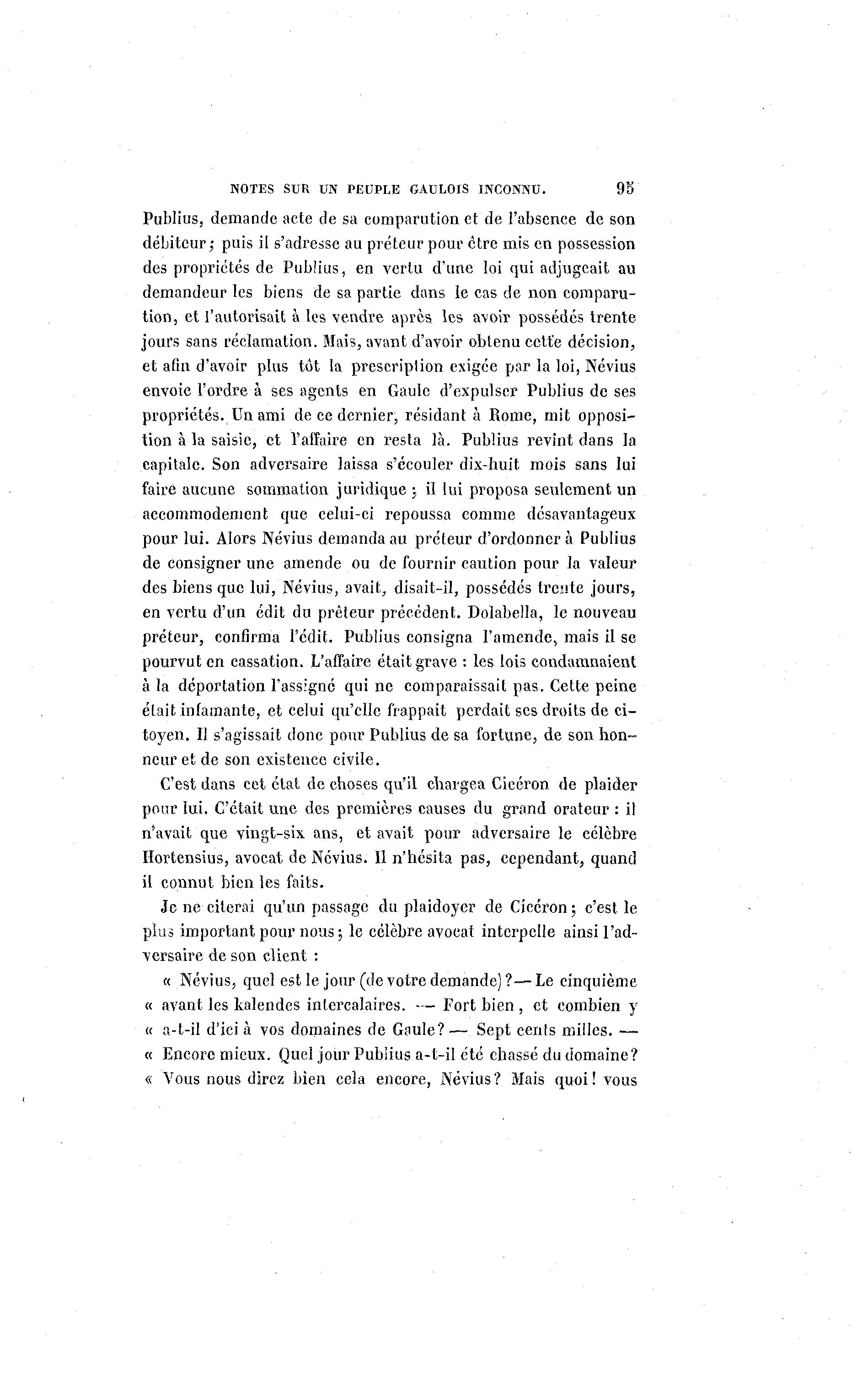 NOTES SUR UN PEUPLE GAULOIS INCONNU. 95 Publius, demande acte de sa comparution et de l'absence de son débiteur,- puis il s'adresse au préteur pour être mis en possession des propriétés de Publius, en vertu d'une loi qui adjugeait au demandeur les biens de sa partie dans le cas de non comparu- tion, et l'autorisait à les vendre après les avoir possédés trente jours sans réclamation. Mais, avant d'avoir obtenu cette décision, et afin d'avoir plus tôt la prescriplion exigée par la loi, Névius envoie l'ordre à ses agents en Gaule d'expulser Publius de ses propriétés. Un ami de ce dernier, résidant à Rome, mit opposi- tion à la saisie, et l'affaire en resta là . Publius revint dans la capitale. Son adversaire laissa s'écouler dix-huit mois sans lui faire aucune sommation juridique ; il lui proposa seulement un accommodement que celui-ci repoussa comme désavantageux pour lui. Alors Névius demanda au préteur d'ordonner à Publius de consigner une amende ou de fournir caution pour la valeur des biens que lui, Névius, avait, disait-il, possédés trente jours, en vertu d'un édit du prêteur précédent. Dolabella, le nouveau préteur, confirma l'édit. Publius consigna l'amende, mais il se pourvut en cassation. L'affaire était grave : les lois condamnaient à la déportation l'assigné qui ne comparaissait pas. Cette peine était infamante, et celui qu'elle frappait perdait ses droits de ci- toyen. Il s'agissait donc pour Publius de sa fortune, de son hon- neur et de son existence civile. C'est dans cet état de choses qu'il chargea Cicéron de plaider pour lui. C'était une des premières causes du grand orateur : il n'avait que vingt-six ans, et avait pour adversaire le célèbre Hortensius, avocat de Névius. Il n'hésita pas, cependant, quand il connut bien les faits. Je ne citerai qu'un passage du plaidoyer de Cicéron ; c'est le plus important pour nous; le célèbre avocat interpelle ainsi l'ad- versaire de son client : « Névius, quel est le jour (de votre demande) ?— Le cinquième « avant les kalendes intercalaires. — Fort bien , et combien y « a-t-il d'ici à vos domaines de Gaule? — Sept cents milles. — « Encore mieux. Quel jour Pubiius a-t-il été chassé du domaine? « Vous nous direz bien cela encore, Névius? Mais quoi! vous