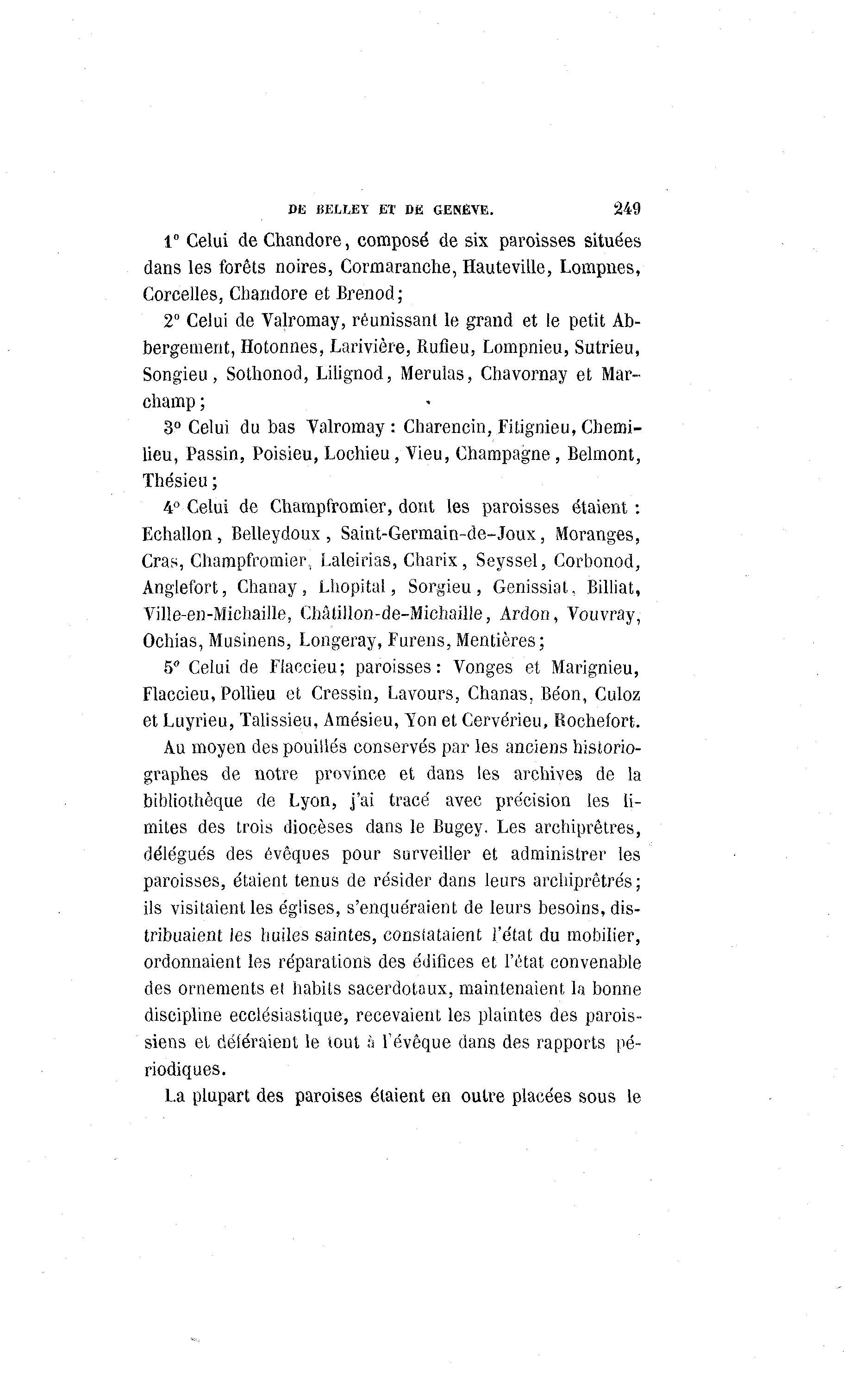 DE BE1XEY ET DE GENÈVE. 249 1° Celui de Chandore, composé de six paroisses situées dans les forêts noires, Cormaranche, Hauteville, Lompnes, Corcelles, Chandore et Brenod; 2" Celui de Valromay, réunissant le grand et le petit Ab- bergement, Hotonnes, Larivière, Rufieu, Lompnieu, Sutrieu, Songieu, Sothonod, Lilignod, Merulas, Chavornay et Mar- champ ; 3° Celui du bas Yalromay : Charencin, Fitignieu,Chemi- lieu, Passin, Poisieu, Lochieu, Vieu, Champagne , Belmont, Thésieu ; 4° Celui de Champfromier, dont les paroisses étaient : Echallon, Belleydoux , Saint-Germain-de-Joux, Moranges, Cras, Champfromier, Laleirias, Charix, Seyssel, Corbonod, Anglefort, Chanay, Lhopital, Sorgieu, Genissiat, Billiat, Ville-en-Michaille, Châtillon-de-Michaille, Ardon, Vouvray, Ochias, Musinens, Longeray, Furens, Mentières; 5" Celui de Flaccieu; paroisses: Vonges et Marignieu, Flaccieu, Pollieu et Cressin, Lavours, Chanas, Béon, Cuioz et Luyrieu, Talissieu, Amésieu, Yon et Cervérieu, Rochefort. Au moyen des pouillés conservés par les anciens historio- graphes de notre province et dans les archives de la bibliothèque de Lyon, j'ai tracé avec précision les li- mites des trois diocèses dans le Bugey. Les archiprêtres, délégués des évoques pour surveiller et administrer les paroisses, étaient tenus de résider dans leurs archiprêtres; ils visitaient les églises, s'enquéraient de leurs besoins, dis- tribuaient les huiles saintes, constataient l'état du mobilier, ordonnaient les réparations des édifices et l'état convenable des ornements et habits sacerdotaux, maintenaient la bonne discipline ecclésiastique, recevaient les plaintes des parois- siens et déféraient le tout à Tévêque dans des rapports pé- riodiques. La plupart des paroises étaient en outre placées sous le