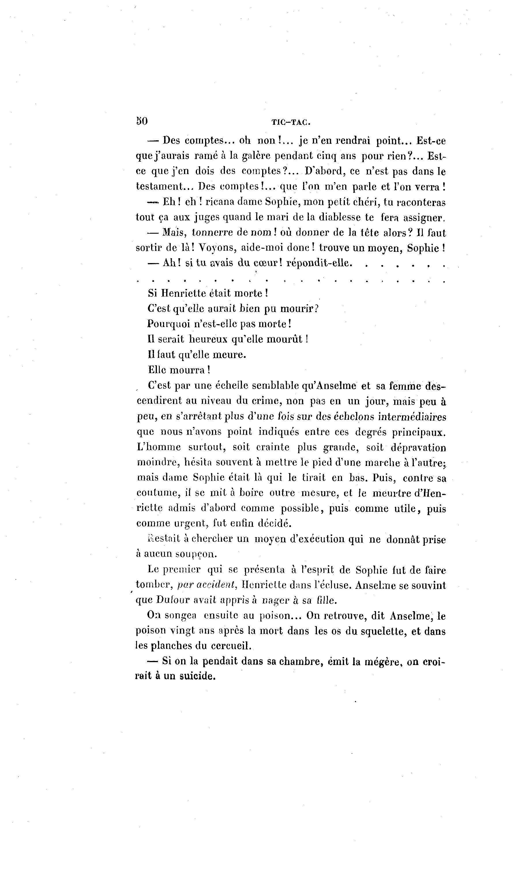 50 TIC-TAC. — Des comptes... oh n o n ! . . . je n'en rendrai point... Est-ce que j'aurais ramé à la galère pendant cinq ans pour rien?... Est- ce que j'en dois des comptes?... D'abord, ce n'est pas dans le testament... Des comptes!... que l'on m'en parle et l'on verra ! — Eh ! eh ! ricana dame Sophie, mon petit chéri, tu raconteras tout ça aux juges quand le mari de la diablesse te fera assigner. — Mais, tonnerre de nom ! où donner de la tête alors? Il faut sortir de là ! Voyons, aide-moi donc! trouve un moyen, Sophie ! — Ah ! si tu avais du cœur ! répondit-elle , . Si Henriette était morte ! C'est qu'elle aurait bien pu mourir? Pourquoi n'est-elle pas morte ! Il serait heureux qu'elle mourût ! Il laut qu'elle meure. Elle mourra ! C'est par une échelle semblable qu'Anselme et sa femme des- cendirent au niveau du crime, non pas en un jour, mais peu à peu, en s'arrêtant plus d'une fois sur des échelons intermédiaires que nous n'avons point indiqués entre ces degrés principaux. L'homme surtout, soit crainte plus grande, soit dépravation moindre, hésita souvent à mettre le pied d'une marche à l'autre; mais dame Sophie était là qui le tirait en bas. Puis, contre sa coutume, il se mit à boire outre mesure, et Je meurtre d'Hen- riette admis d'abord comme possible, puis comme utile, puis comme urgent, fut enfin décidé. Restait à chercher un moyen d'exécution qui ne donnât prise à aucun soupçon. Le premier qui se présenta à l'esprit de Sophie fut de faire tomber, par accident, Henriette dans l'écluse. Anselme se souvint que Dufour avait appris à nager à sa fille. On songea ensuite au poison... On retrouve, dit Anselme, le poison vingt ans après la mort dans les os du squelette, et dans les planches du cercueil. — Si on la pendait dans sa chambre, émit la mégère, on croi- rait à un suicide.