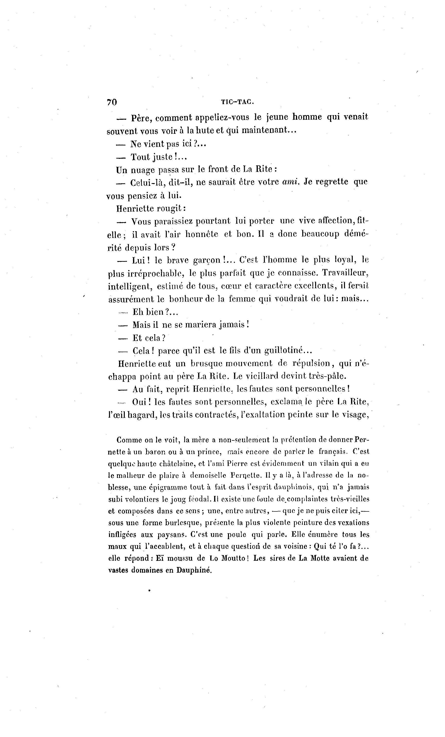 70 TIC-TAC. — Père, comment appeliez-vous le jeune homme qui venait souvent vous voir à l a h u t e e t qui maintenant... — Ne vient pas ici?... — Tout juste !... Un nuage passa sur le front de La Rite : — Celui-là , dit-il, ne saurait être votre ami. Je regrette que vous pensiez à lui. Henriette rougit : — Vous paraissiez pourtant lui porter une vive affection, fit- elle ; il avait l'air honnête et bon. Il a donc beaucoup démé- rité depuis lors? — Lui! le brave garçon!... C'est l'homme le plus loyal, le plus irréprochable, le plus parfait que je connaisse. Travailleur, intelligent, estimé de tous, cœur et caractère excellents, il fers il. assurément le bonheur de la femme qui voudrait de lui: mais... — Eh bien?... — Mais il ne se mariera jamais I — Et cela ? — Cela! parce qu'il est le fils d'un guillotiné... Henriette eut un brusque mouvement de, répulsion, qui n'é- chappa point au père La Rite. Le vieillard devint très-pâle. — Au fait, reprit Henriette, les fautes sont personnelles! — Oui! les fautes sont personnelles, exclama le père La Rite, l'œil hagard, les traits contractés, l'exaltation peinte sur le visage, Comme on le voit, la mère a non-seulement la prétention de donner Per- nette à un baron ou à un prince, mais encore de parler le français. C'est quelque haute châtelaine, et l'ami Pierre est évidemment un vilain qui a en le malheur de plaire à demoiselle Pernelte. Il y a là , à l'adresse de la no- blesse, une cpigramme tout à fait dans l'esprit dauphinois, qui n'a jamais subi volontiers le joug féodal. Il existe une foule dc.complaintes très-vieilles et composées dans ce sens ; une, entre autres, — que je ne puis citer ici,— sous une forme burlesque, présente la plus violente peinture des vexalions infligées aux paysans. C'est une poule qui parle. Elle énumère tous les maux qui l'accablent, et à chaque question de sa voisine : Qui té l'o fa?... elle répond : Eï moussu de Lo Moutto ! Les sires de La Motte avaient de vastes domaines en Dauphiné.
