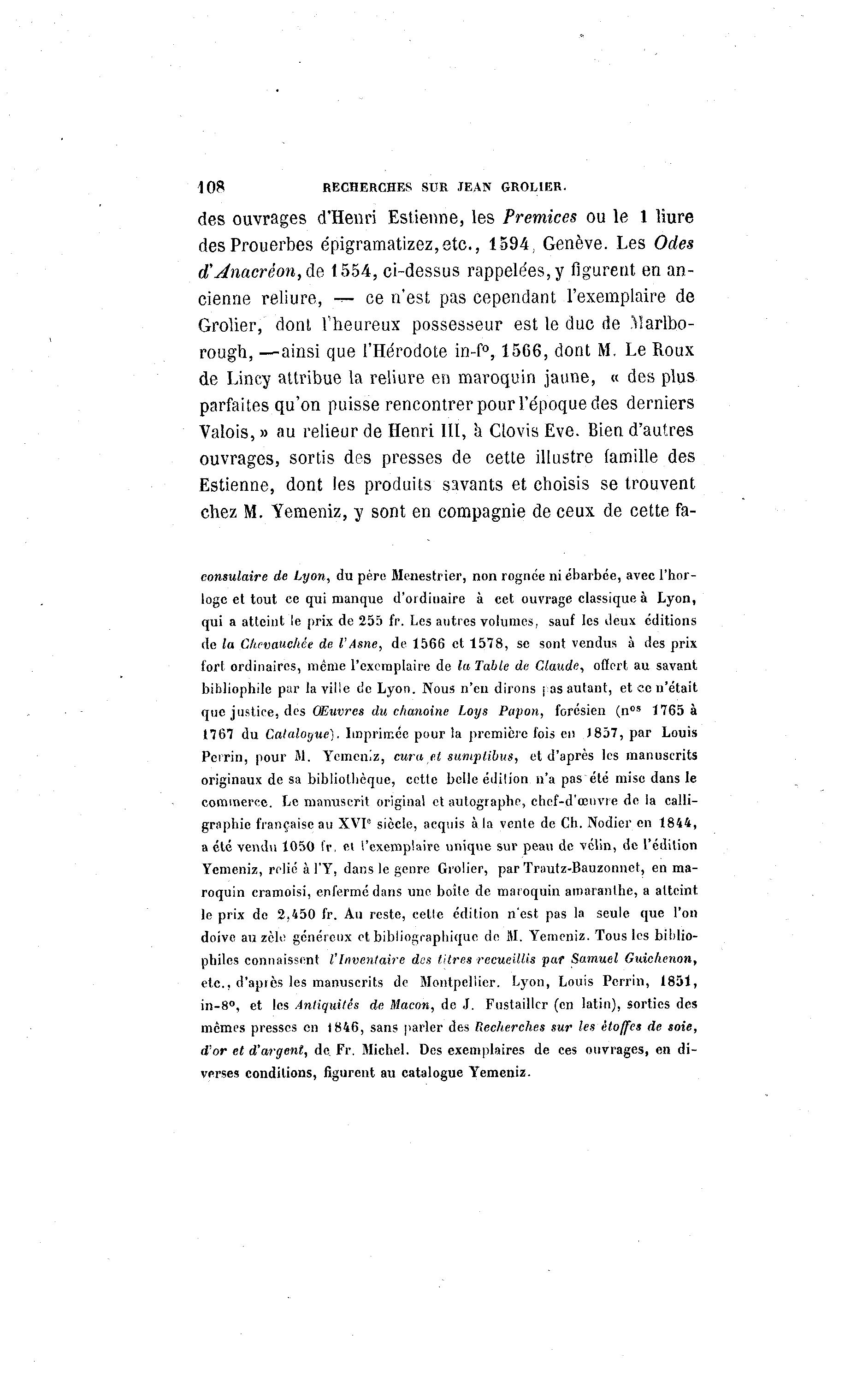 108 RECHERCHES SDR JEAN GROLIER. des ouvrages d'Henri Estienne, les Prémices ou le 1 liure desProuerbes épigramatizez,etc, 1594 Genève. Les Odes d'J[nacrèon,à Q 1554, ci-dessus rappelées, y figurent en an- cienne reliure, — ce n'est pas cependant l'exemplaire de Grolier, dont l'heureux possesseur est le duc de .Marlbo- rough, —ainsi que l'Hérodote in-f°, 1566, dont M. Le Roux de Lincy attribue la reliure en maroquin jaune, « des plus parfaites qu'on puisse rencontrer pour l'époque des derniers Valois, » au relieur de Henri III, à Clovis Eve. Bien d'autres ouvrages, sortis des presses de cette illustre famille des Estienne, dont les produits savants et choisis se trouvent chez M. Yemeniz, y sont en compagnie de ceux de cette fa- consulaire de Lyon, du père Menestrier, non rognée ni ébarbée, avec l'hor- loge et tout ce qui manque d'ordinaire à cet ouvrage classique à Lyon, qui a atteint le prix de 25a fr. Les autres volumes, sauf les deux éditions de la Chevauchée de l'Asne, de 1566 et 1578, se sont vendus à des prix fort ordinaires, même l'exemplaire de la Table de Claude, offert au savant bibliophile par la ville de Lyon. Nous n'eu dirons j as autant, et ce n'était que justice, des Œuvres du chanoine Loys Papon, forésien (n os 1765 à 1767 du Catalogue). Imprimée pour la première fois en J857, par Louis Perrin, pour M. Yemeniz, cura et suniplibus, et d'après les manuscrits originaux de sa bibliothèque, cette belle édition n'a pas été mise dans le commerce. Le manuscrit original et autographe, chef-d'œuvre de la calli- graphie française au XVIe siècle, acquis à la vente de Ch. Nodier en 1844, a été vendu 1050 fr, et l'exemplaire unique sur peau de vélin, de l'édition Yemeniz, relié à l'Y, dans le genre Grolier, par Trautz-Bauzonnet, en ma- roquin cramoisi, enfermé dans une boîle de maroquin amaranlhe, a atteint le prix de 2,450 fr. Au reste, celle édition n'est pas la seule que l'on doive au zèle généreux et bibliographique de M. Yemeniz. Tous les biblio- philes connaissent l'Inventaire des titres recueillis par Samuel Guichenon, etc., d'après les manuscrits de Montpellier. Lyon, Louis Perrin, 1851, in-8°, et les Antiquités de Maçon, de J. Fustaillcr (en latin), sorties des mêmes presses en 1846, sans parler des Recherches sur les étoffes de soie, d'or et d'argent, de Fr. Michel. Des exemplaires de ces ouvrages, en di- verses conditions, figurent au catalogue Yemeniz.